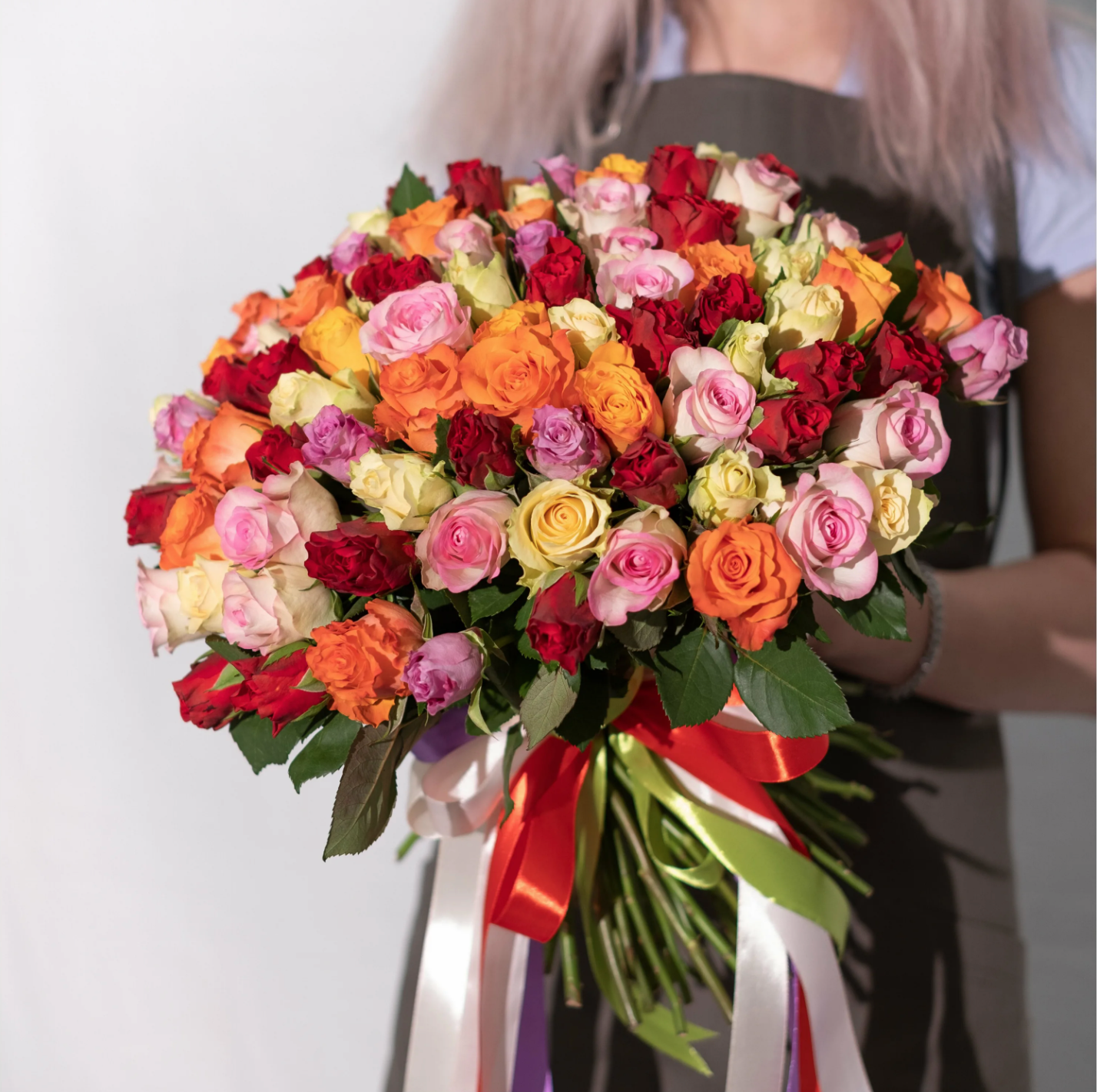 Букет из 101 кенийской розы, перевязанный атласной лентой.