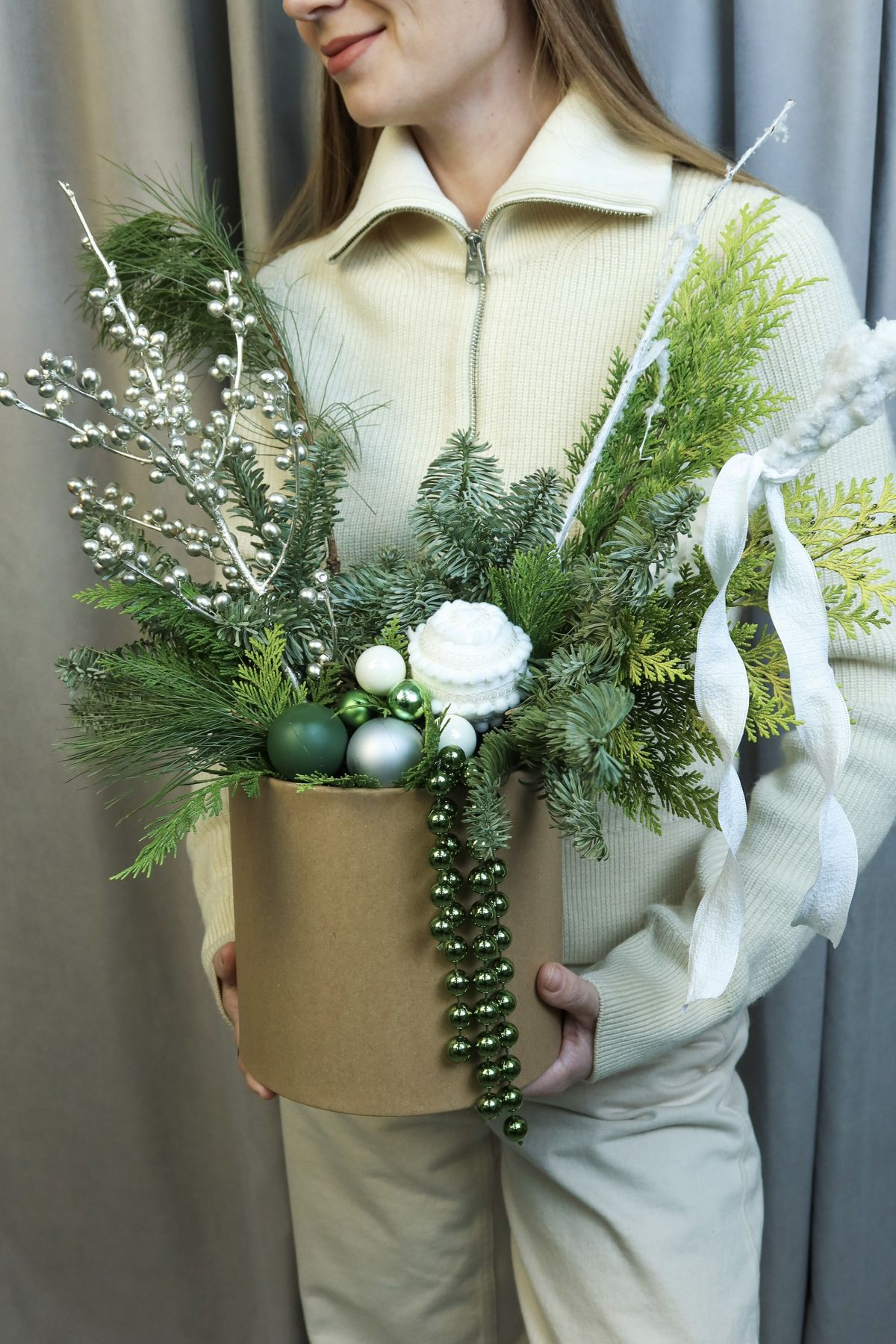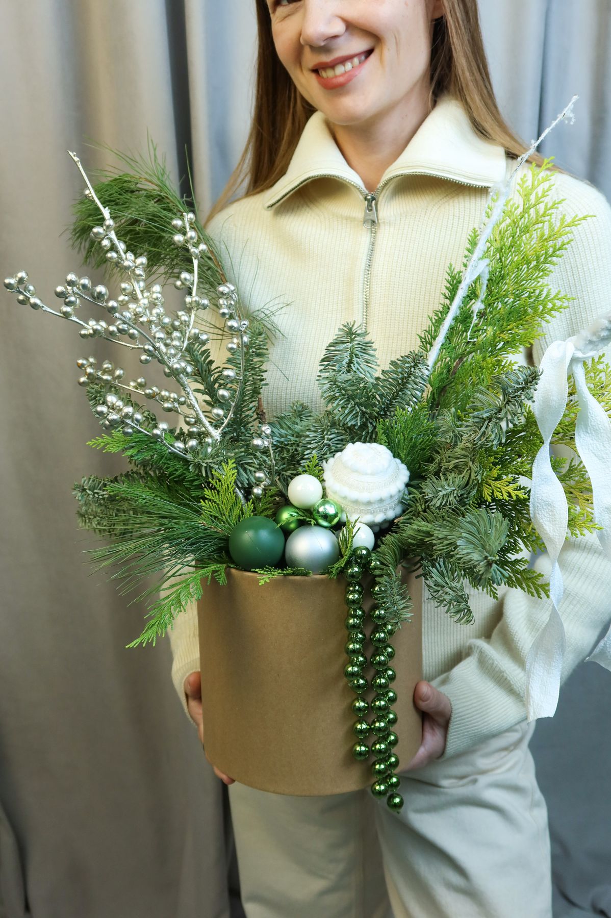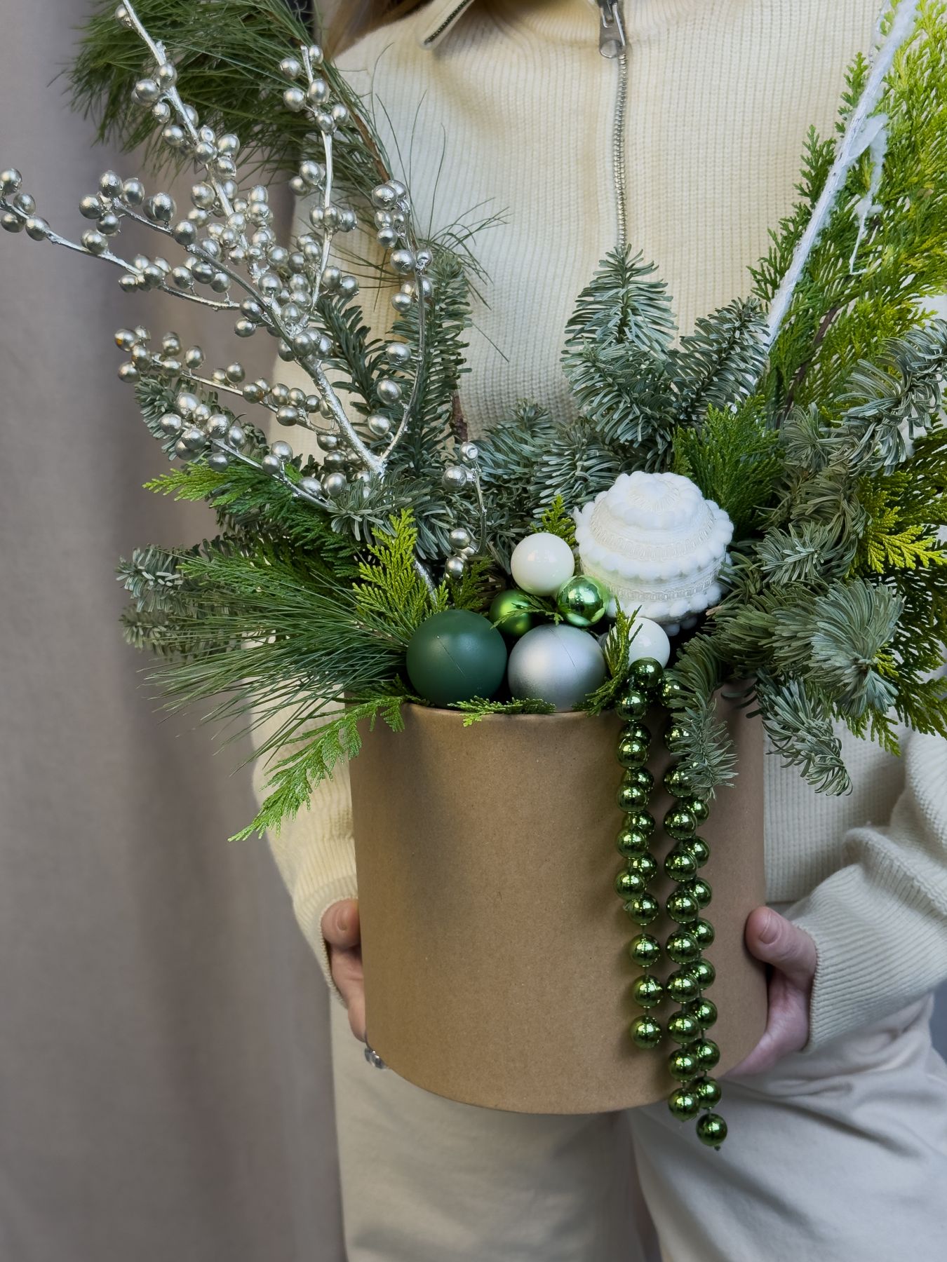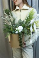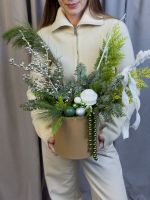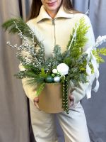 Новогодняя композиция в эко-коробке со стойкой пихтой Нобилис и насыщенной туей, дополненная серебристым Илексом, зелёными и белыми шарами и красивыми лентами.