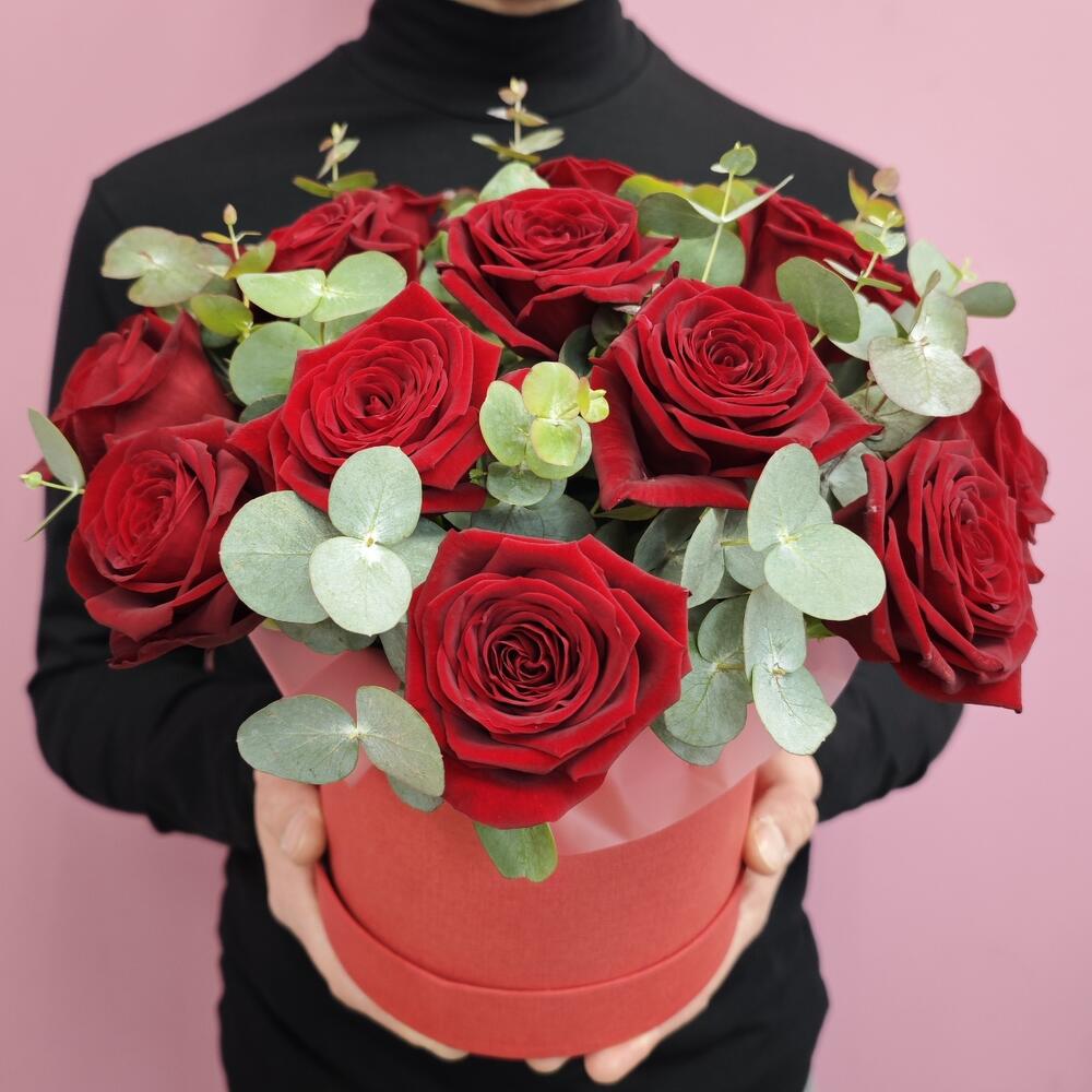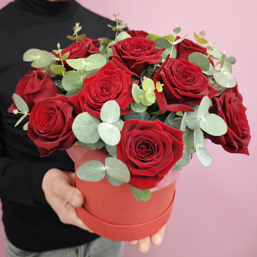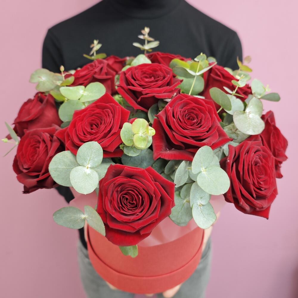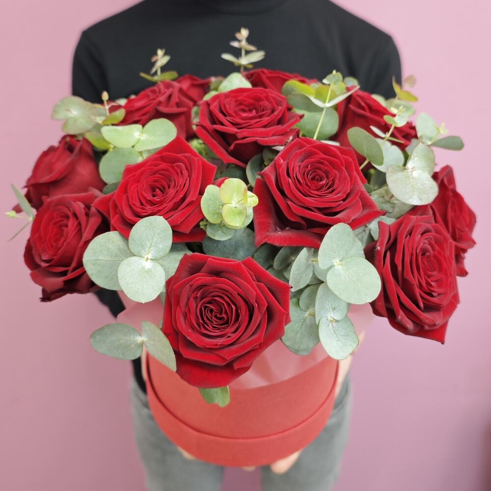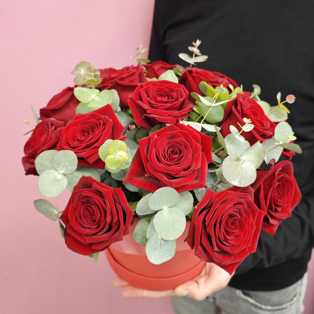 Состав: Красная роза - 15 штук Эвкалипт - 3 штуки Размер: 28х28