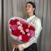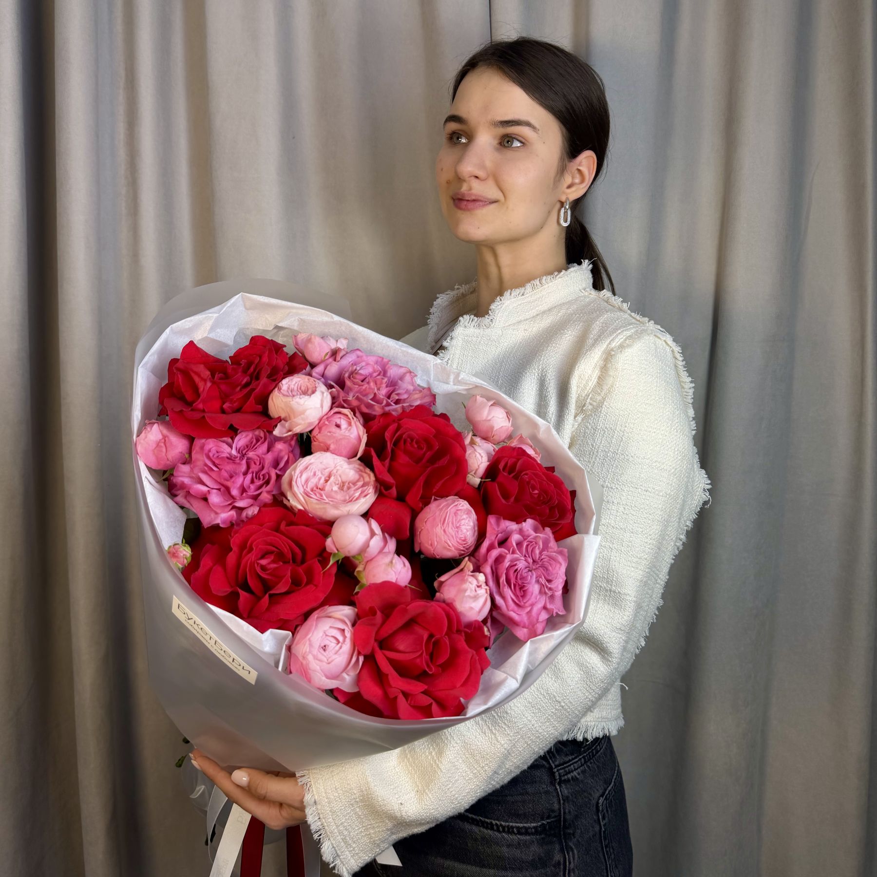Красивый букет из пионовидной одноголовой, пионовидной кустовой и французской розы.