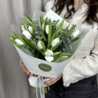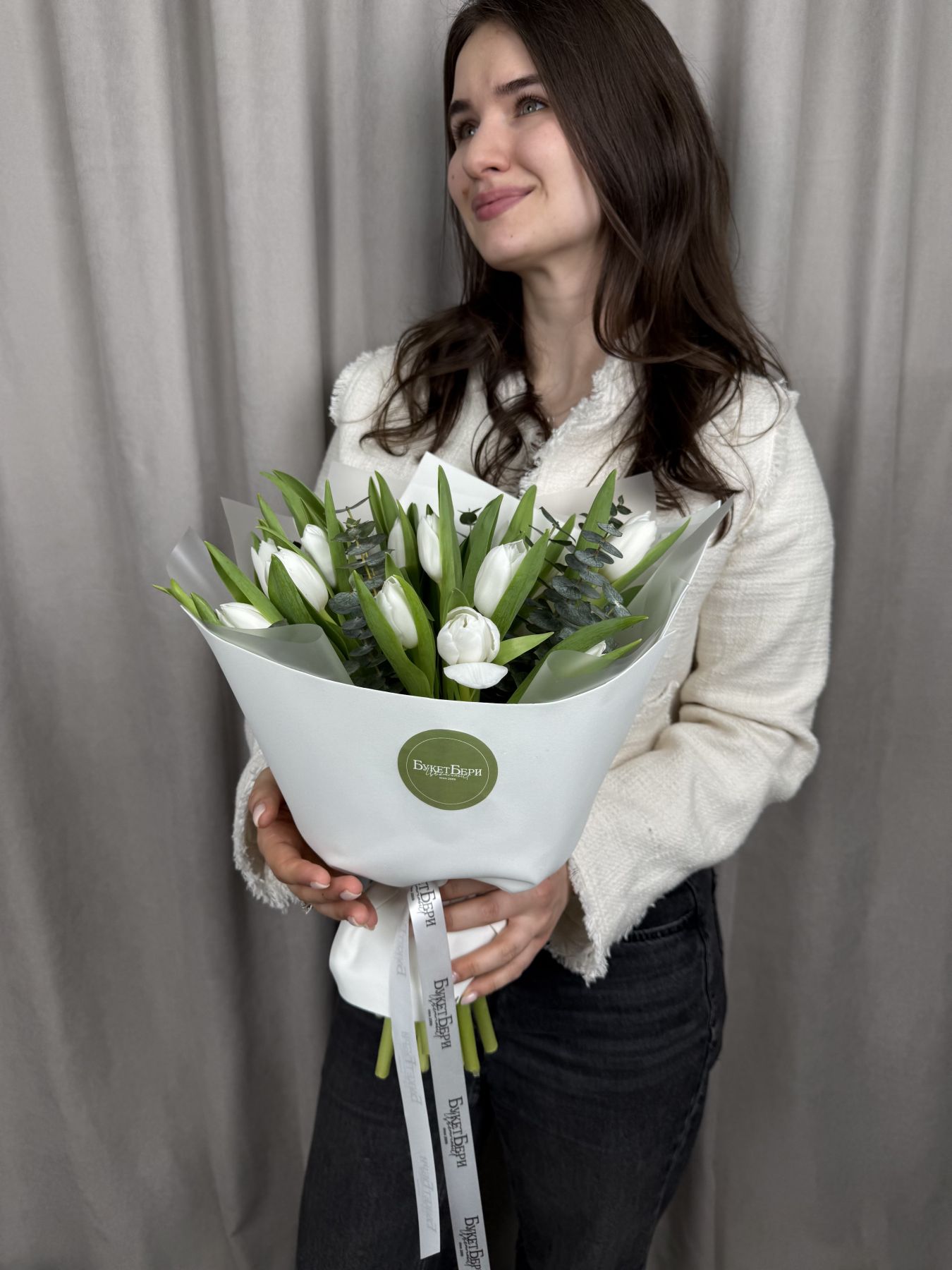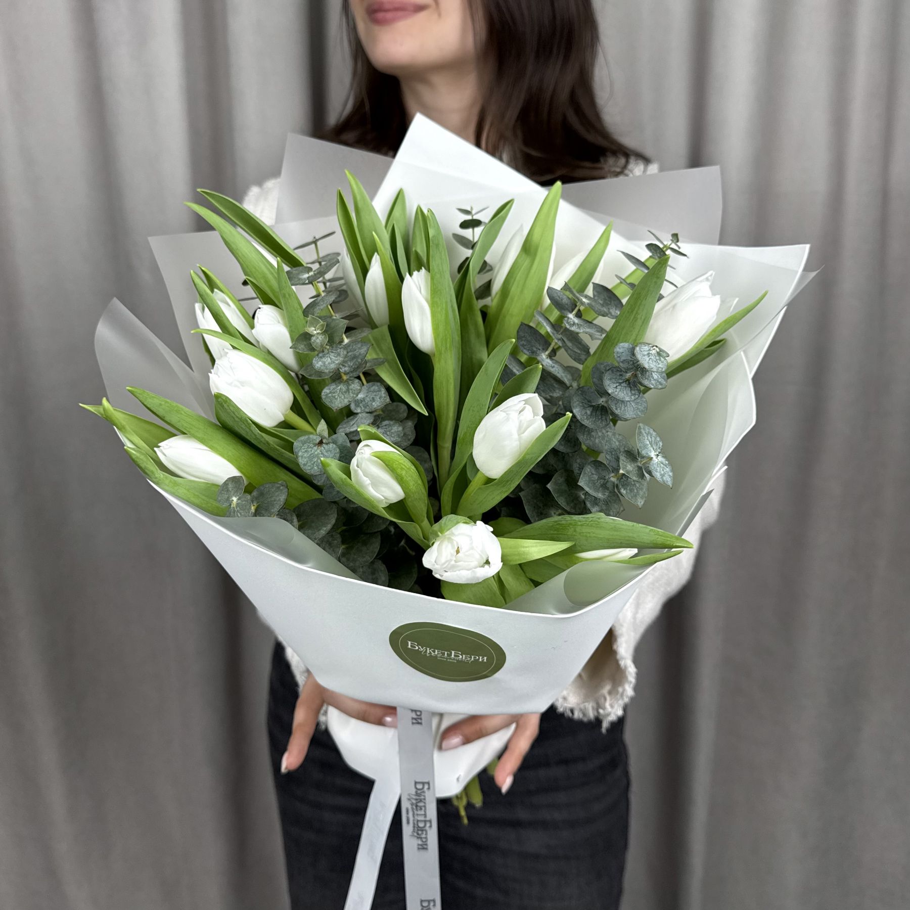 Нежный букет из белых тюльпанов с ароматными эвкалиптом в красивой упаковке.