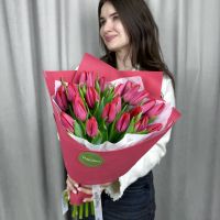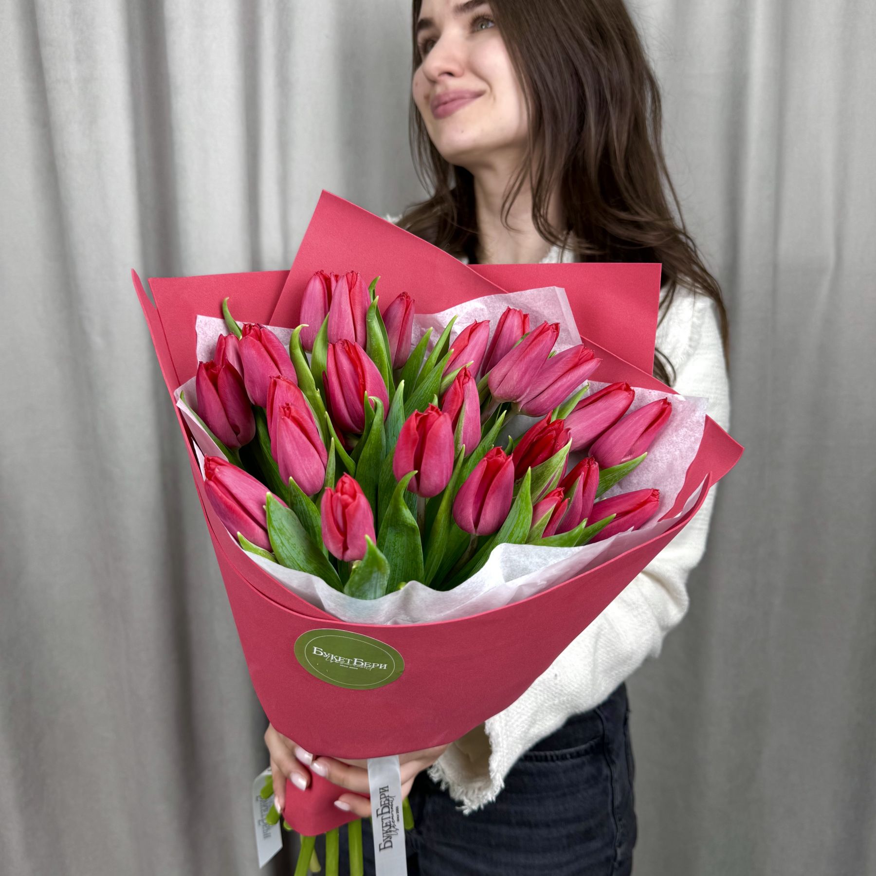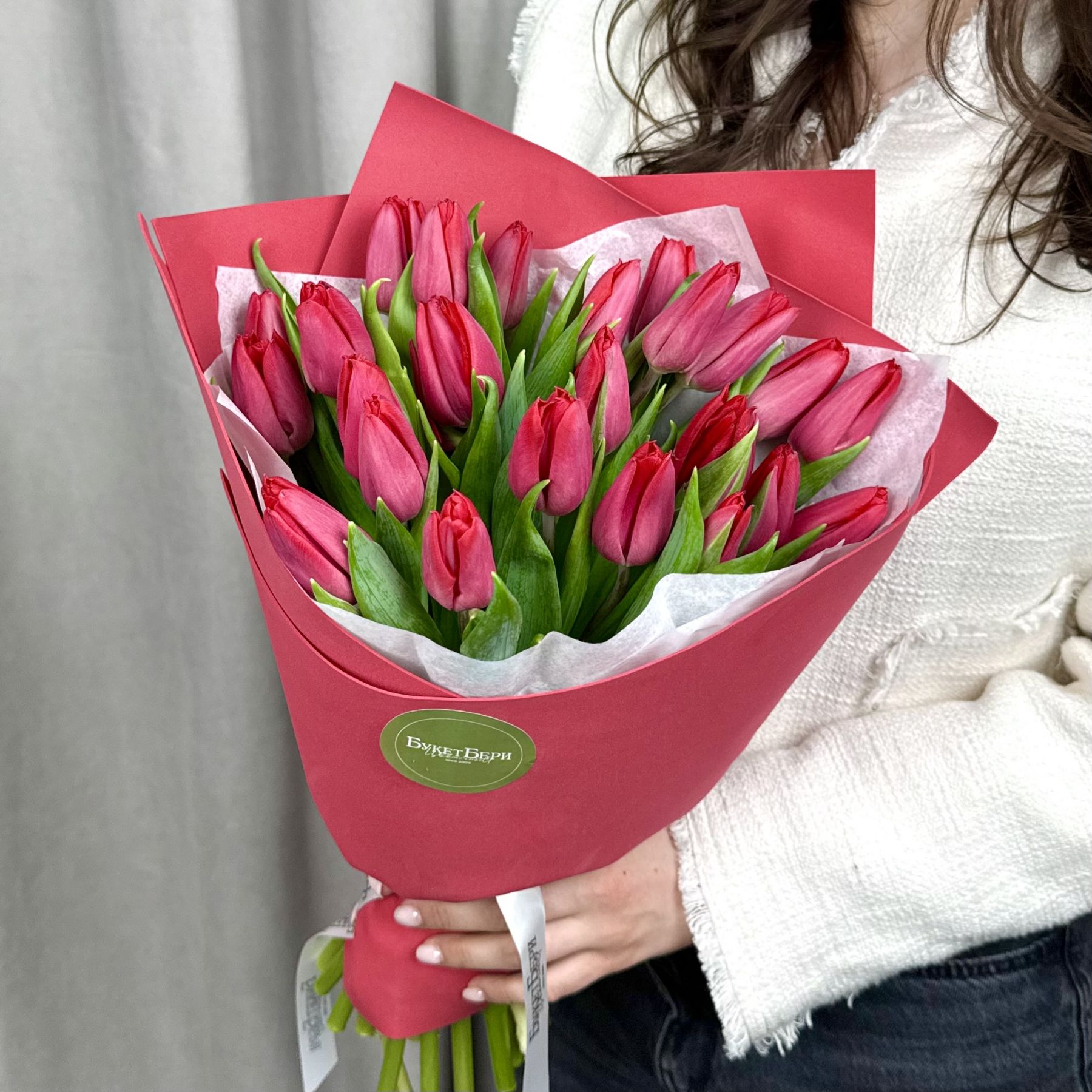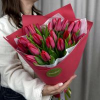 Яркий букет из красных тюльпанов в красивой упаковке.