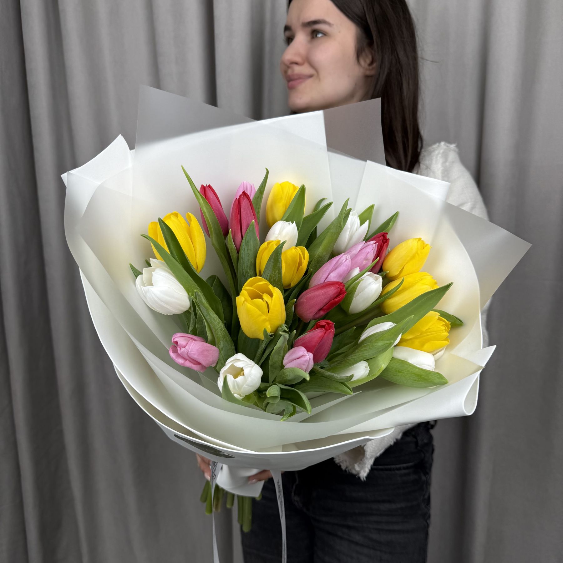 Яркий букет из красных тюльпанов в красивой упаковке.