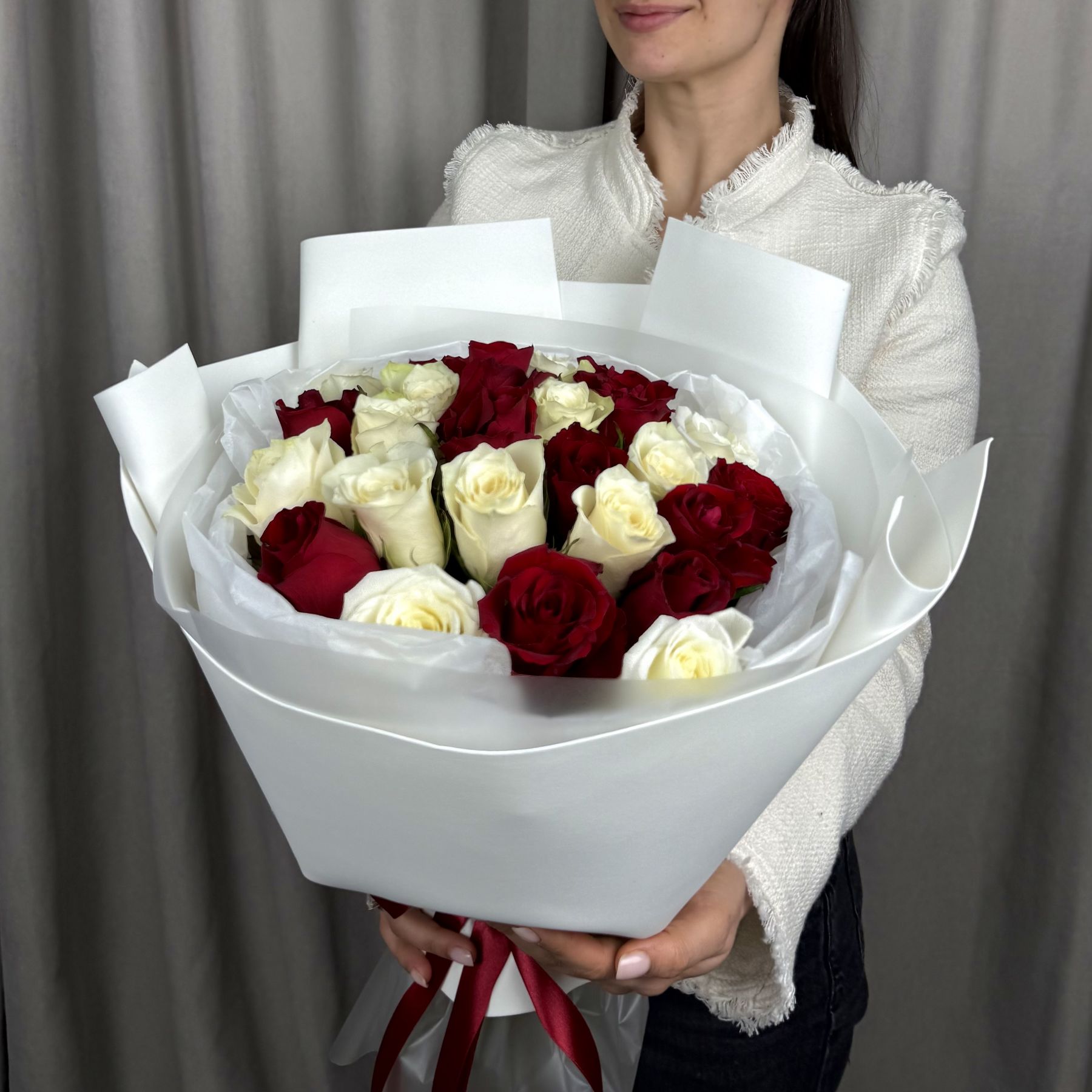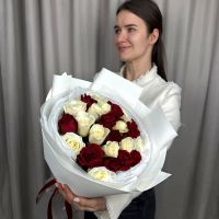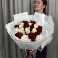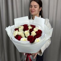 Монобукет из 25 белых и красных роз в трендовой упаковке.