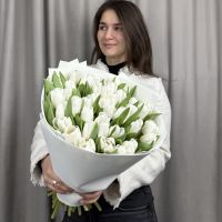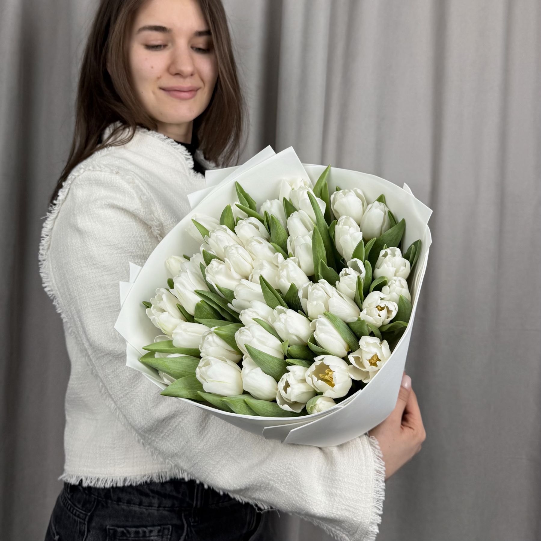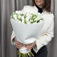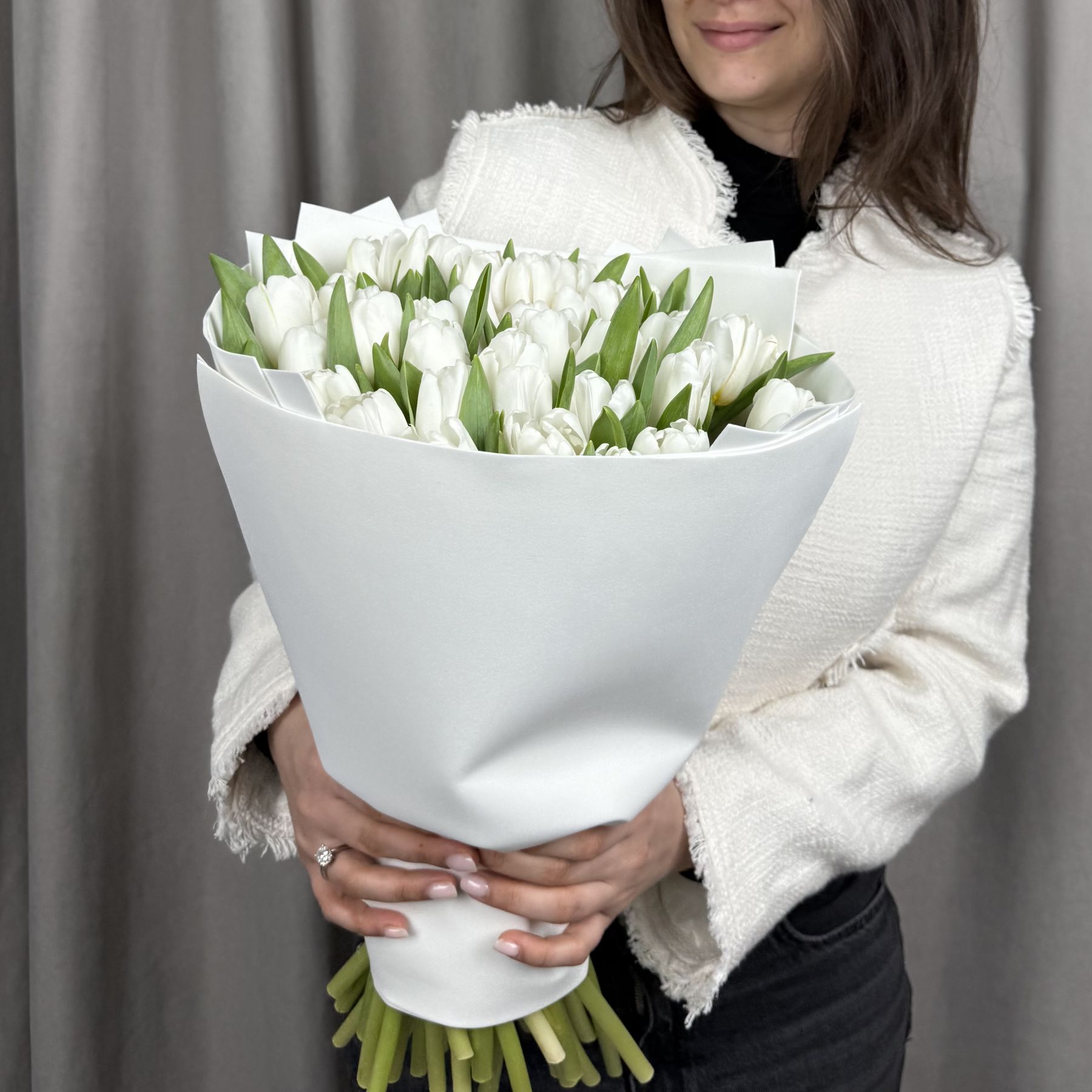 Букет из белых свежих хрустящих тюльпанов в упаковке.