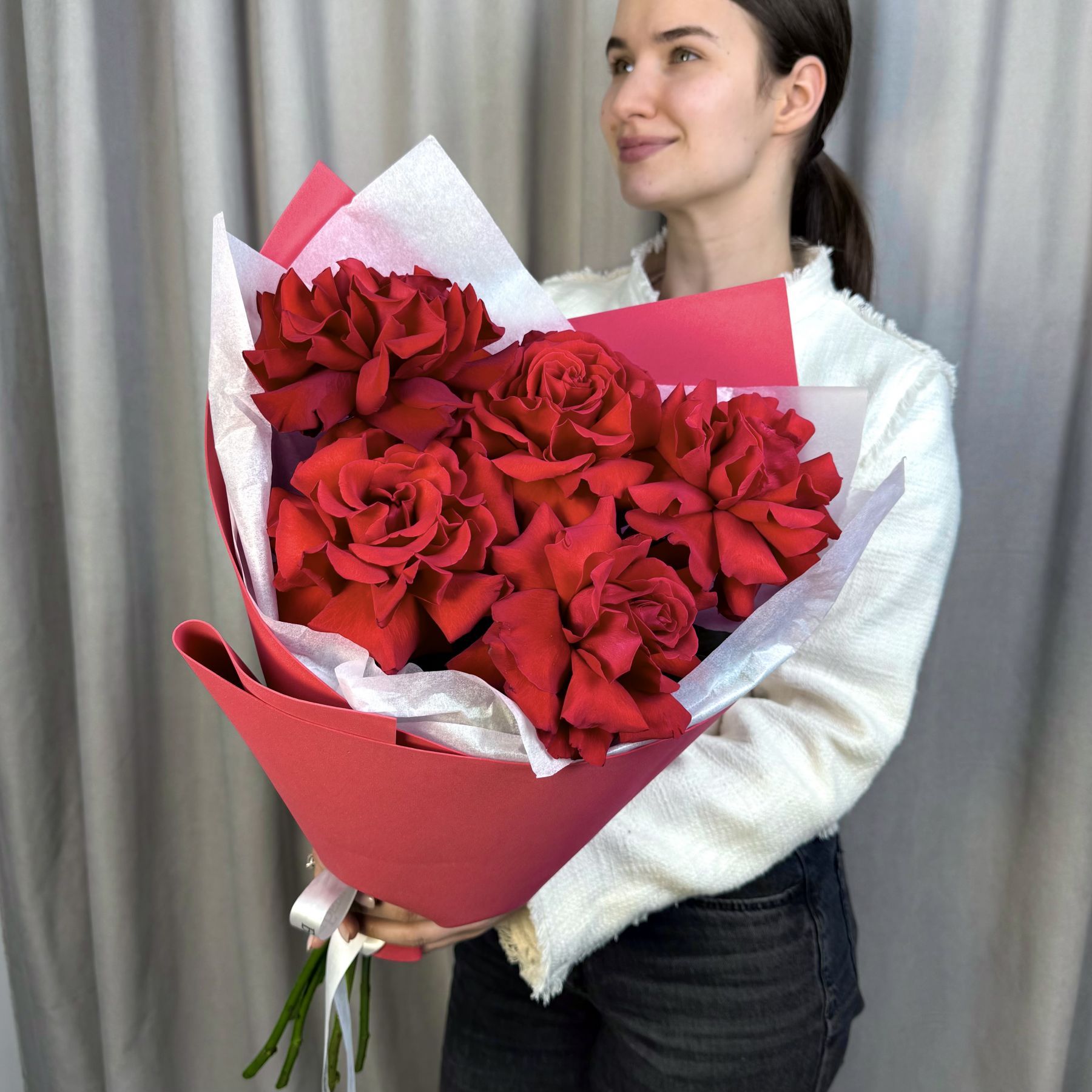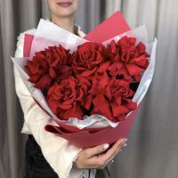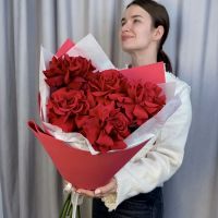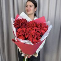 Букет будет доставлен в специальной транспортировочной коробке с подпиткой, открыткой и инструкцией по уходу в подарок.