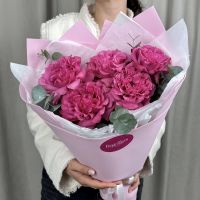 Букет из 5 стойких французских роз сорта Кантри Блю с ароматным эвкалиптом в упаковке.