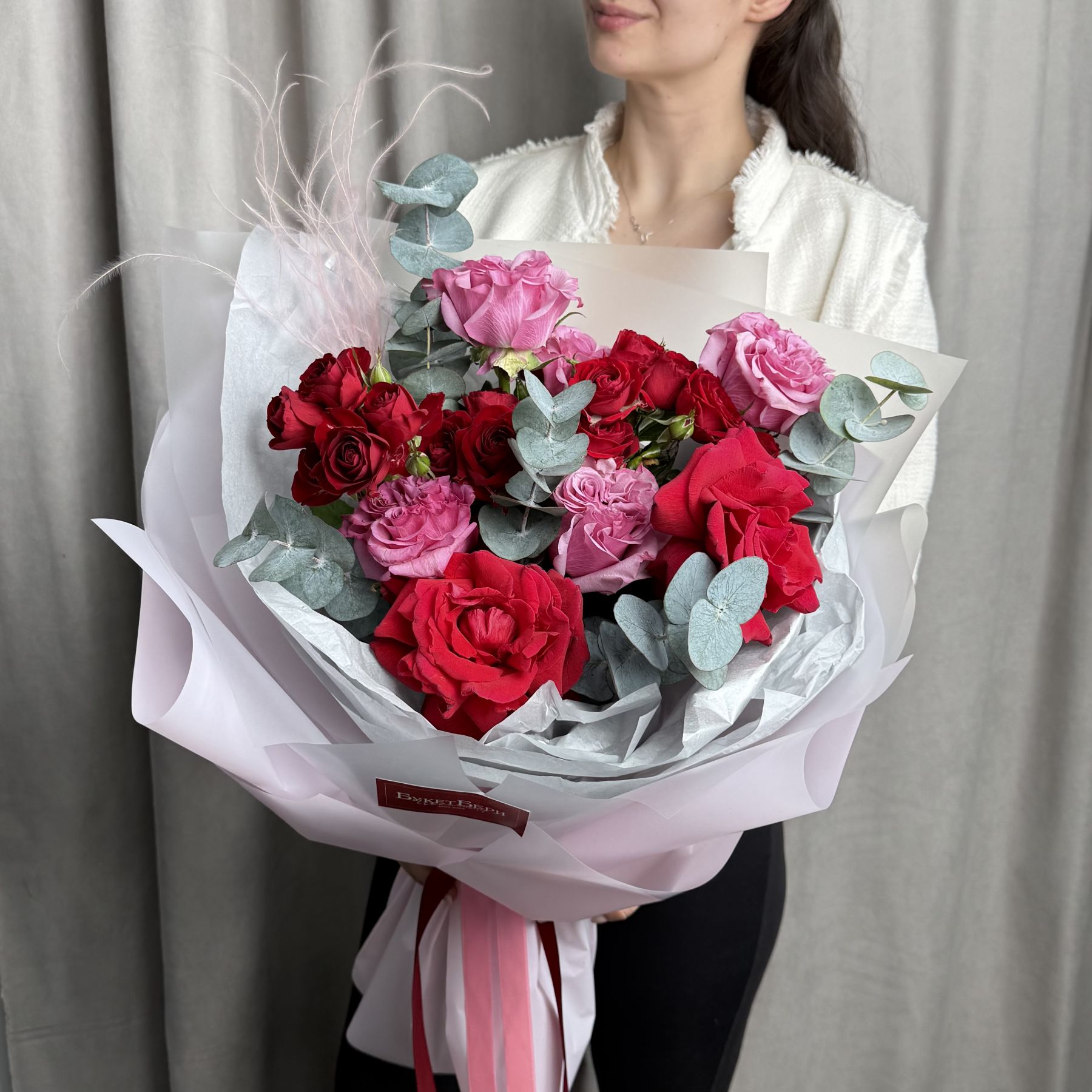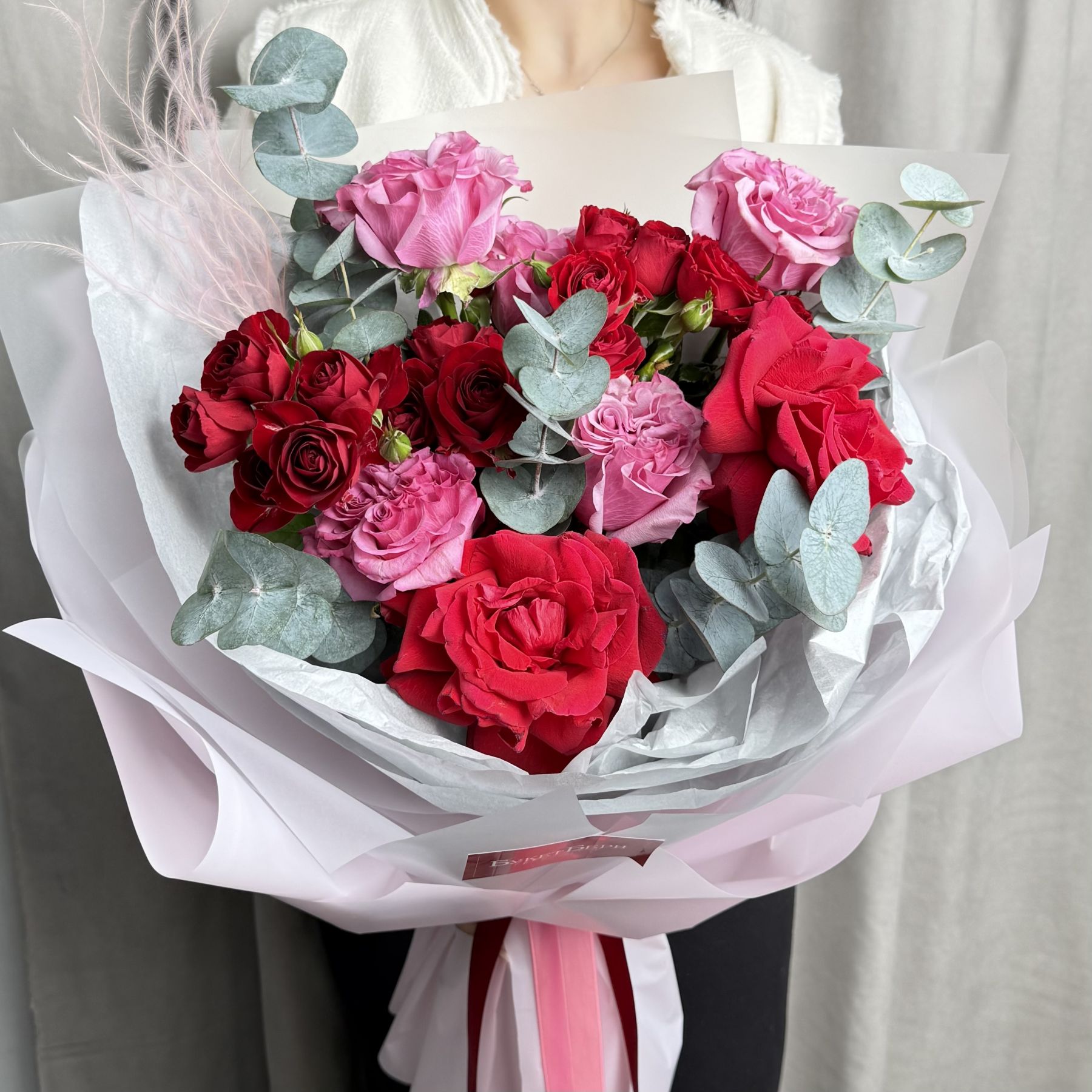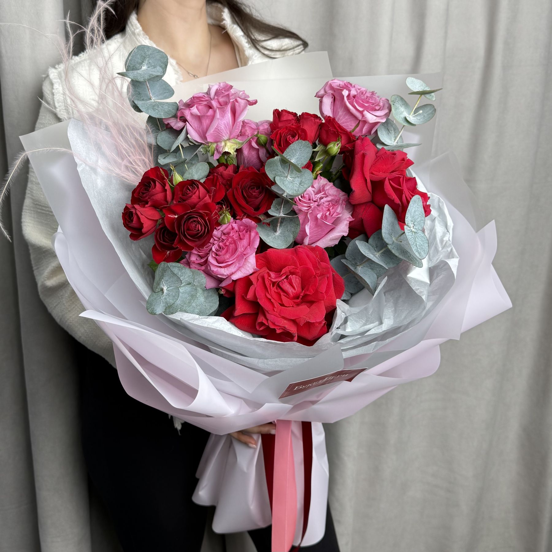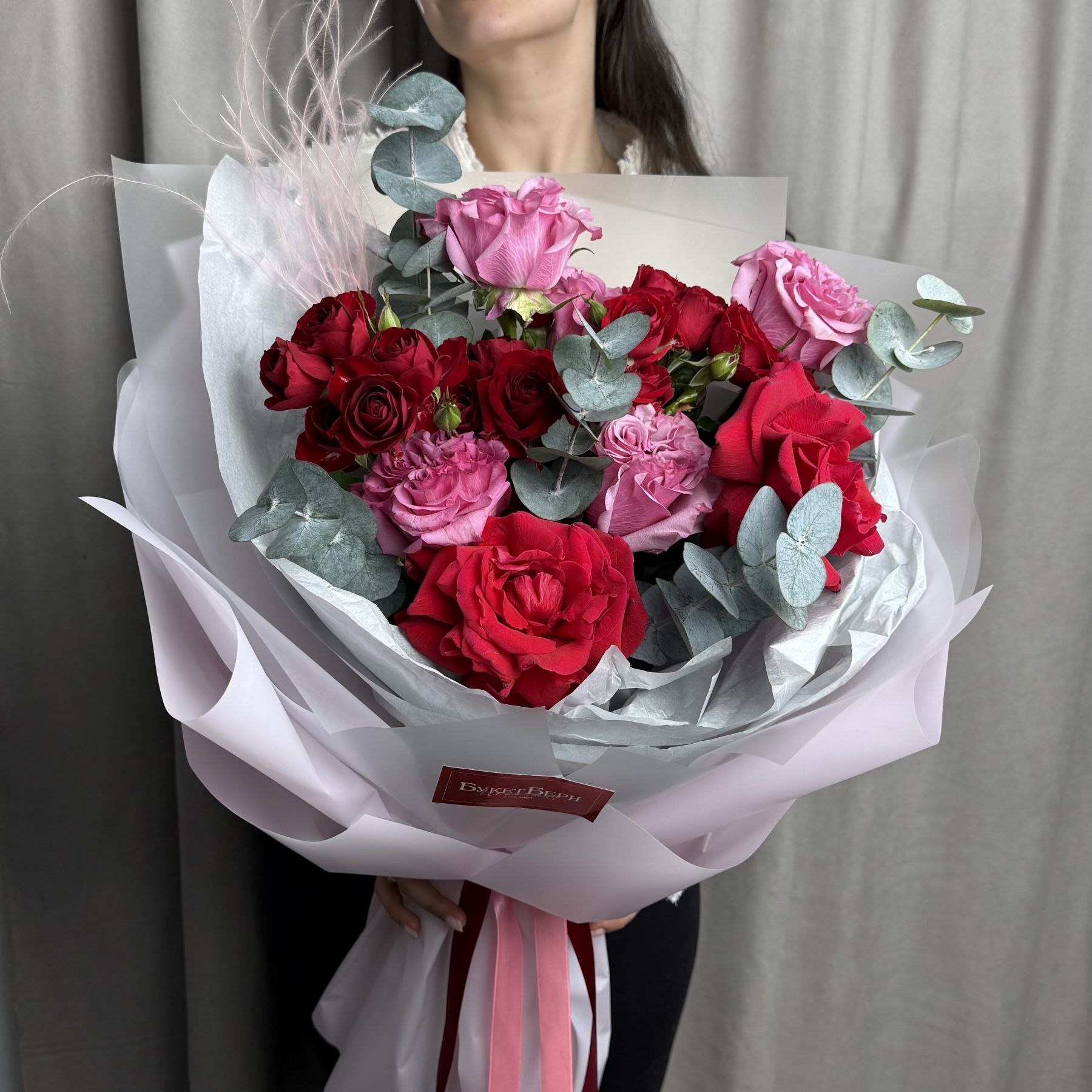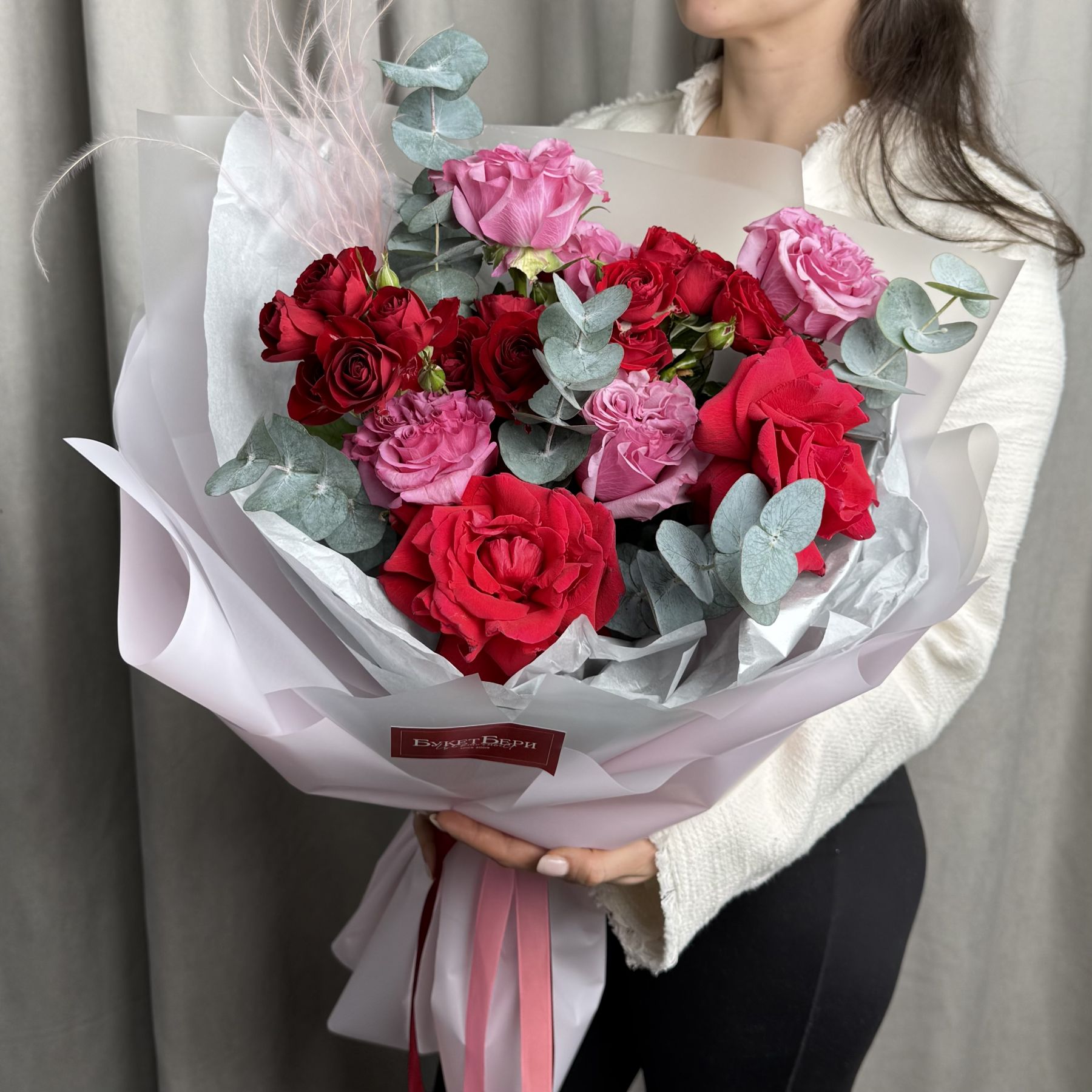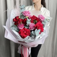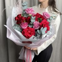 Красивый сборный букет из роз: пионовидных, кустовых и французских с ароматным эвкалиптом в трендовой упаковке.