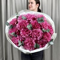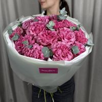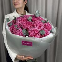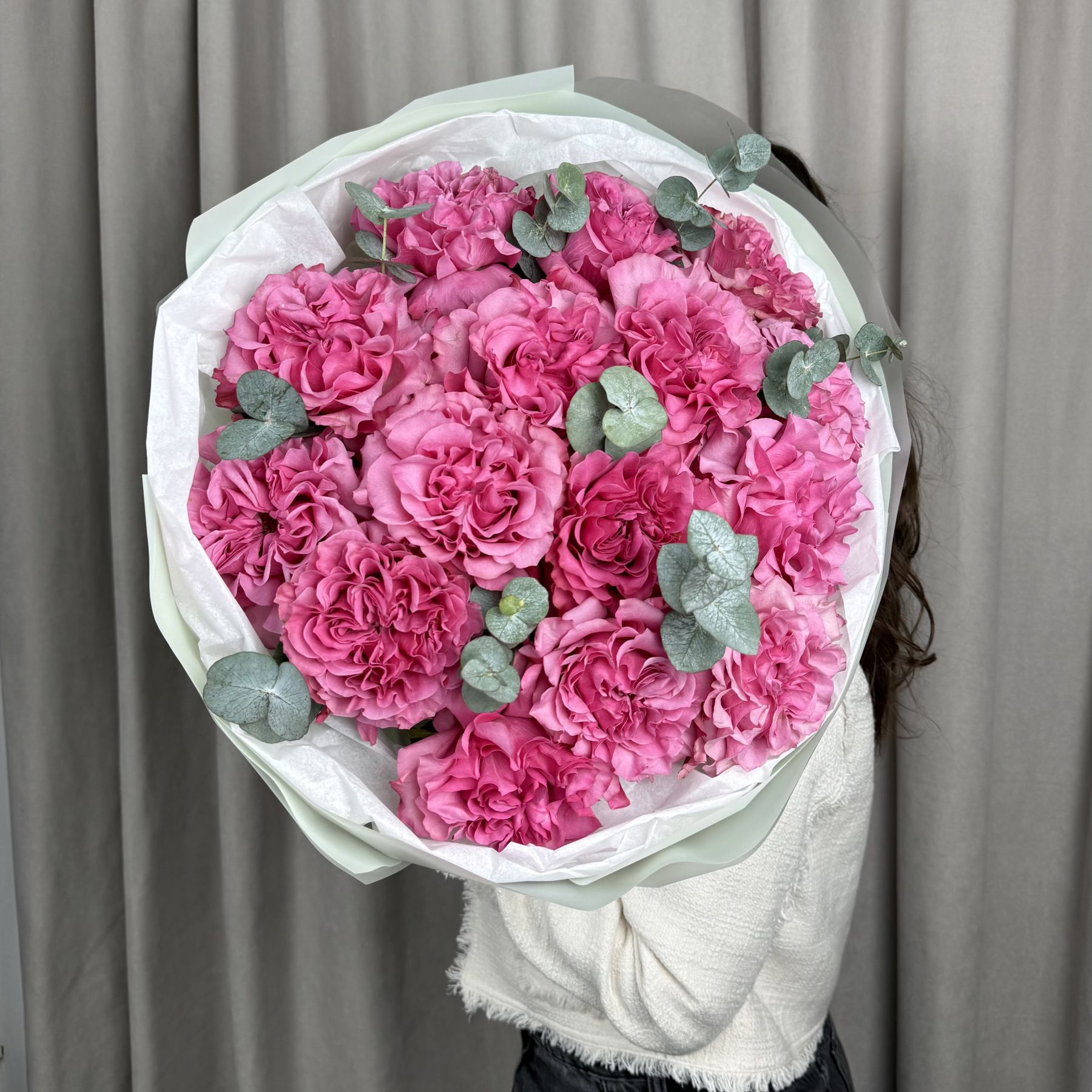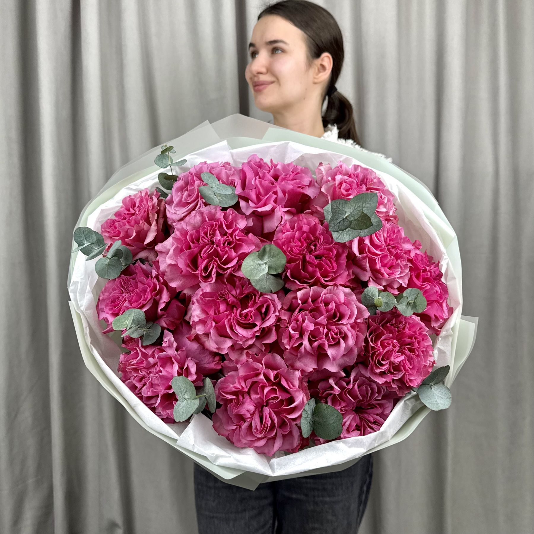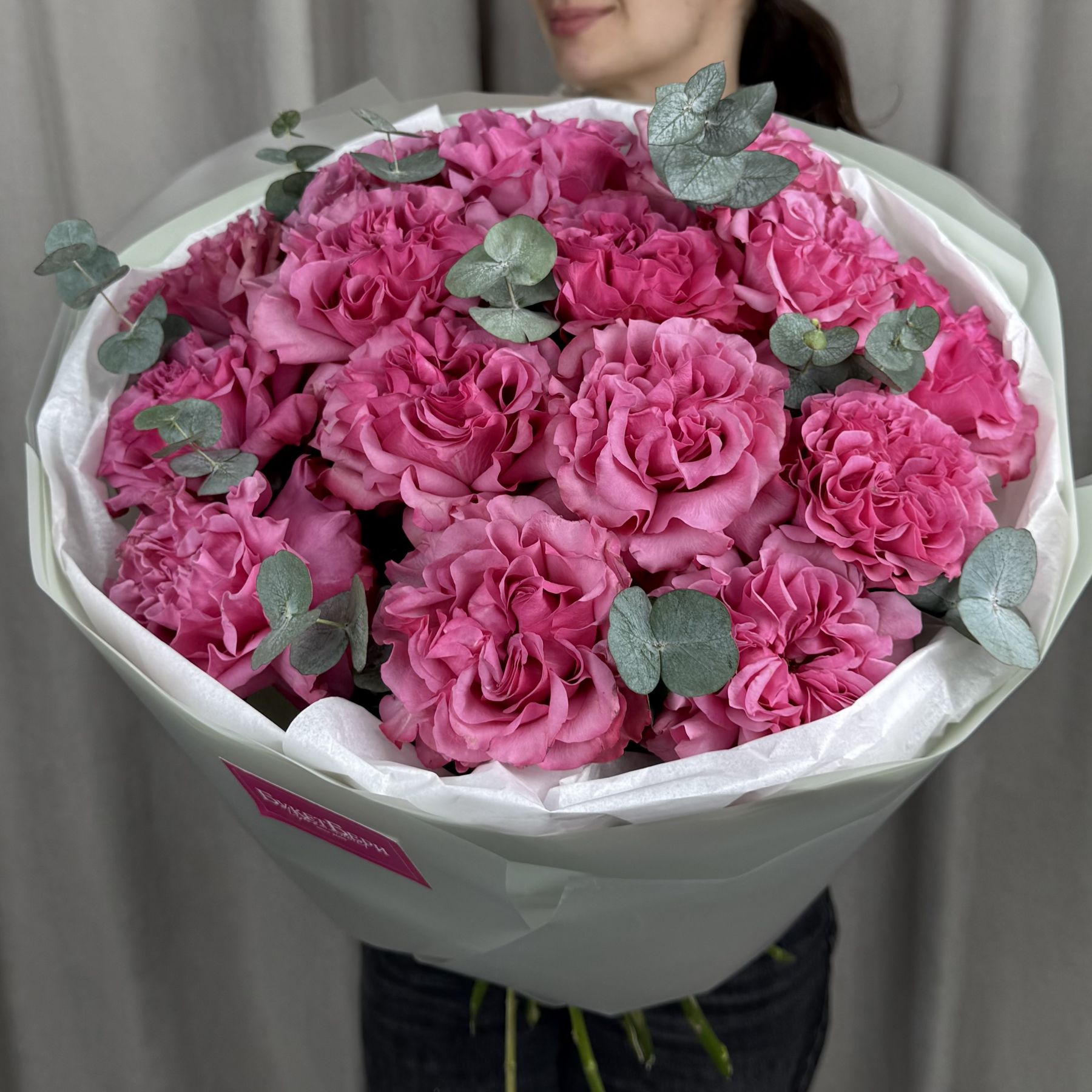 Большой букет из 15 стойких французских роз Кантри Блю с ароматным эвкалиптом в трендовой упаковке.