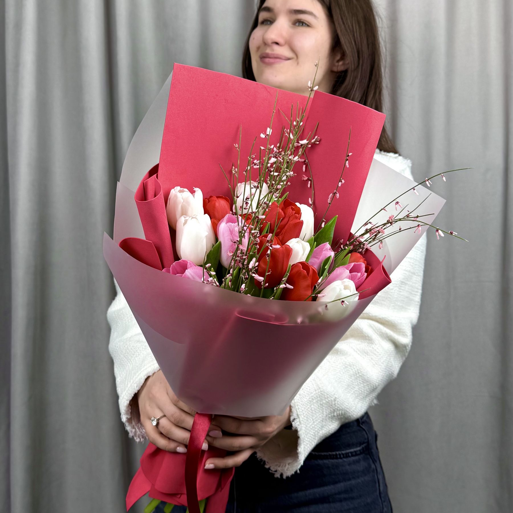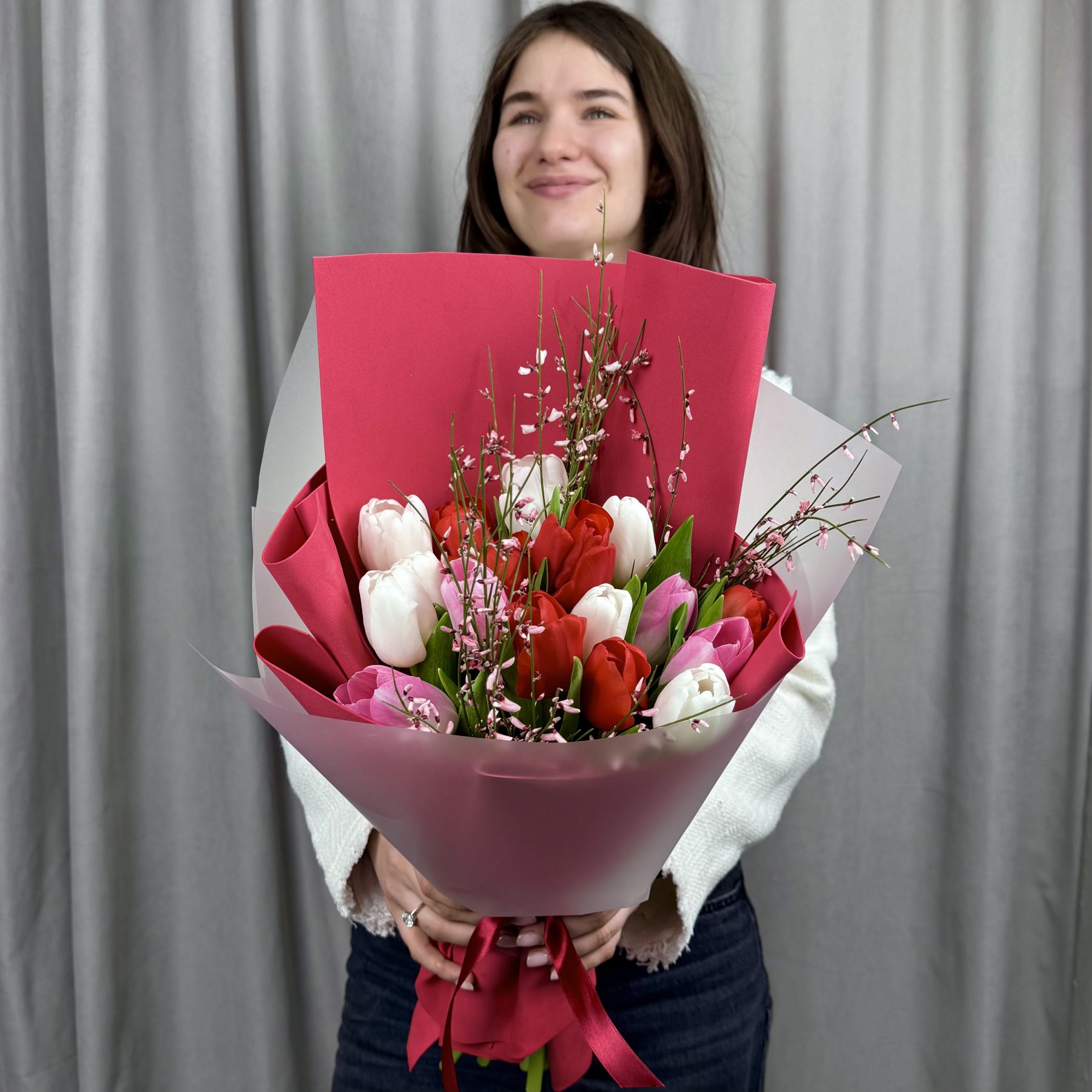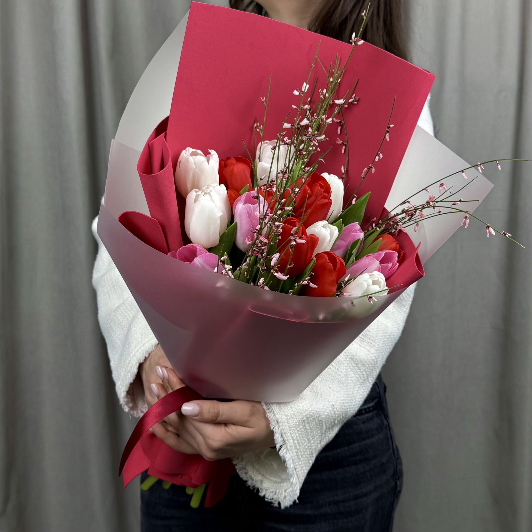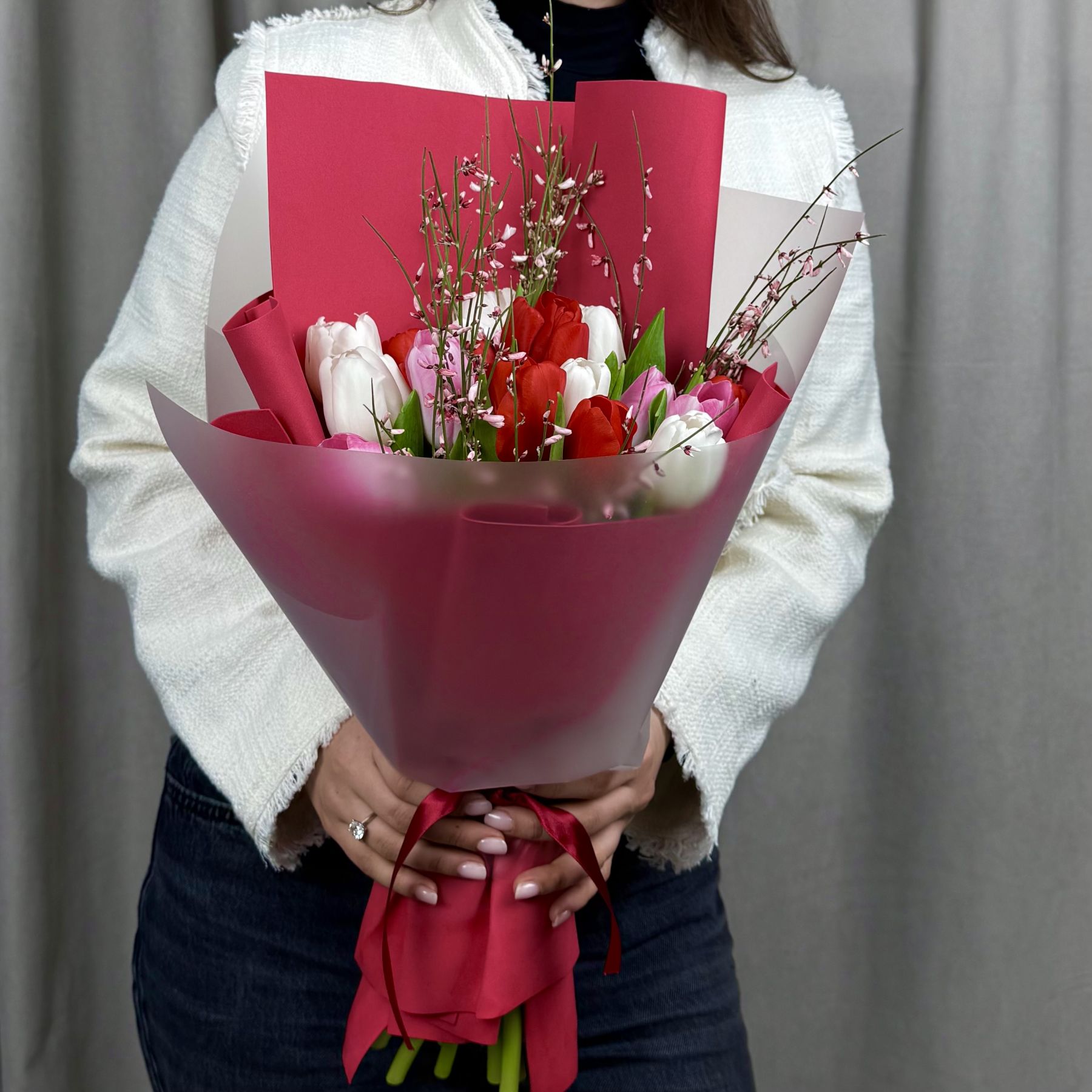 Букет из свежих хрустящих тюльпанов и ароматной генисты в упаковке.