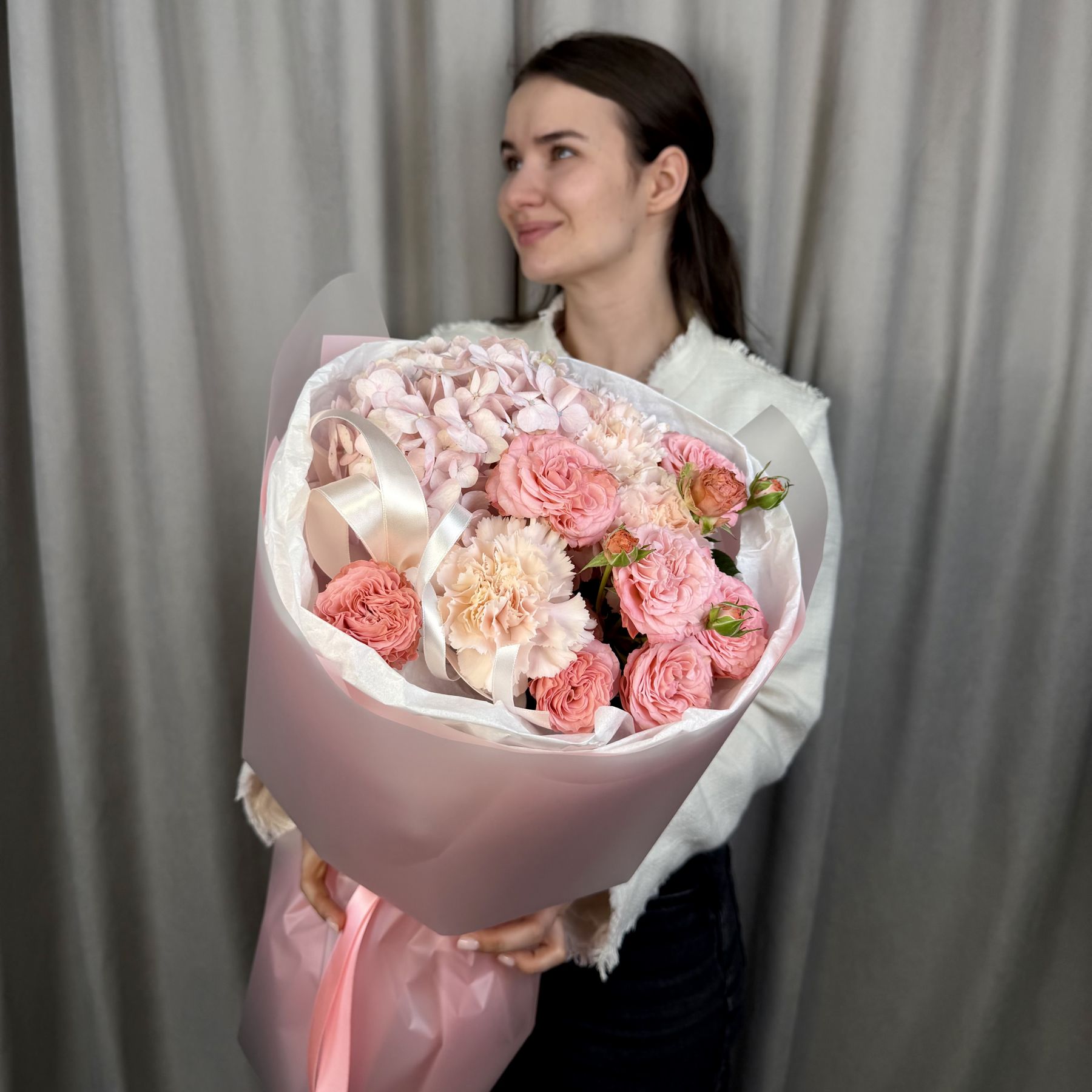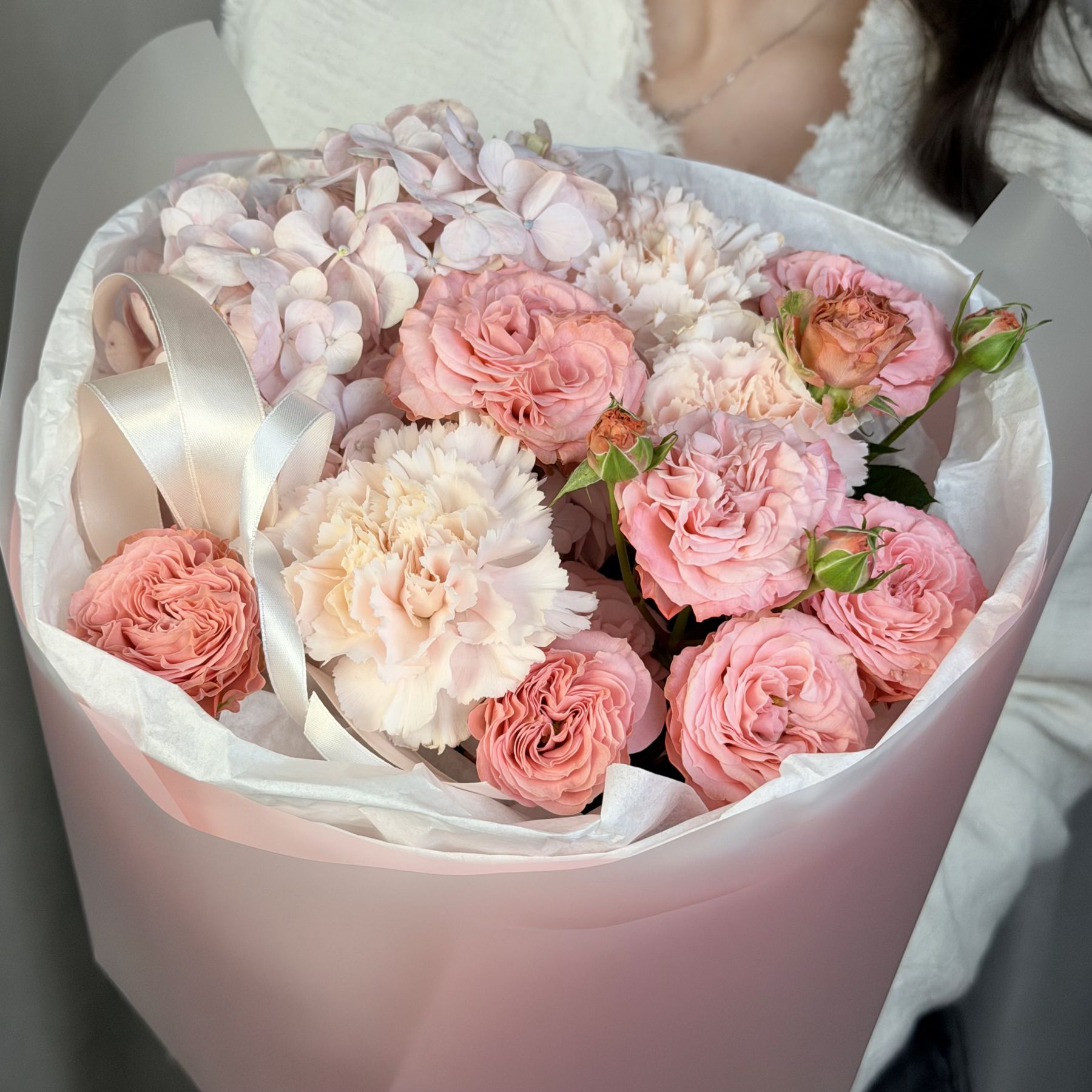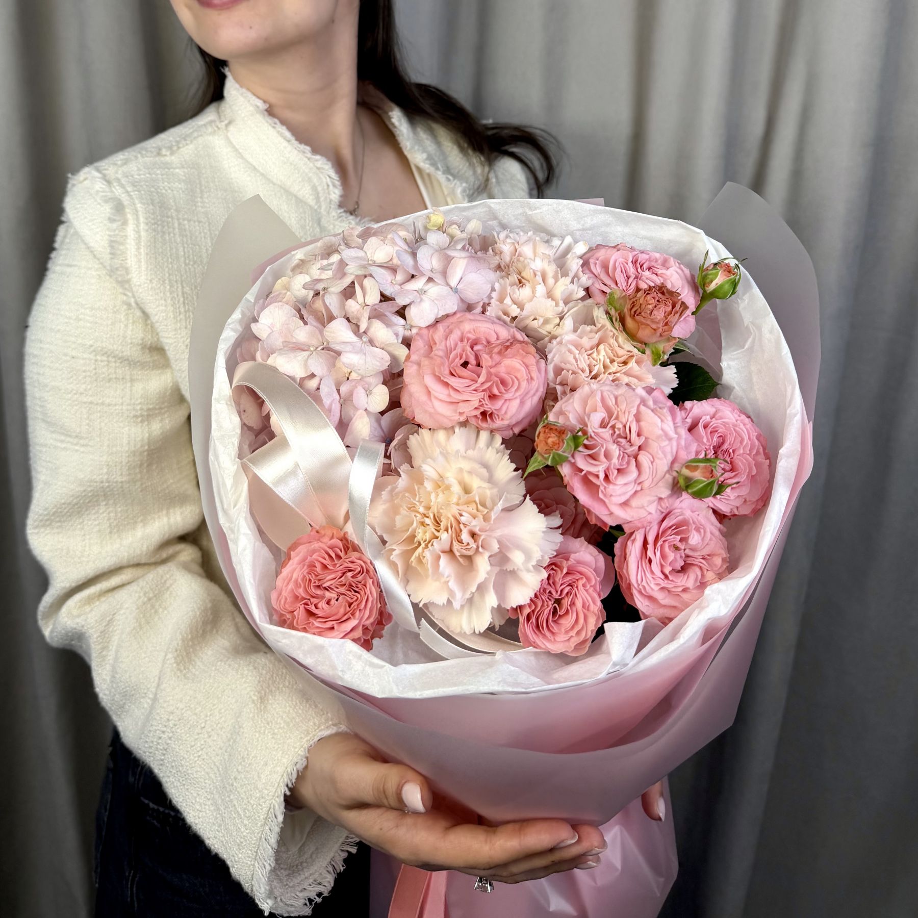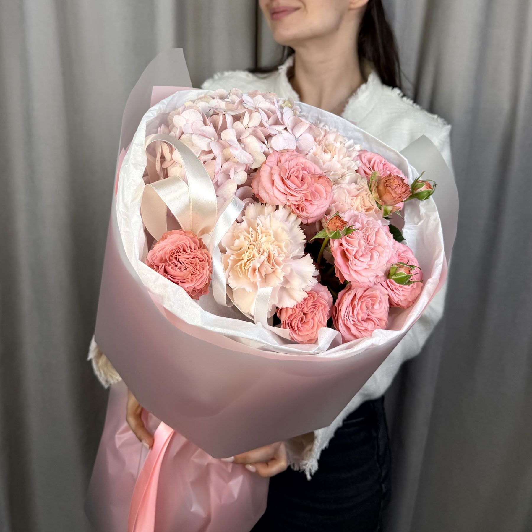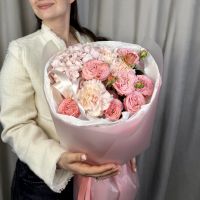 Аккуратный небольшой букет из кустовых пионовидных роз с гортензией и диантусами в трендовой упаковке.