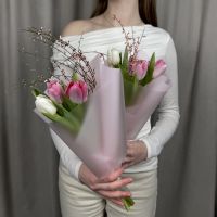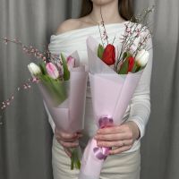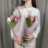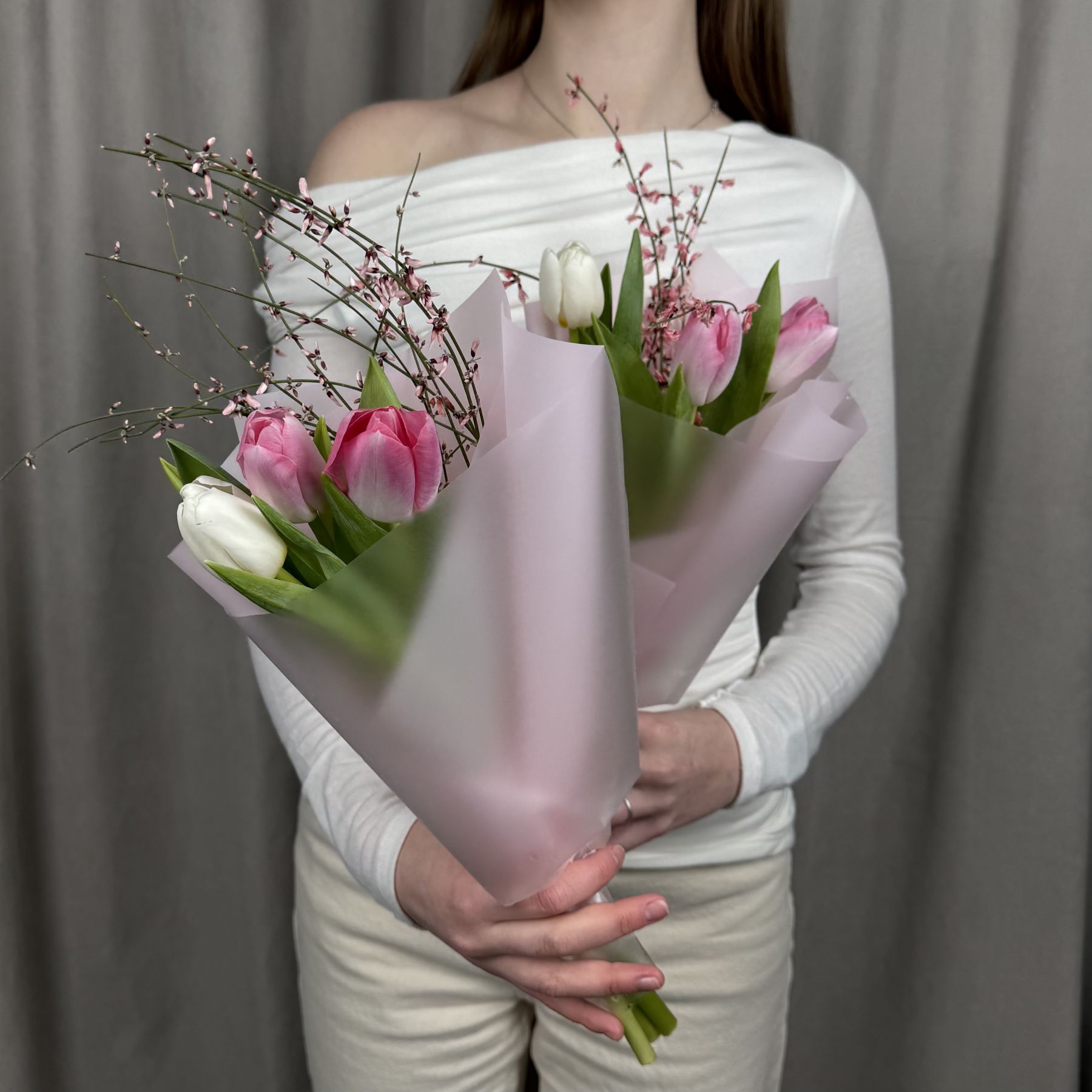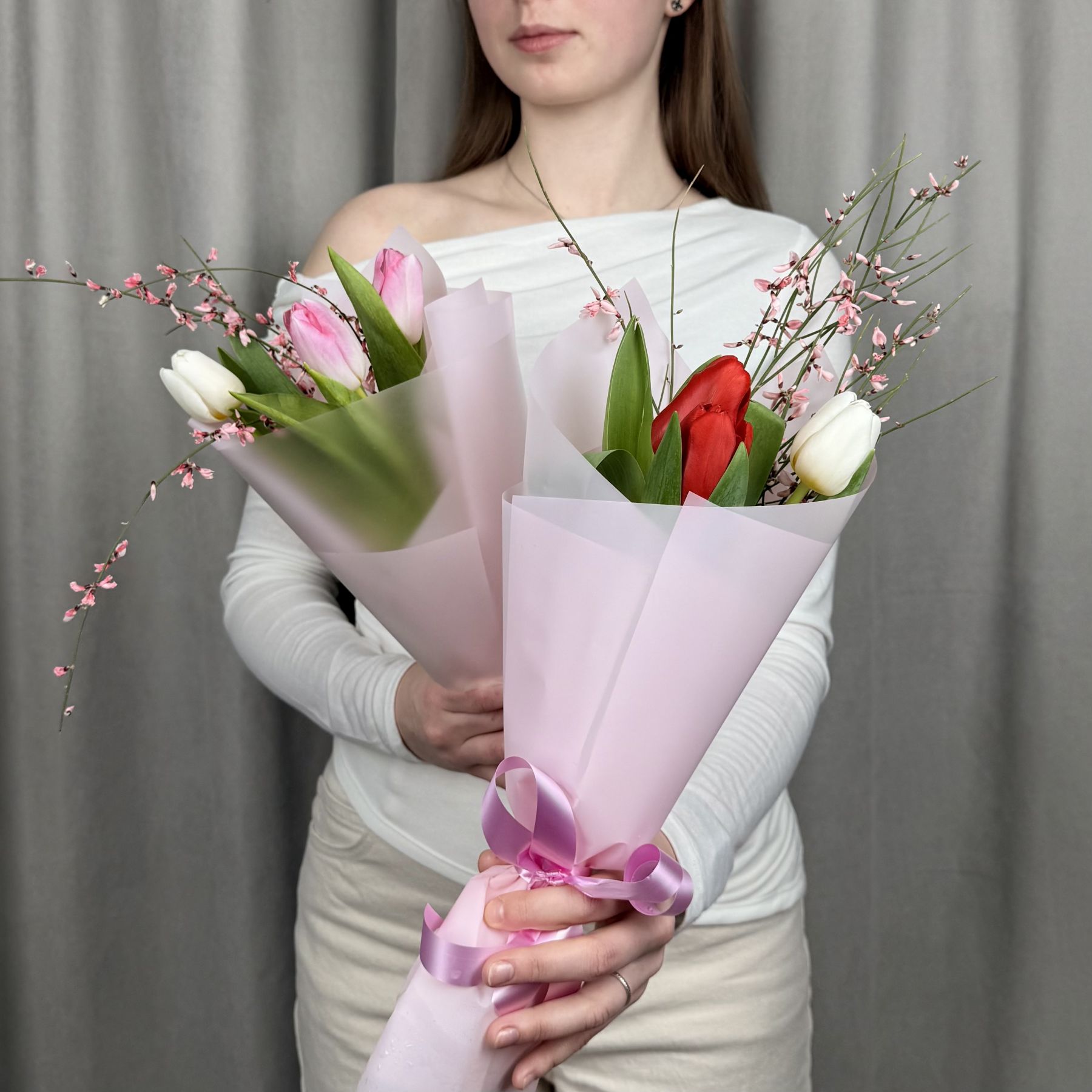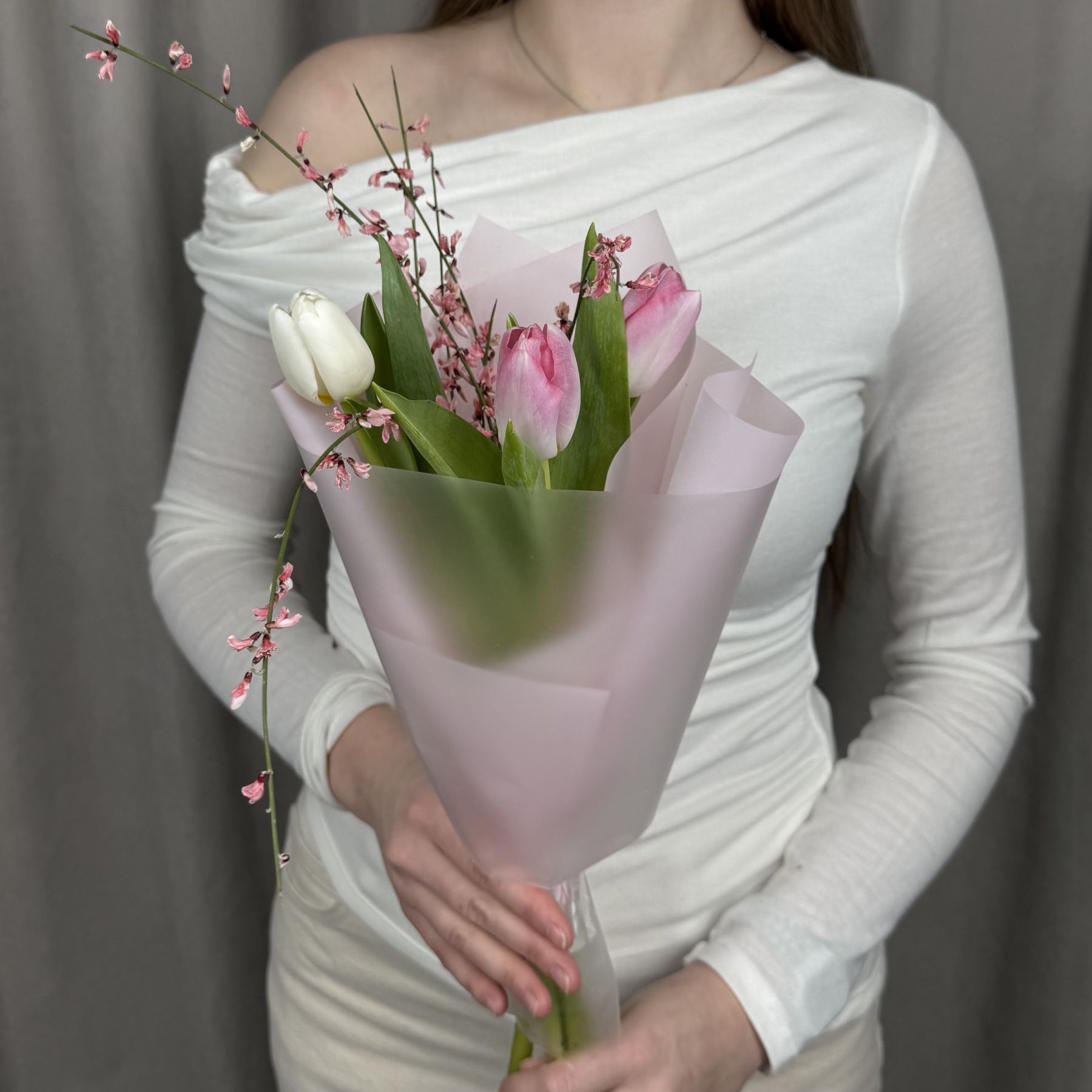 Микс из трех тюльпанов и ароматной генисты в упаковке.