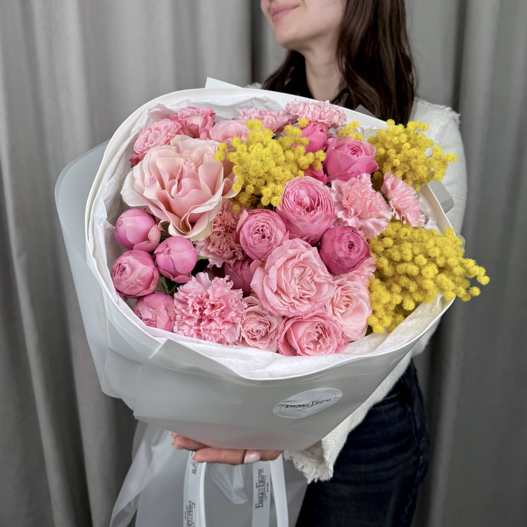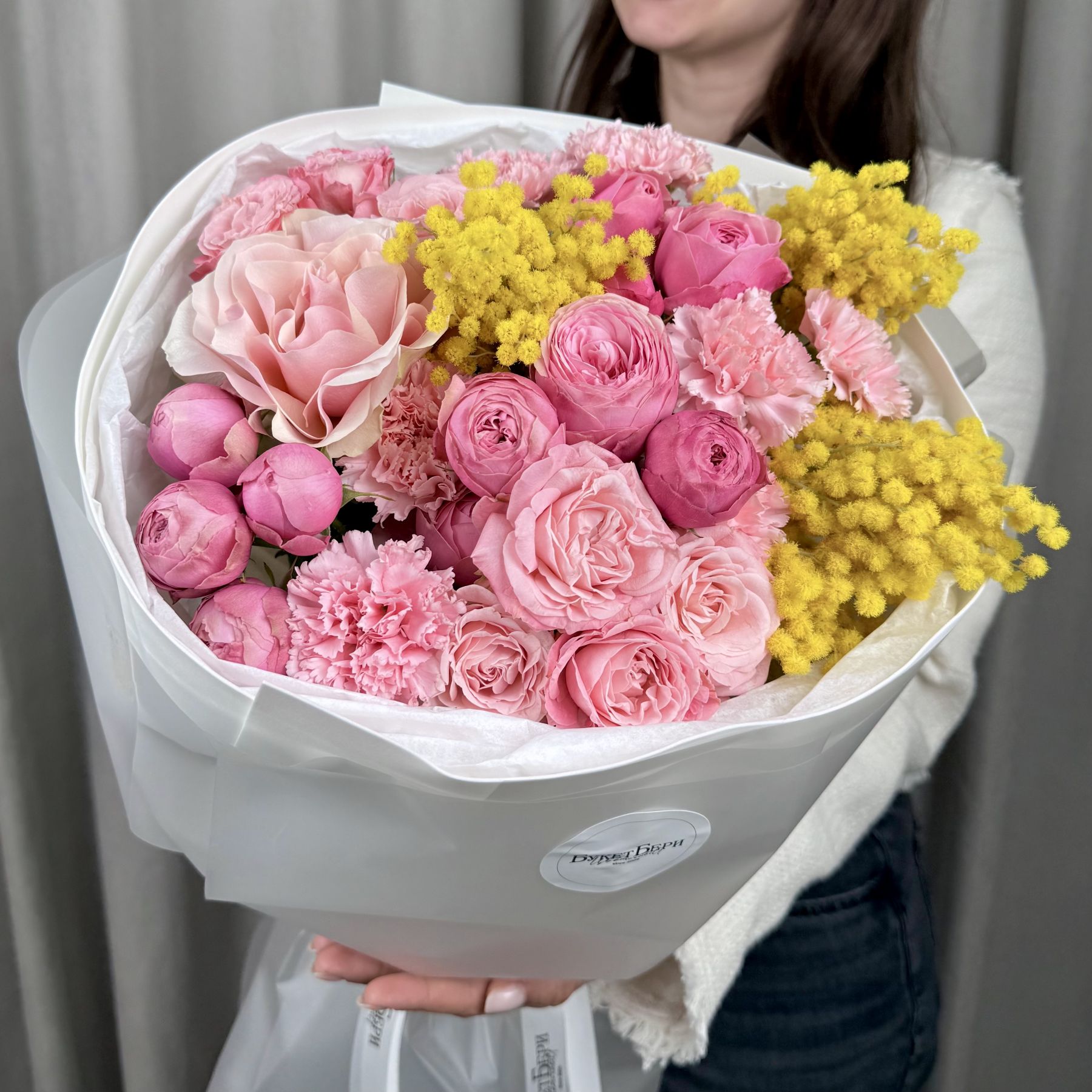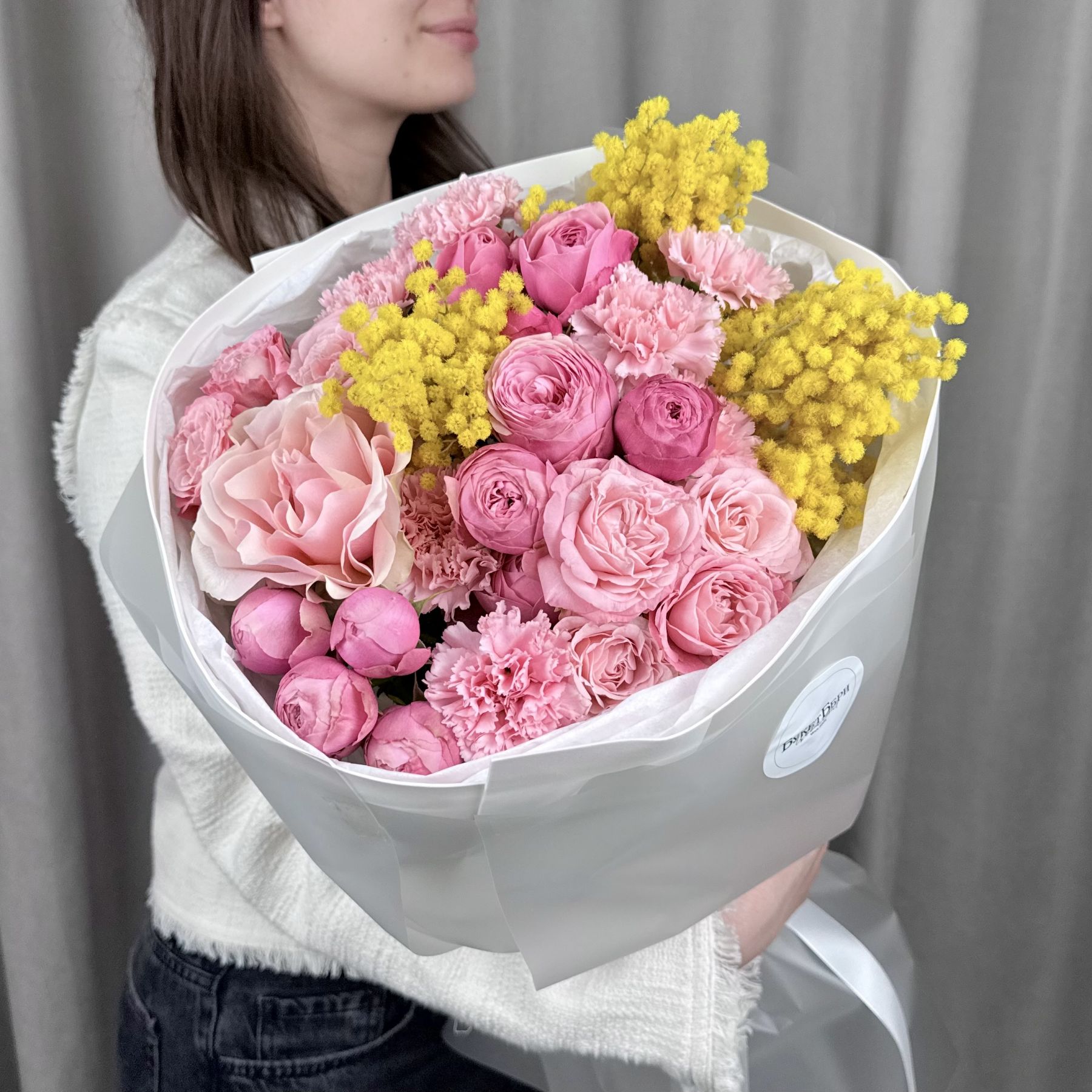 Яркий весенний букет с розами кустовыми пионовидными, французской розой, диантусами и мимозой на штажках в трендовой упаковке.