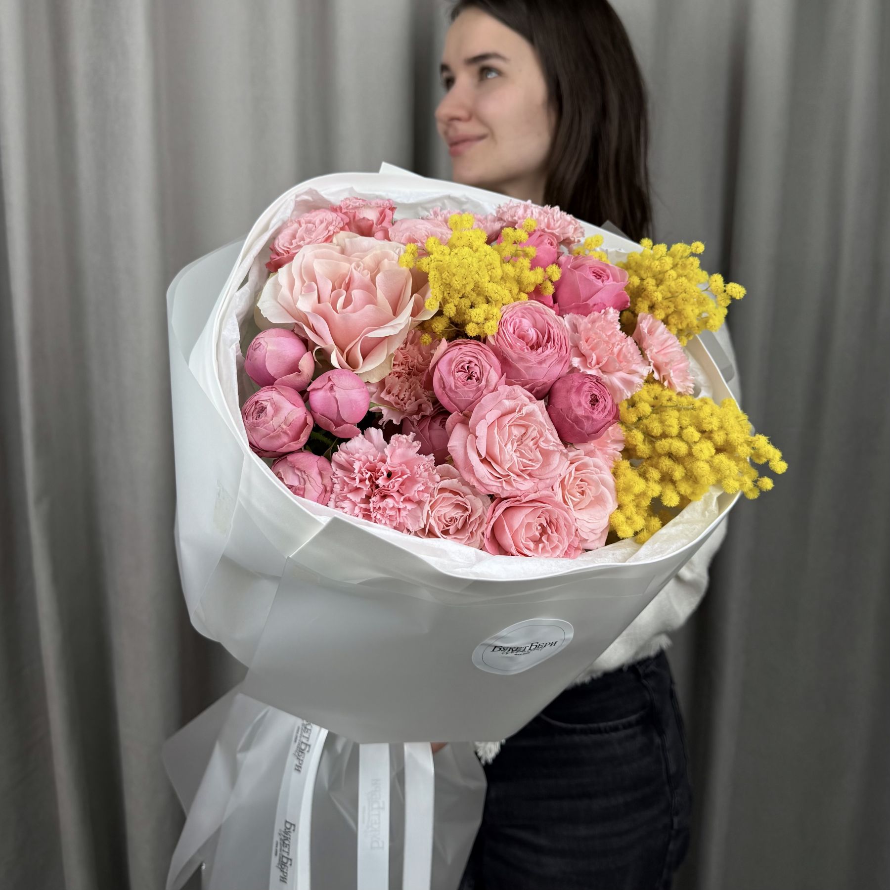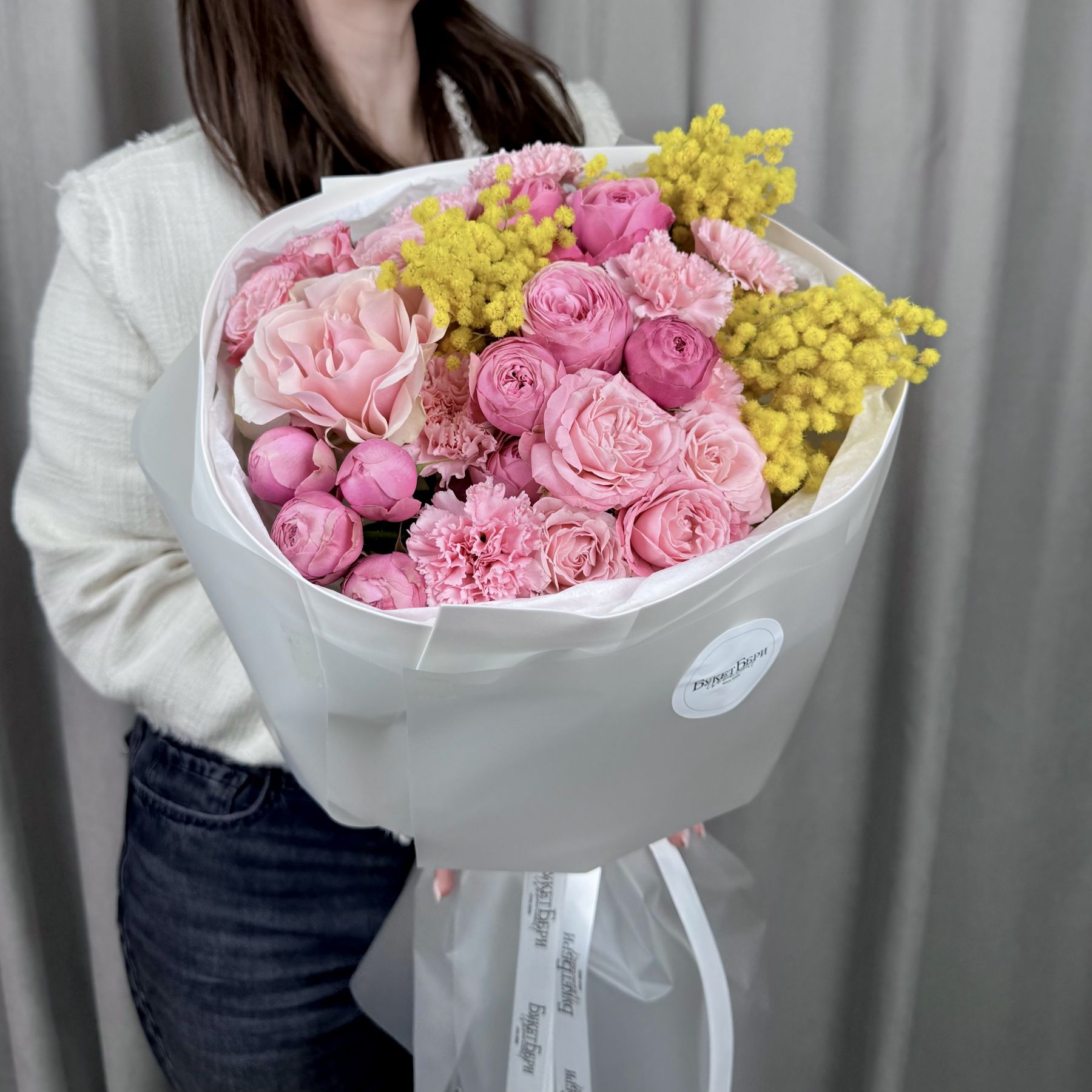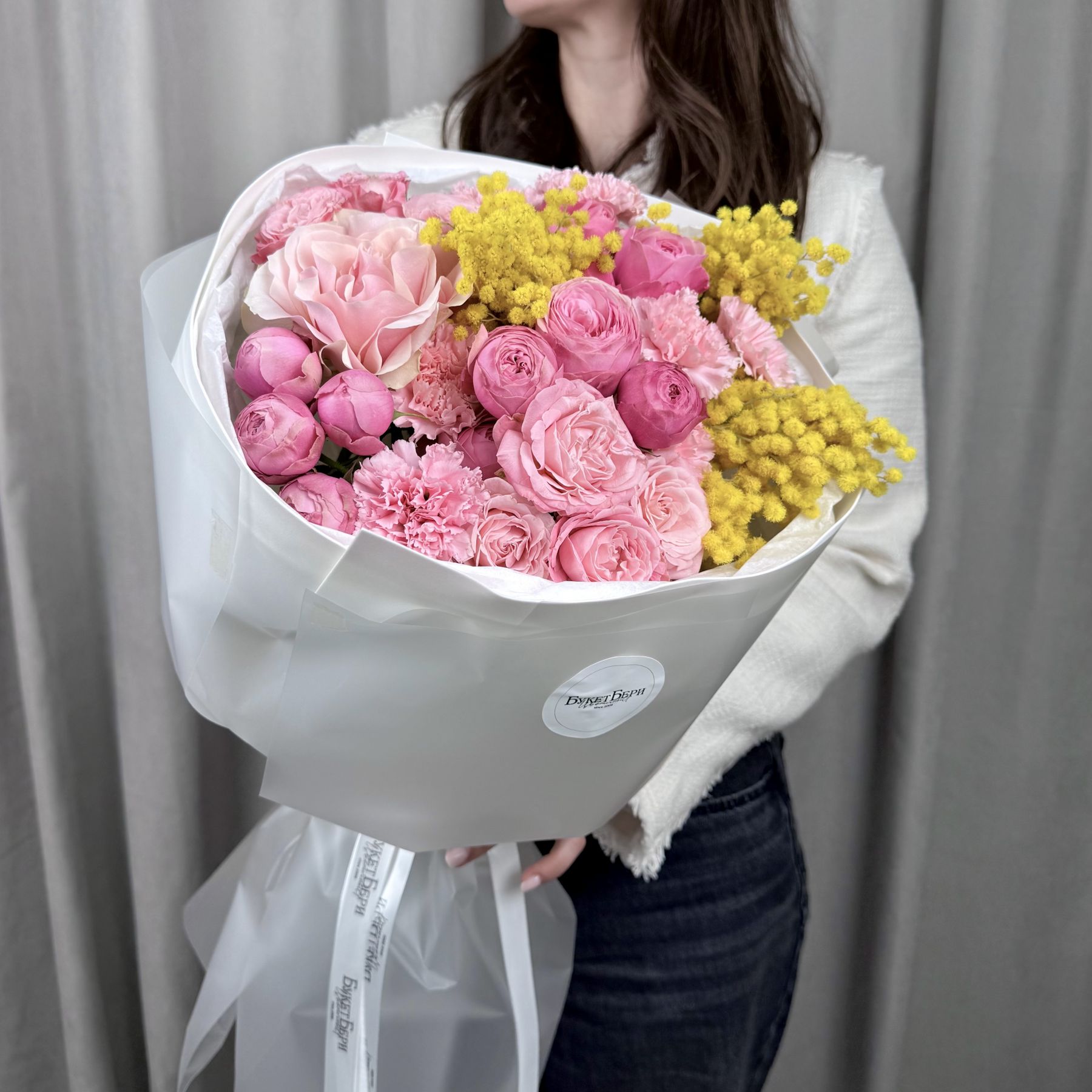 Яркий весенний букет с розами кустовыми пионовидными, французской розой, диантусами и мимозой на штажках в трендовой упаковке.