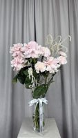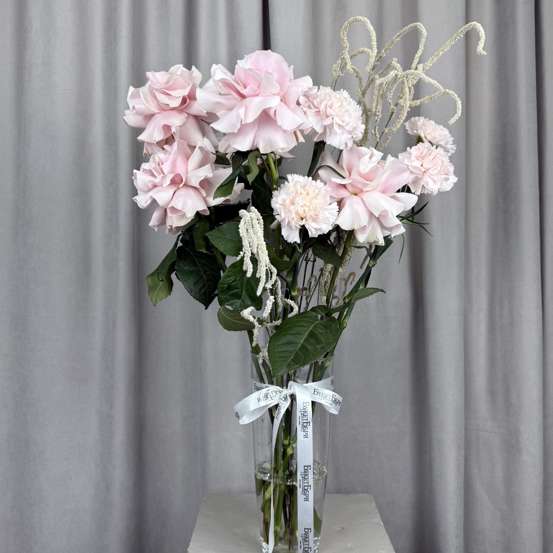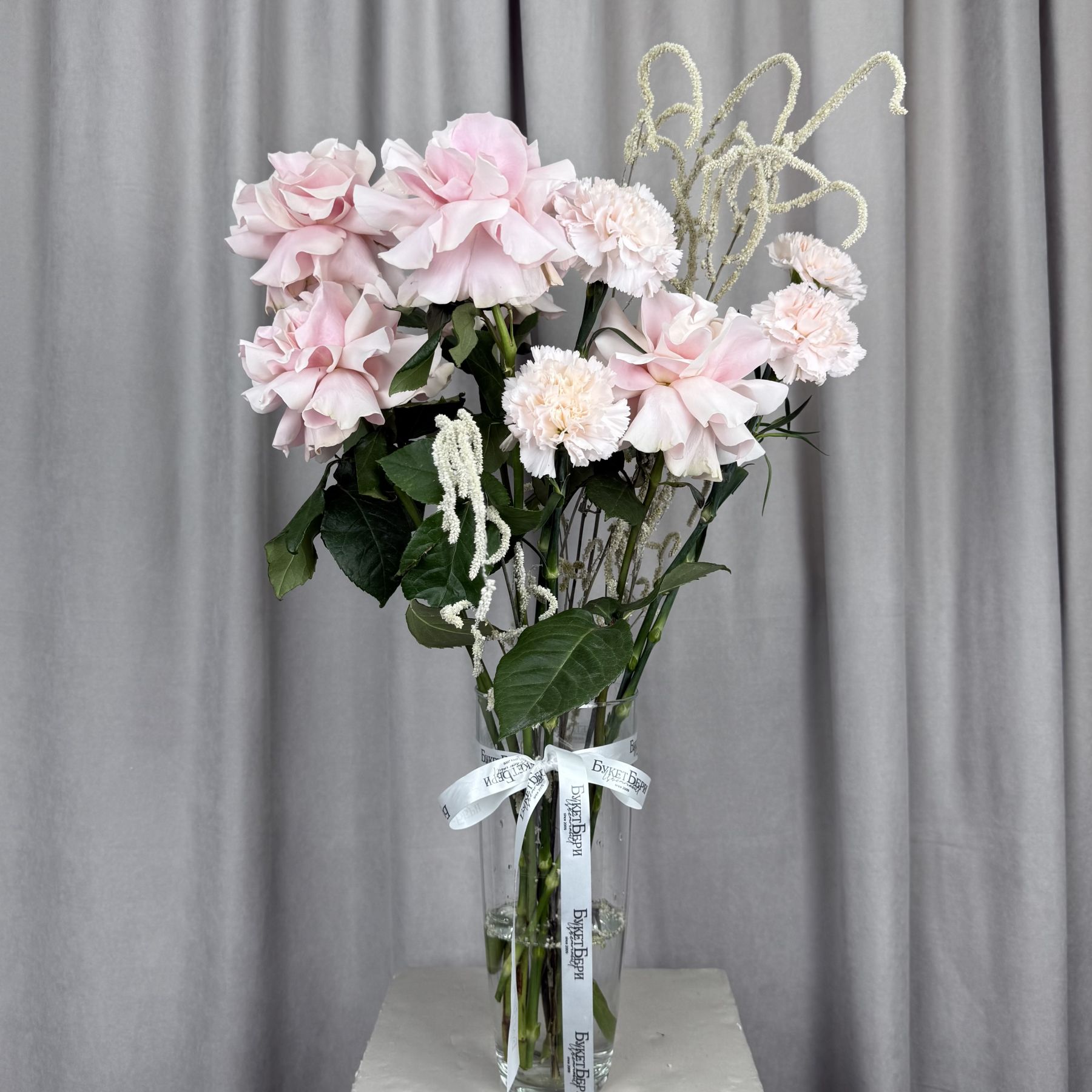 Нежный интерьерный букет в розовых оттенках: розовая французская роза, диантус и воздушный амарант.