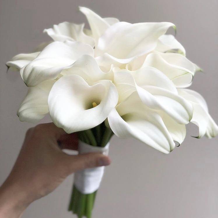 Букет «Элегия в белом 2» — увеличенная свадебная композиция из 19 белых калл, собранных под ленту. Стильный, лаконичный и элегантный акцент, подчёркивающий чистоту и изящество образа невесты.