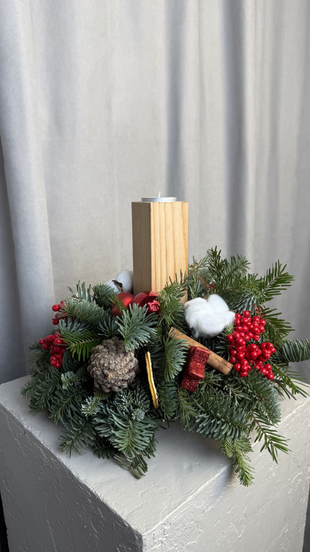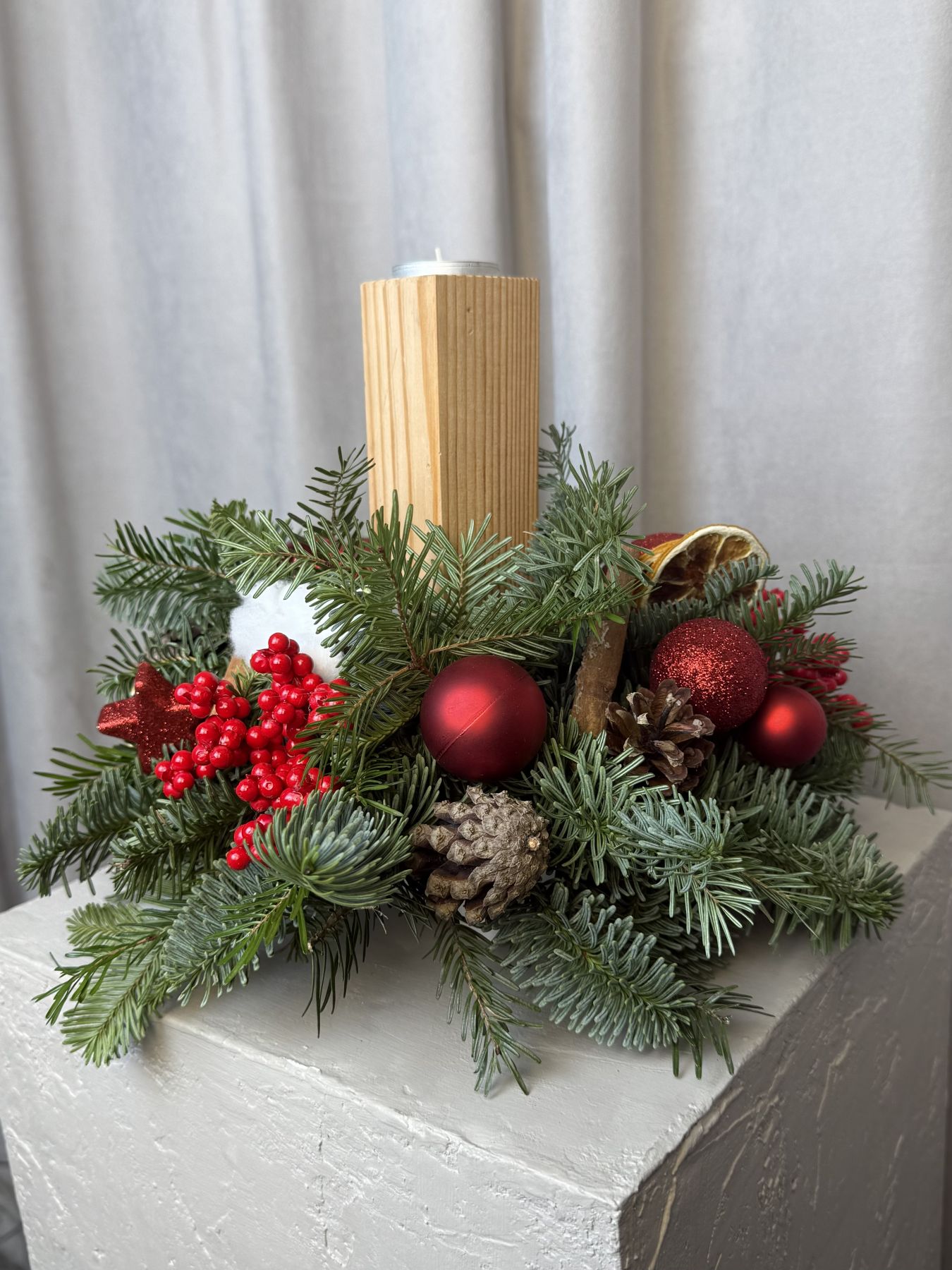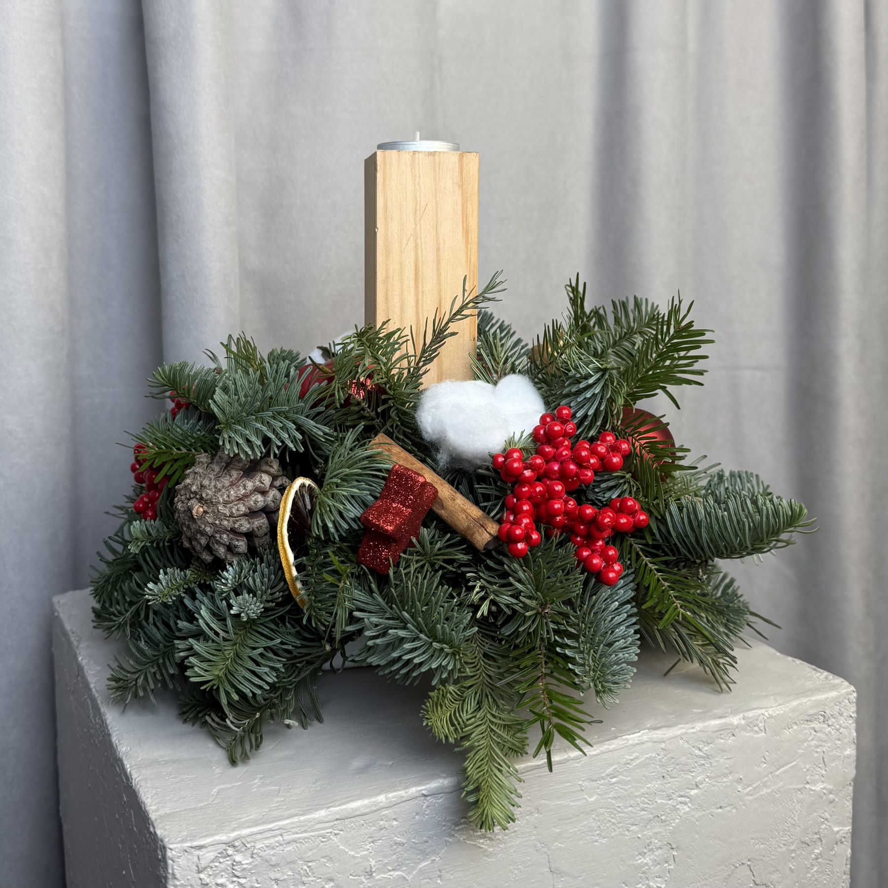 Новогодняя композиции из живой пихты с деревянным подсвечником и новогодним декором из игрушек, шишек, корицы, апельсина, Илекса