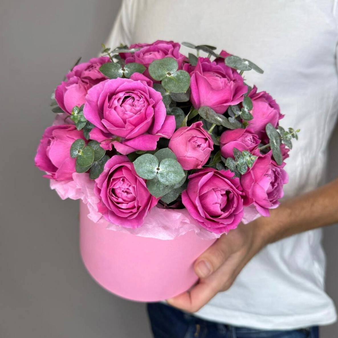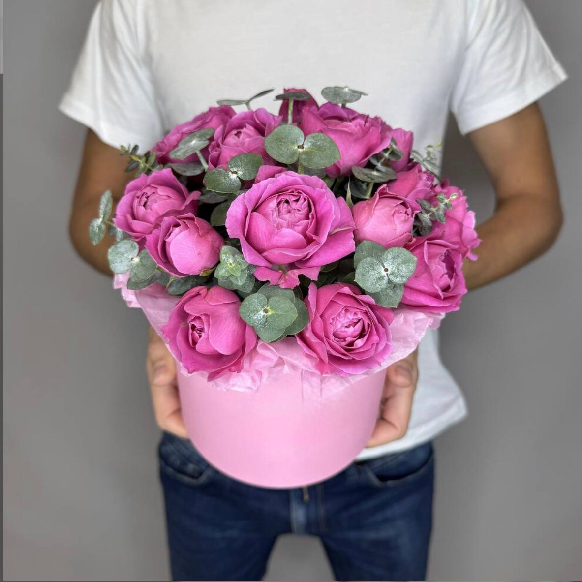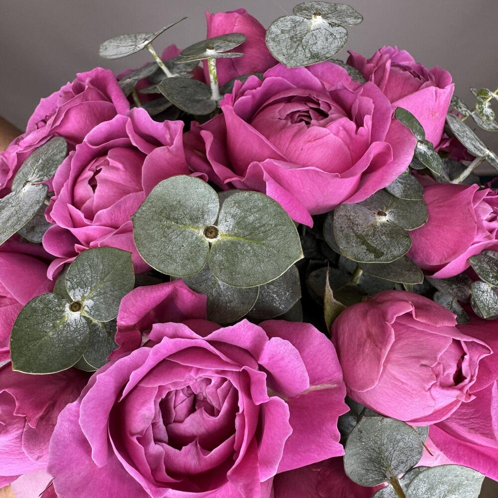 Состав: Розы кустовые пионовидные - 5 штук Эвкалипт - 2 штуки Размер: 20х20