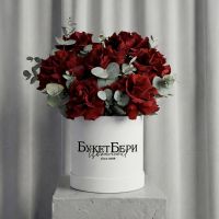 Сборная коробочка с красными французскими розами и ароматным эвкалиптом в красивом оформлении.