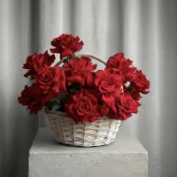Потрясающая большая корзинка с красными французскими розами в красивом оформлении.