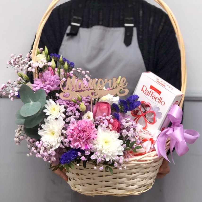 Подарочная корзина с цветами, рафаэлло и тематическим топпером.