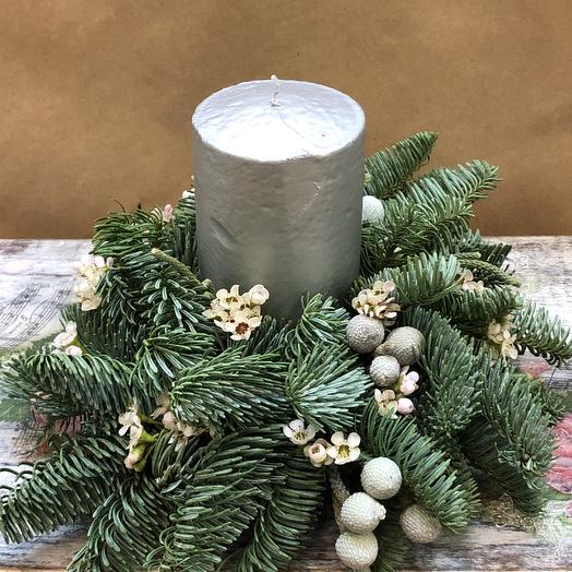 Состав: свеча, еловые веточки, декор, поддон, оазис, хамелациум.