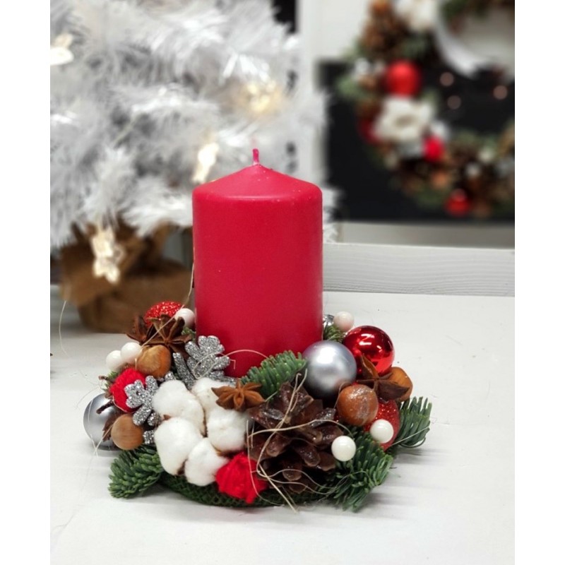 Состав: кашпо, свечи, еловые ветки, декор. Высота 20 см.
