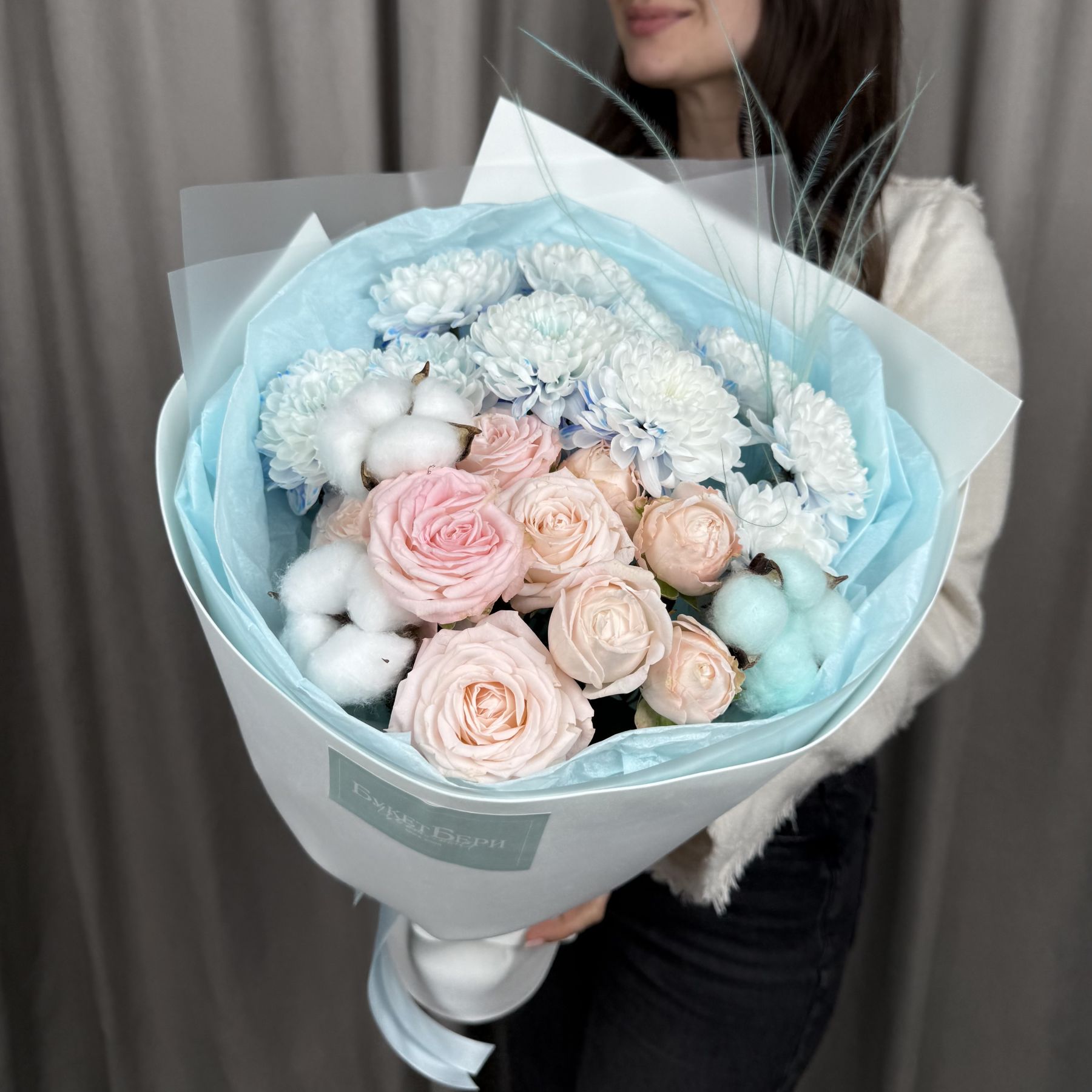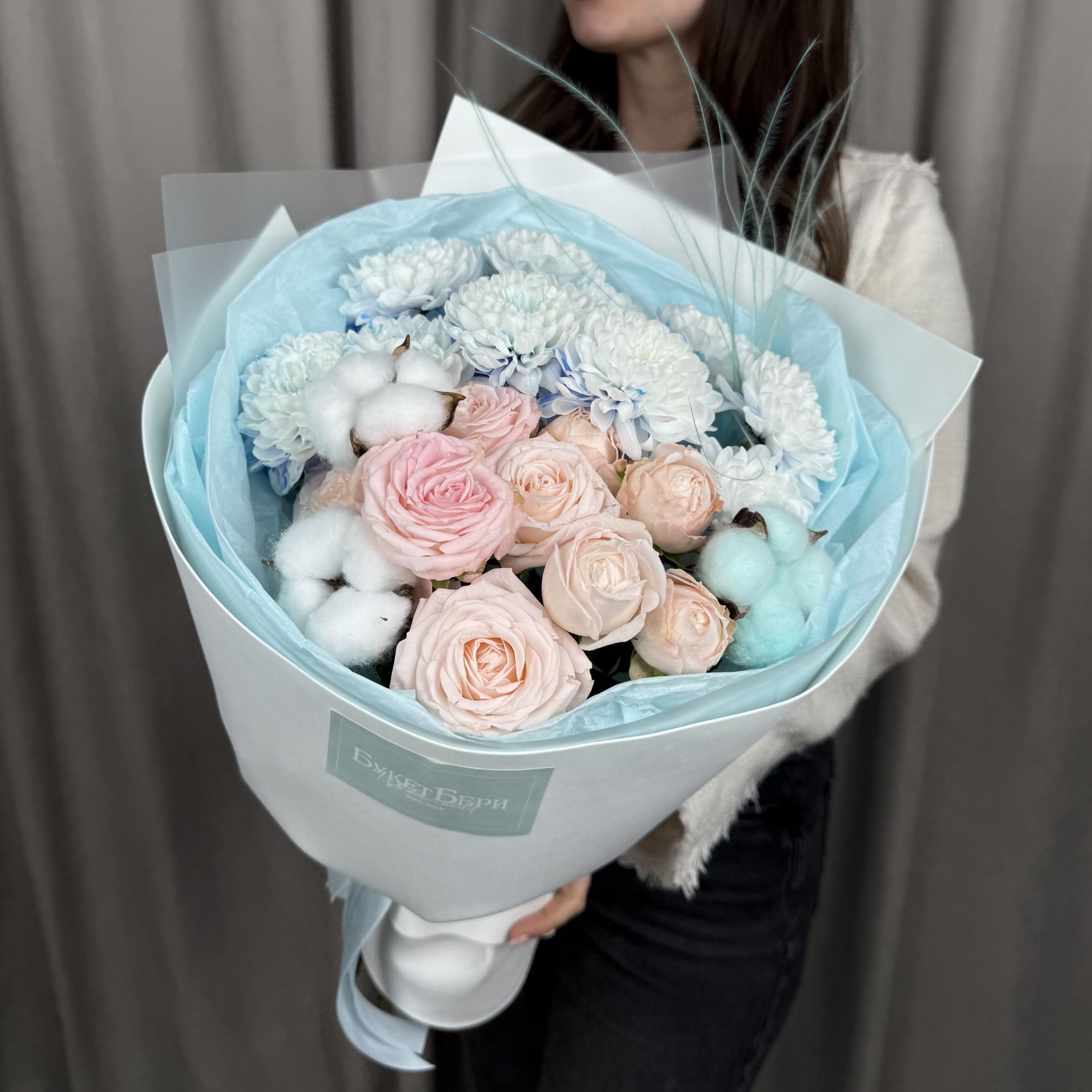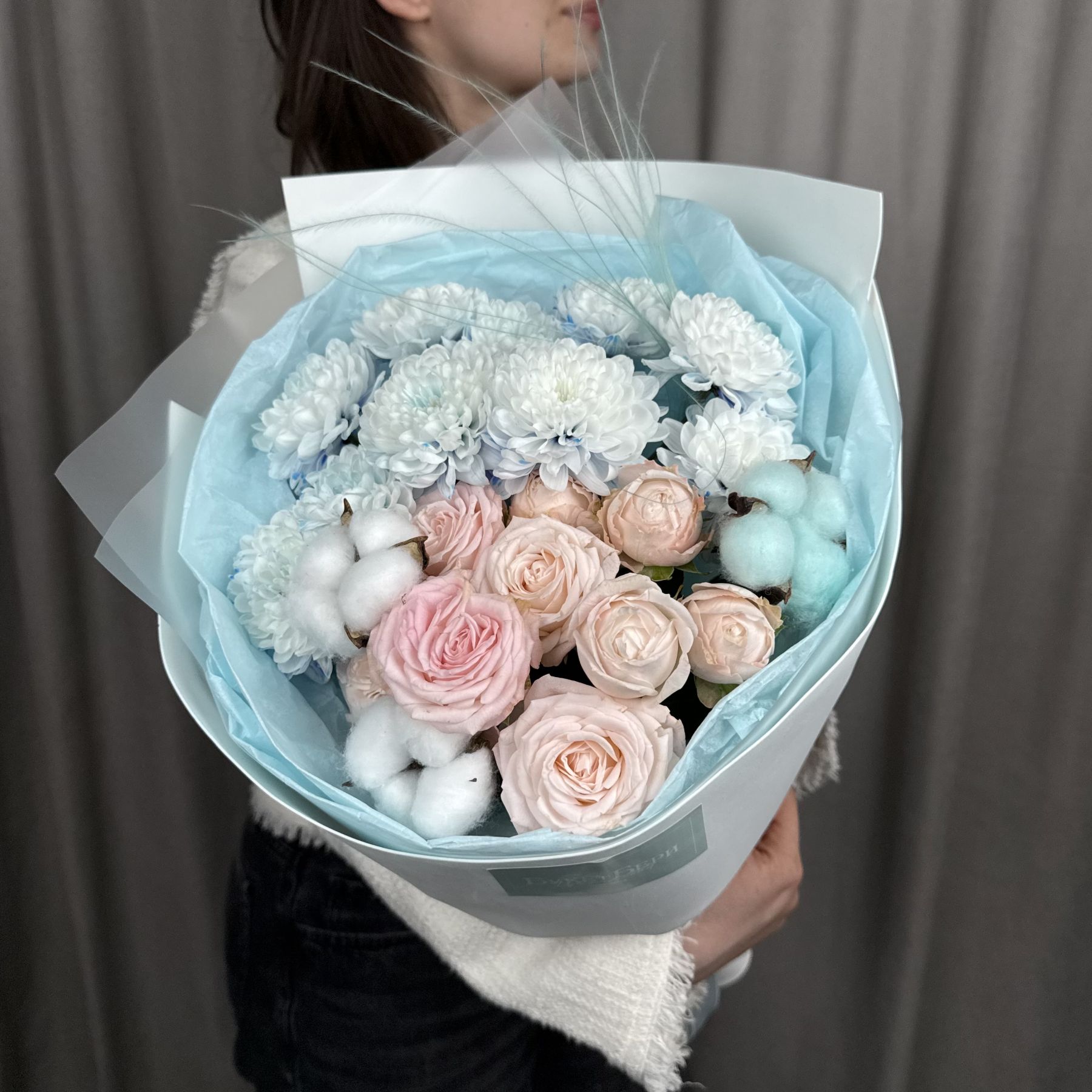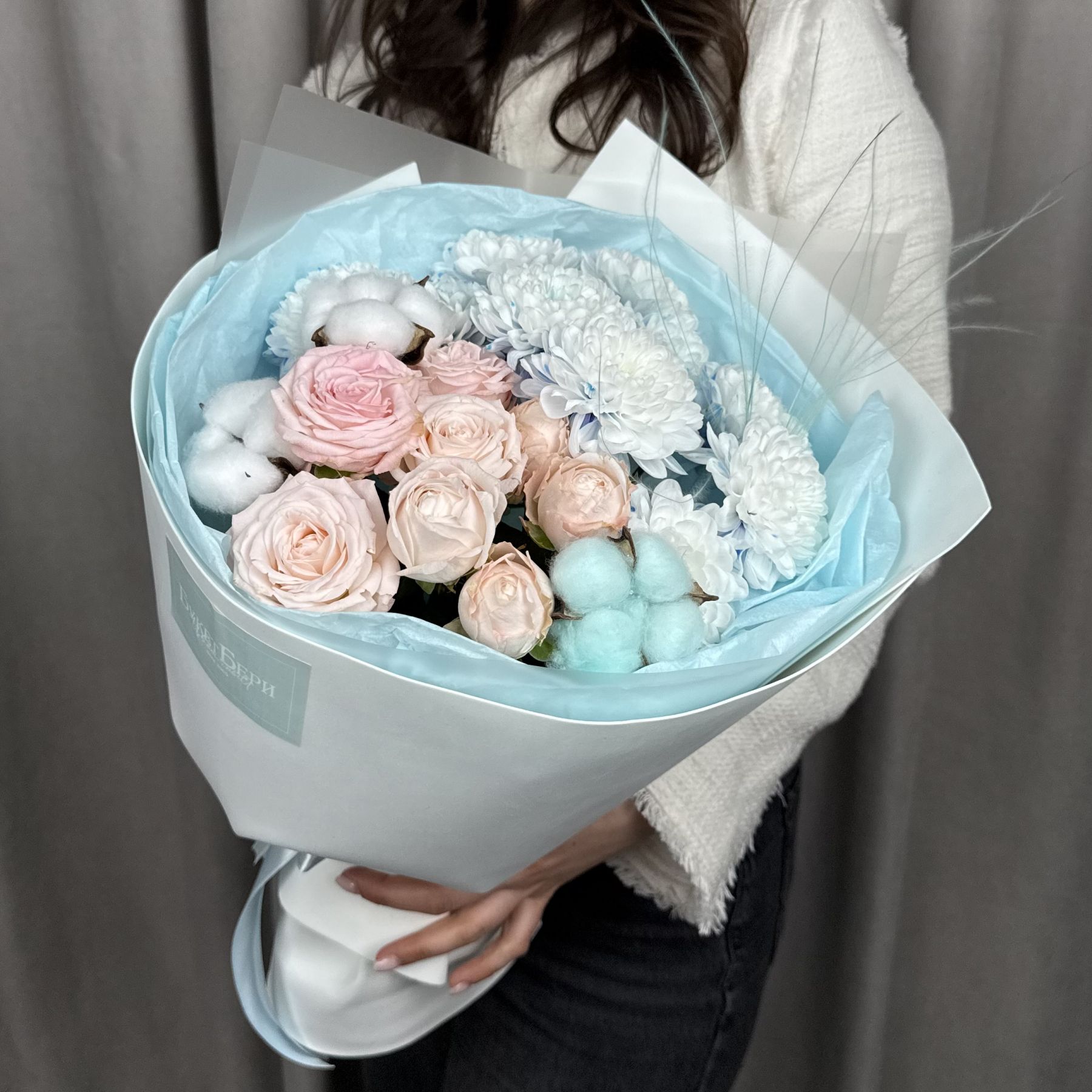 Милый букет с нежными розочками, хлопком и гортензией в трендовой упаковке.