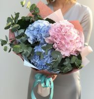 Монобукет из розовой и голубых гортензий с добавлением веточек эвкалипта в красивой упаковке.
