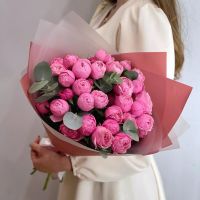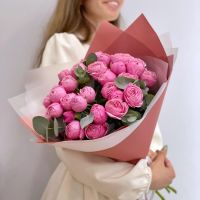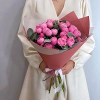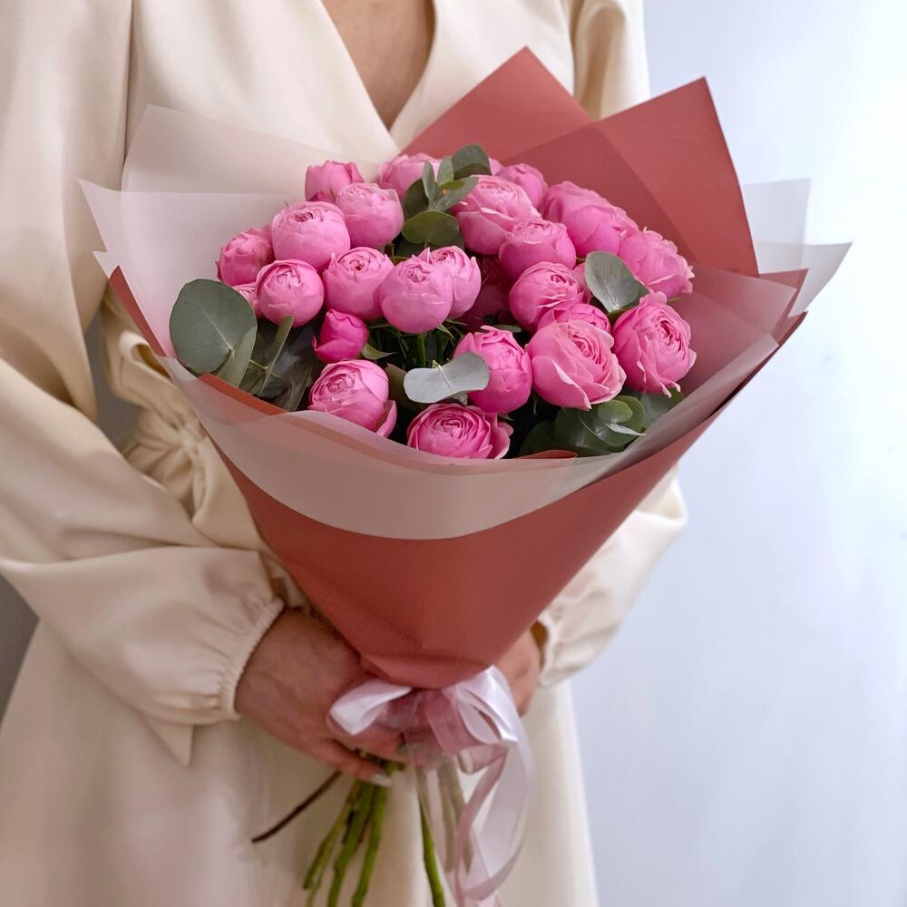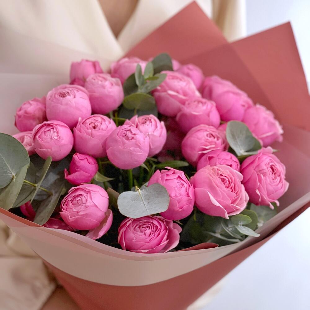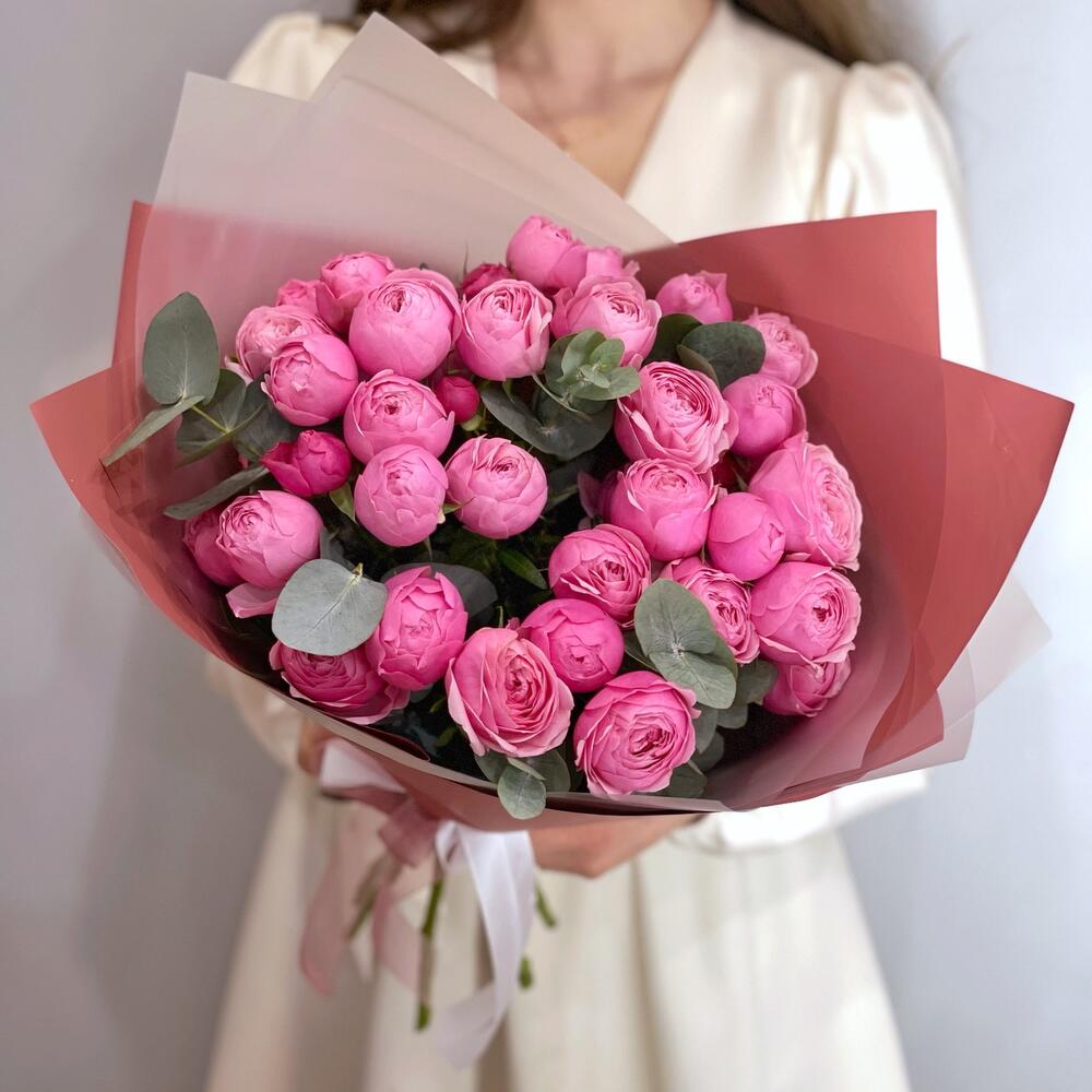 Розы кустовые - 7 штук Дизайнерская упаковка - 2 шт эвкалипт - 5 шт Размер: 30см х 60см