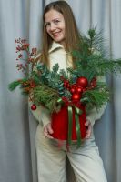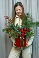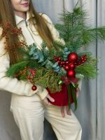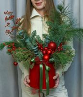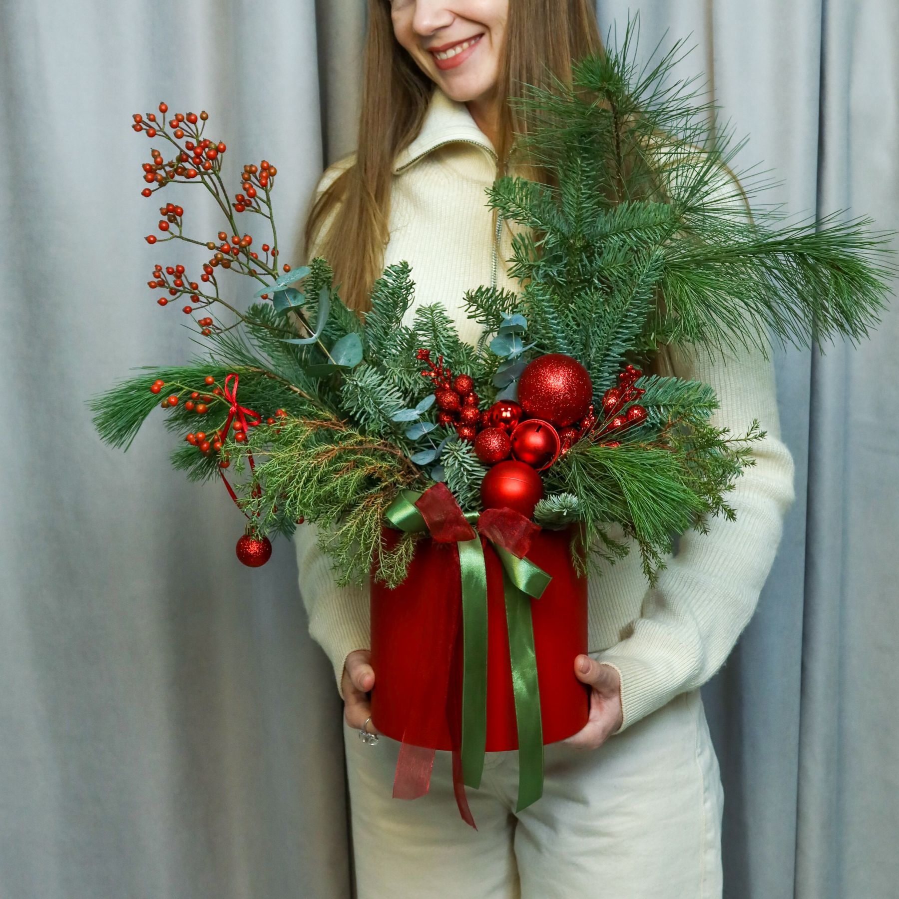 Новогодняя хвойная композиция в красной коробке: натуральная пихта, сосна, кипарис, эвкалипт, шиповник, декоративные красные ягоды и шарики, украшенные атласными лентами.