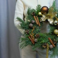 Новогодний венок из свежей хвои с ароматными палочками корицы, мини-шишками кипариса, украшенный золотыми и бронзовыми шарами, ягодами и сушёным цитрусом для уютной праздничной атмосферы