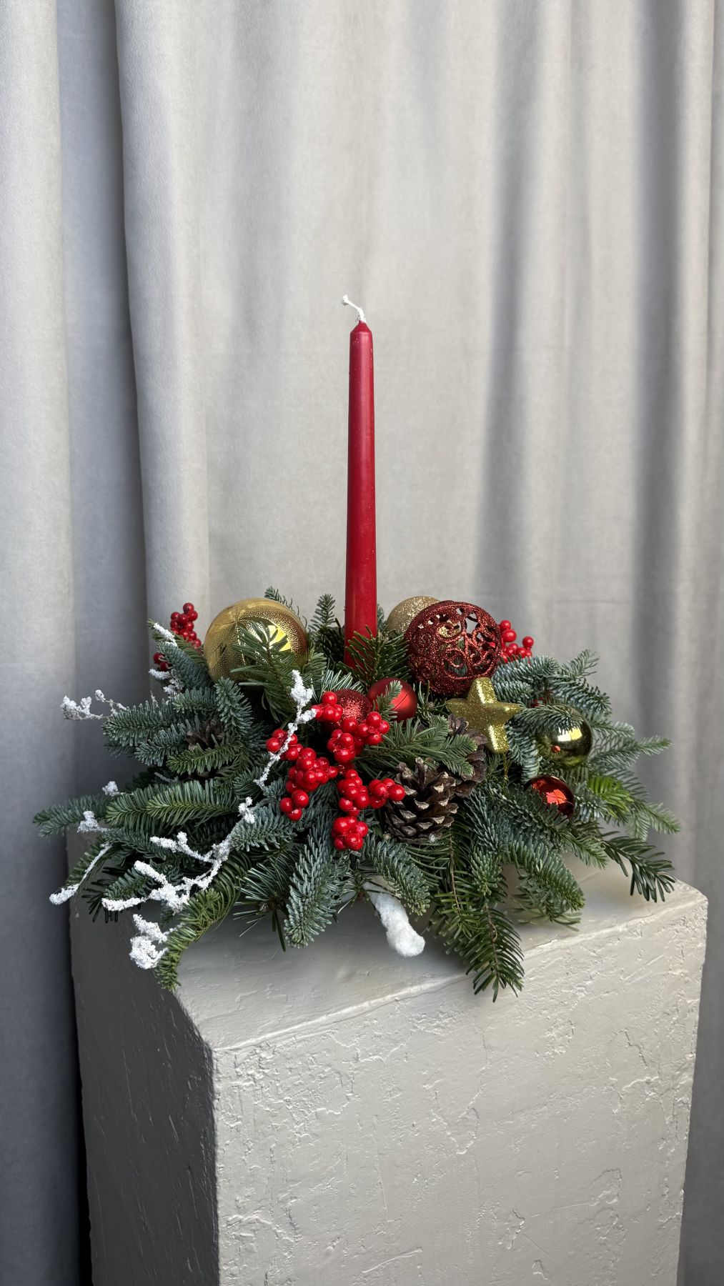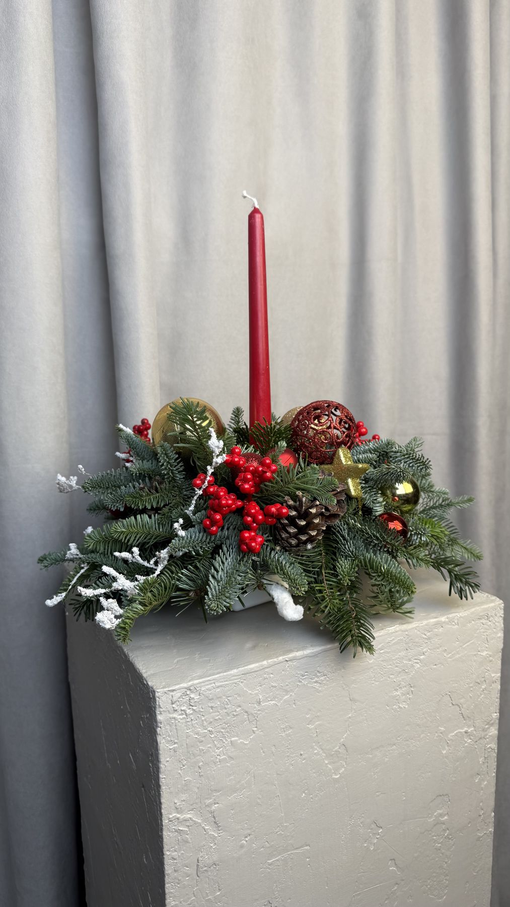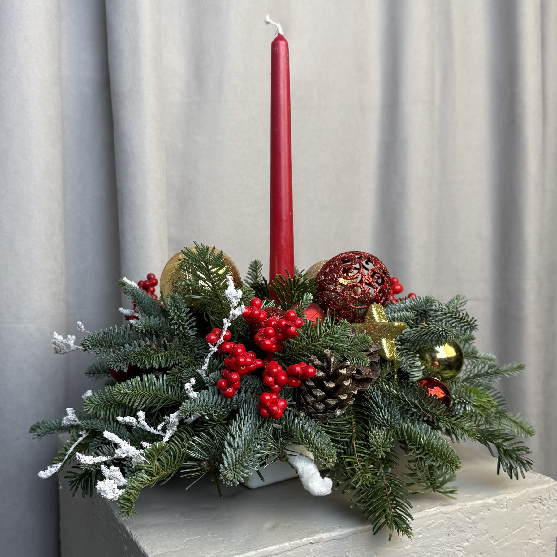 Новогодняя композиция с красной свечей, пихтой гладкой и пихтой нобилис, игрушками, искусственным илексом и шишками