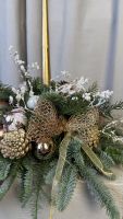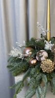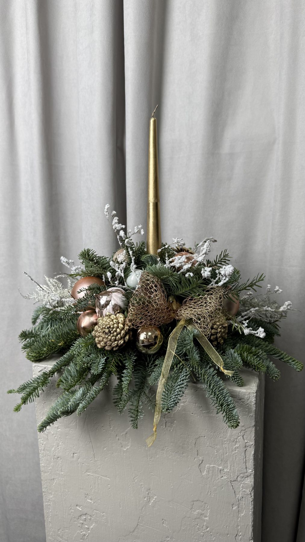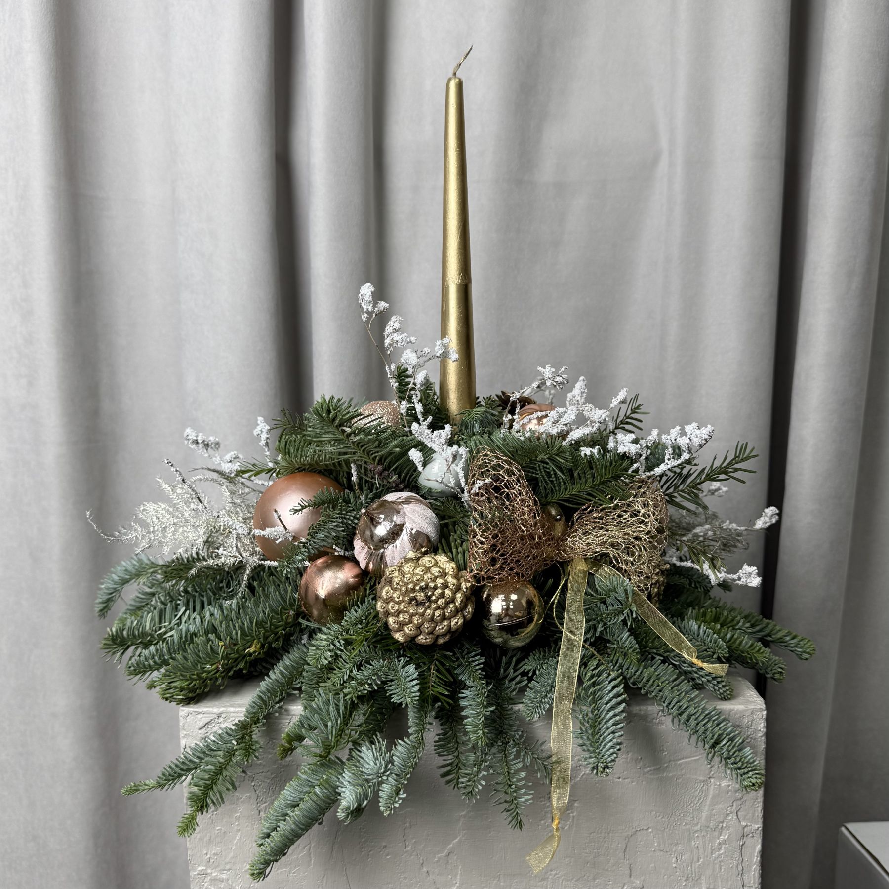 Новогодняя композиция из живой пихты со свечей и розово-золотых оттенках.
