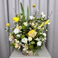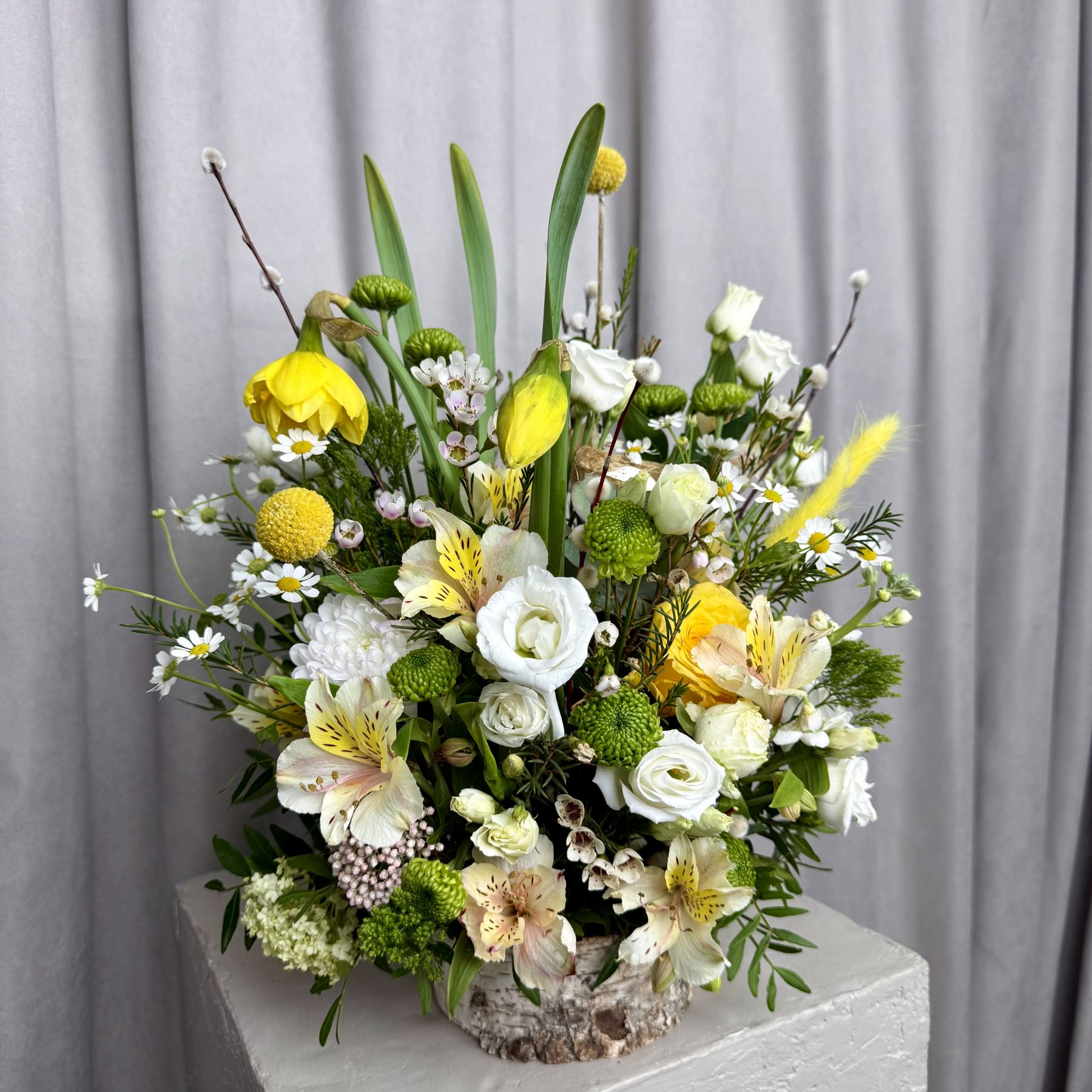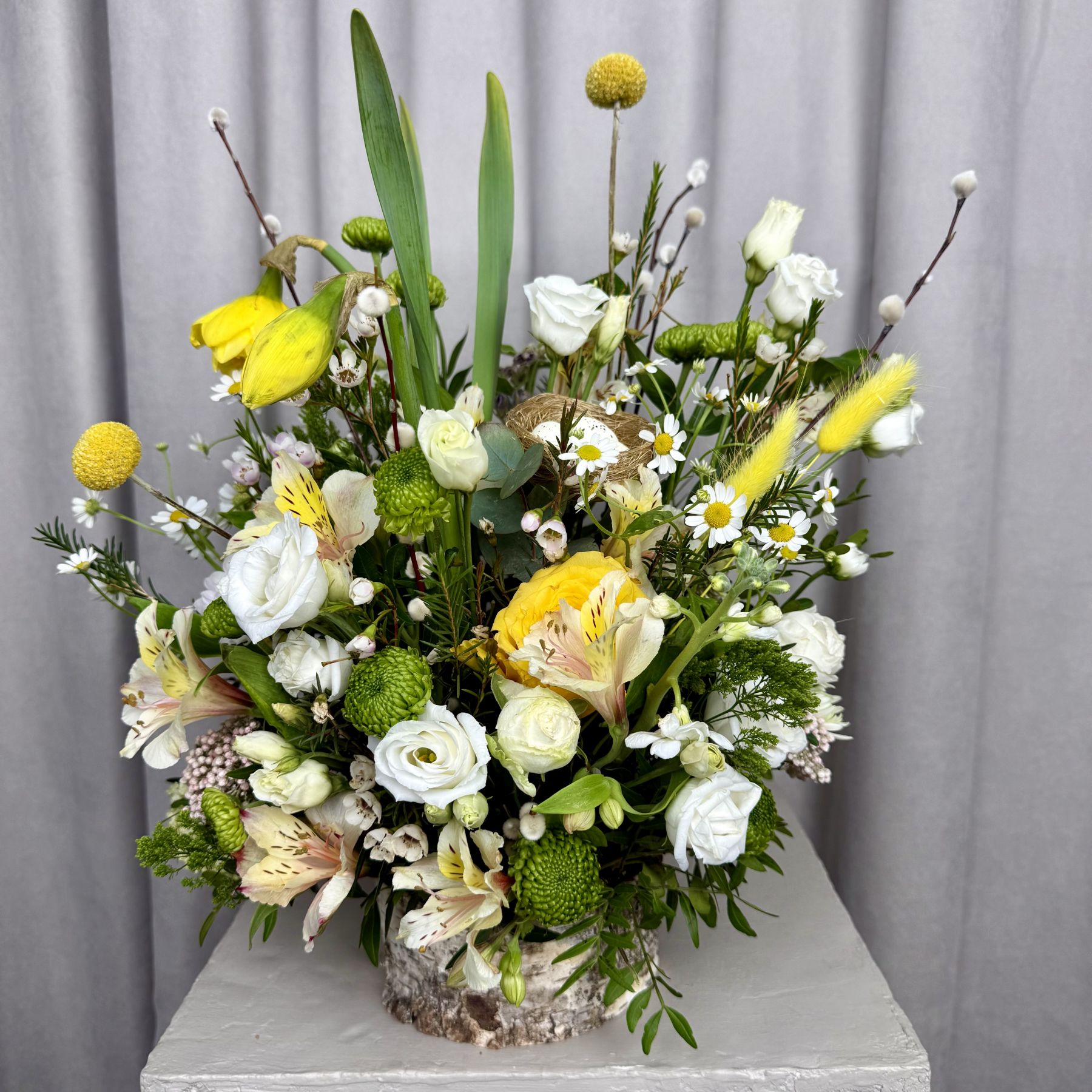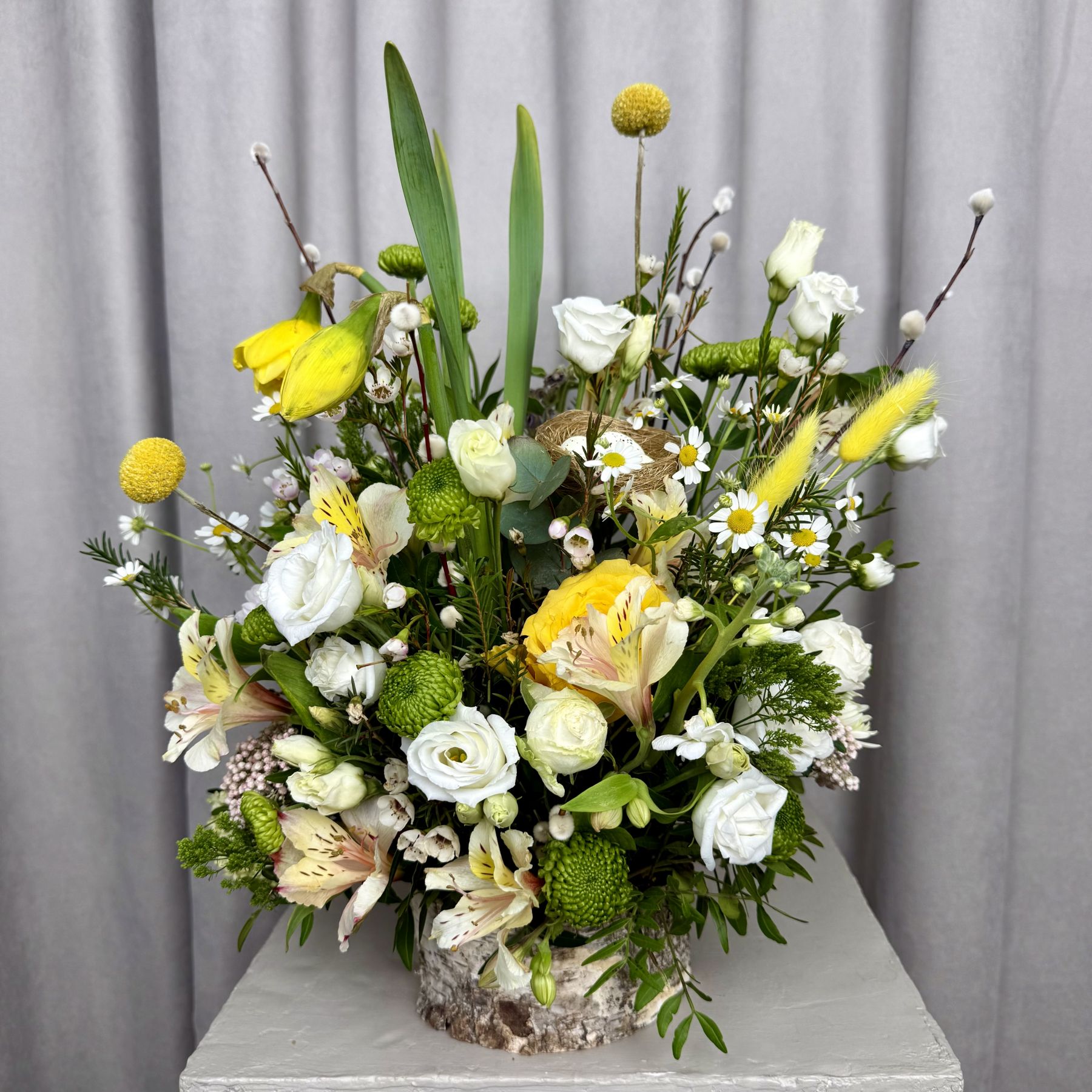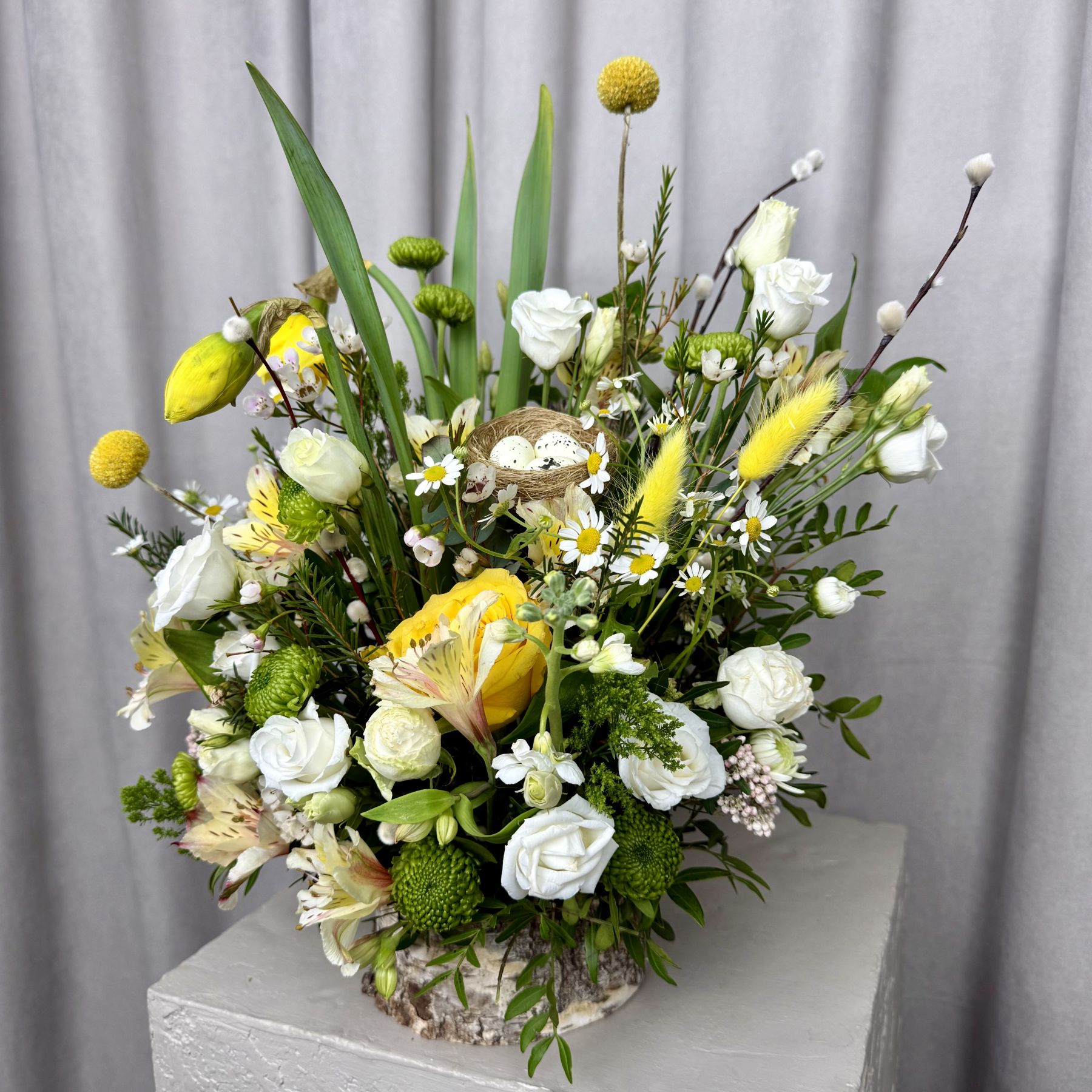 Камилла, краспедия, ваксфлауэр, нарциссы, хризантема, эустома, лагурус, альстромерия, березовая кора, декоративное гнездо с яйцами.