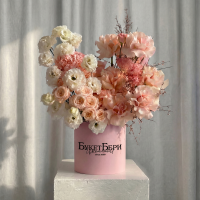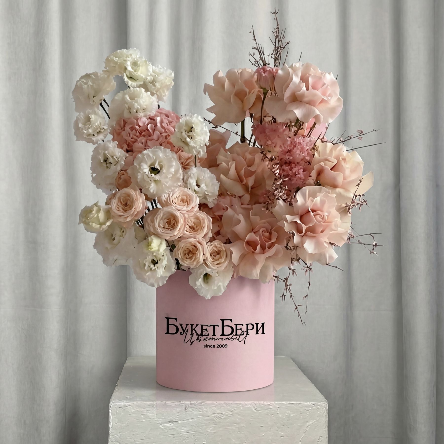 Сборная большая коробка из французских роз, ароматной генисты, гортензией, кустовых пионовидные роз и эустомы в красивом оформлении.
