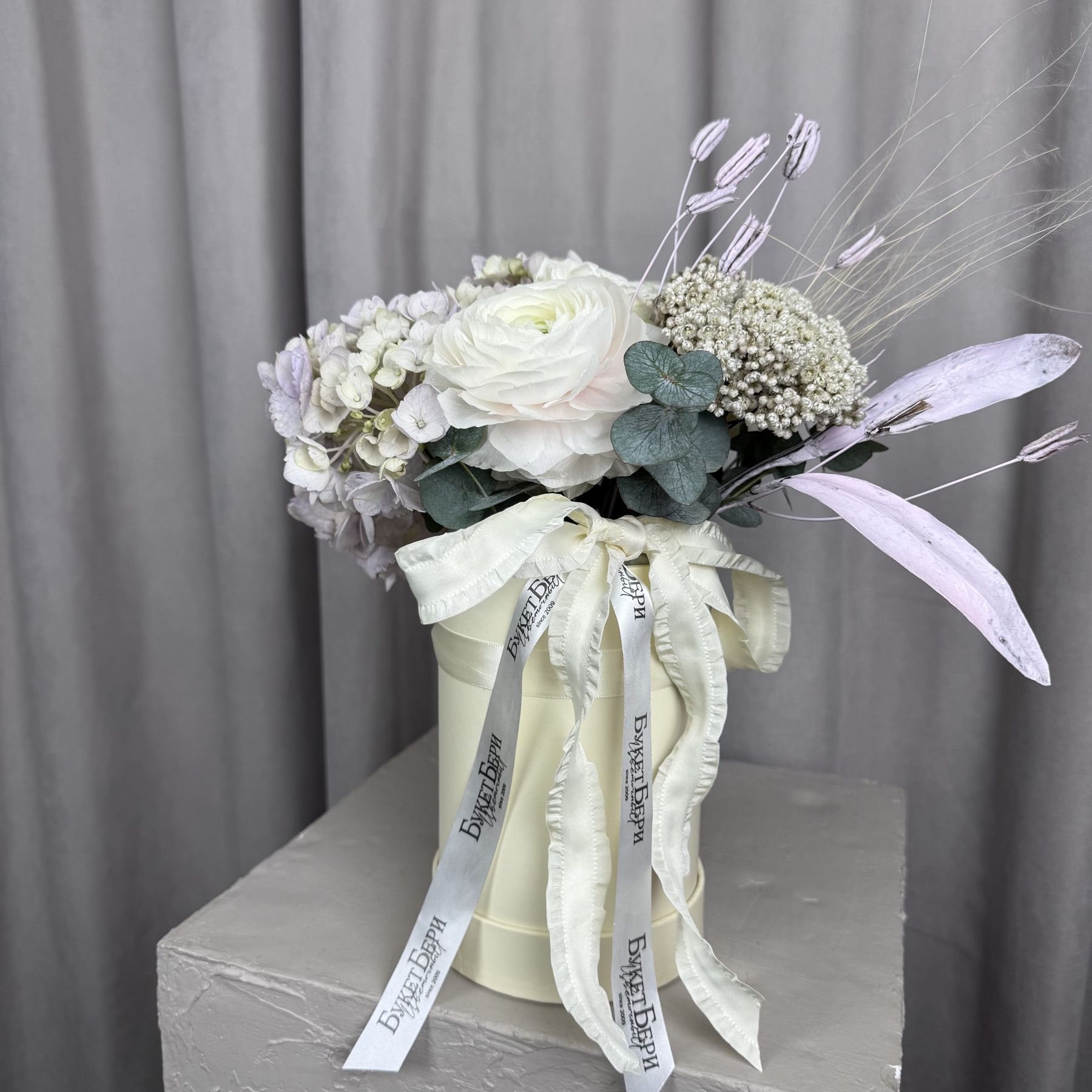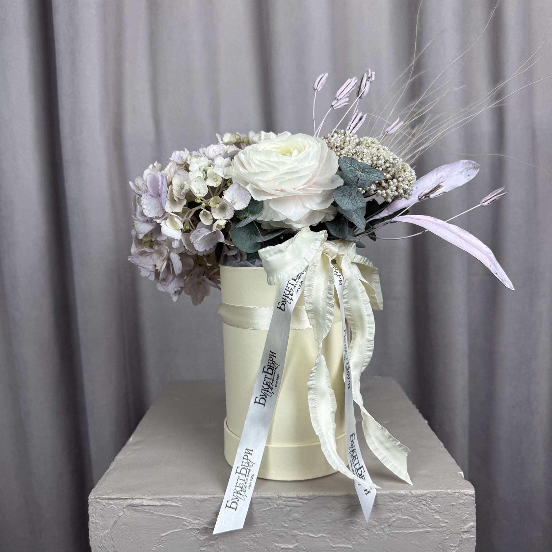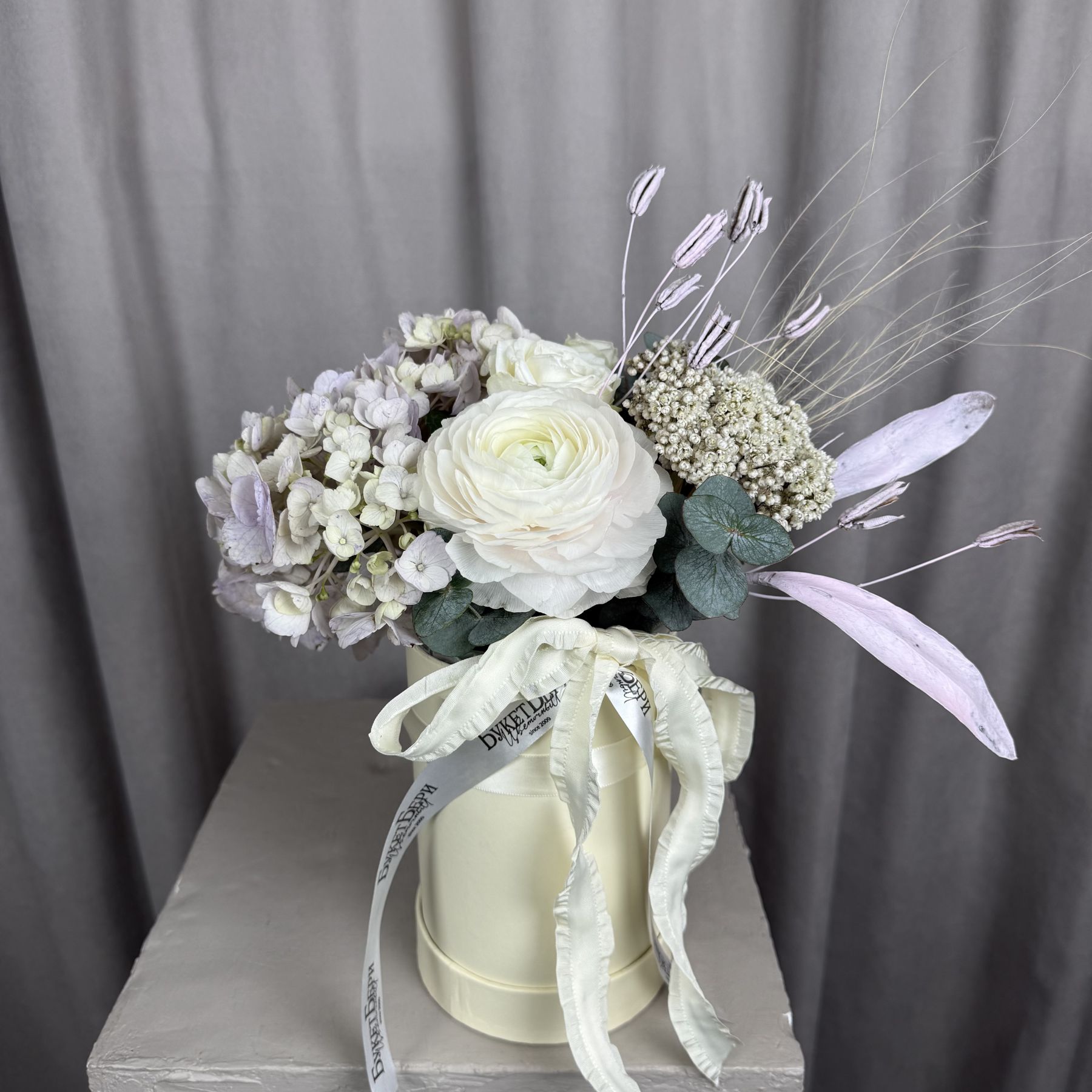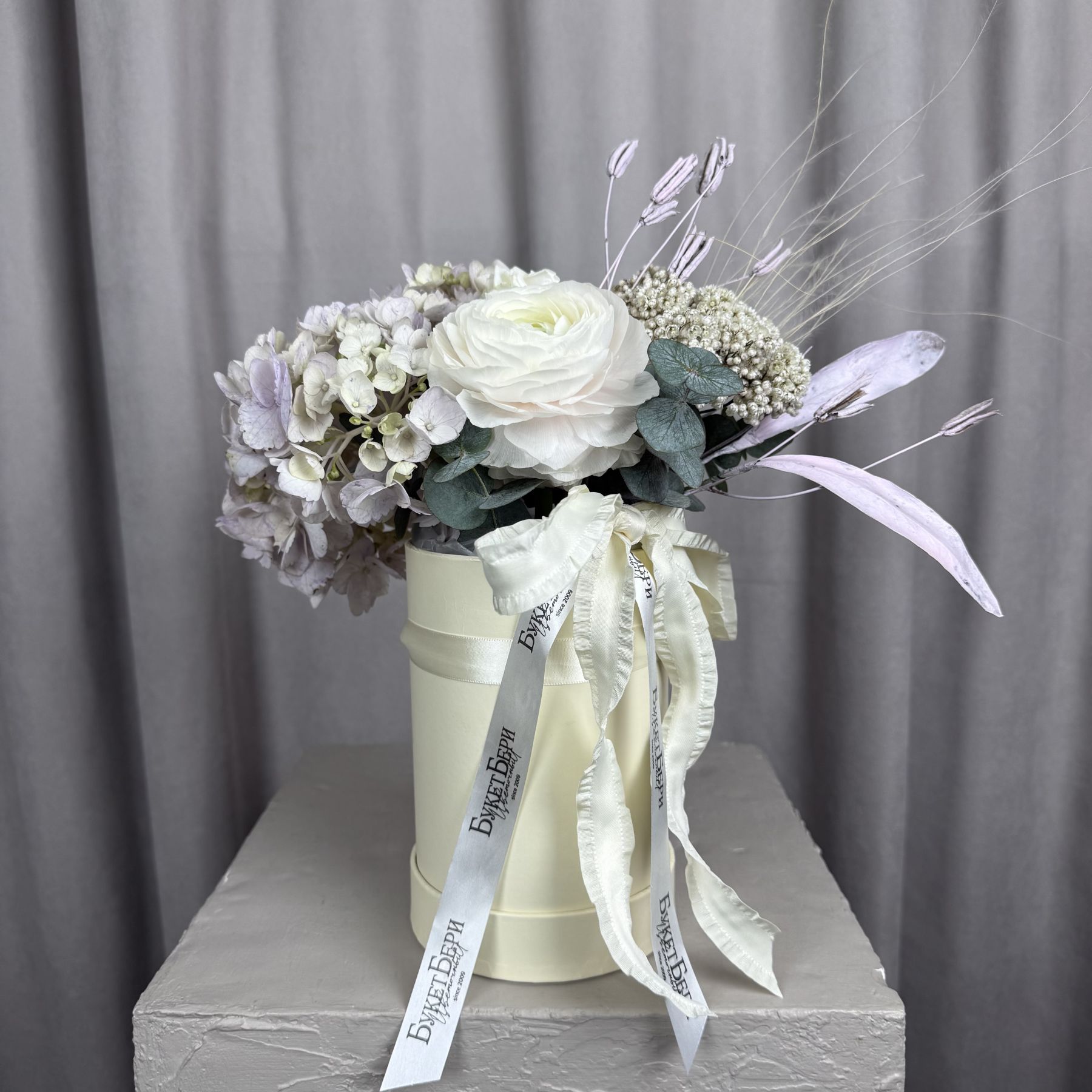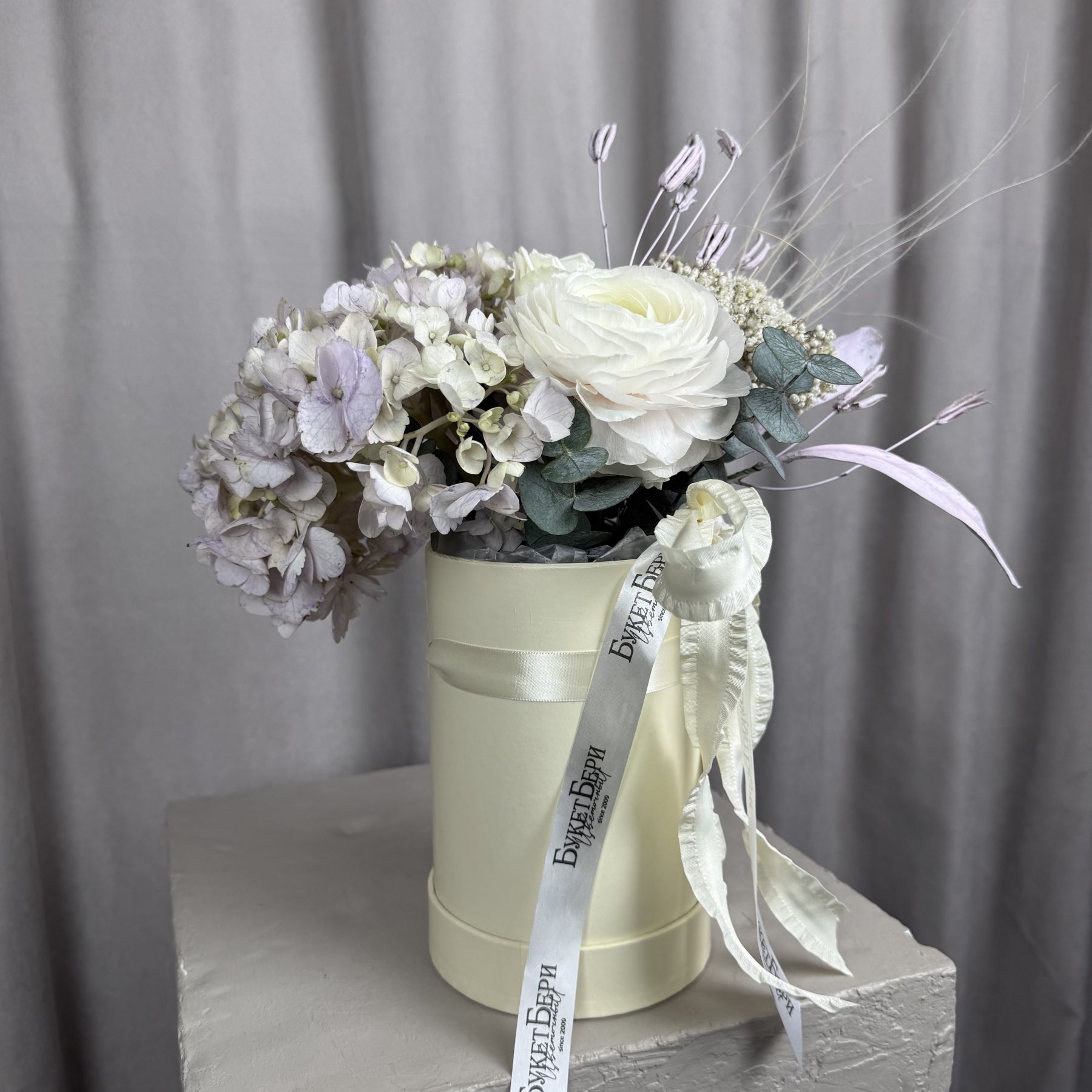 Красивая коробочка в желто-сиреневых оттенках с гортензией, розами и ранункулюсом.
