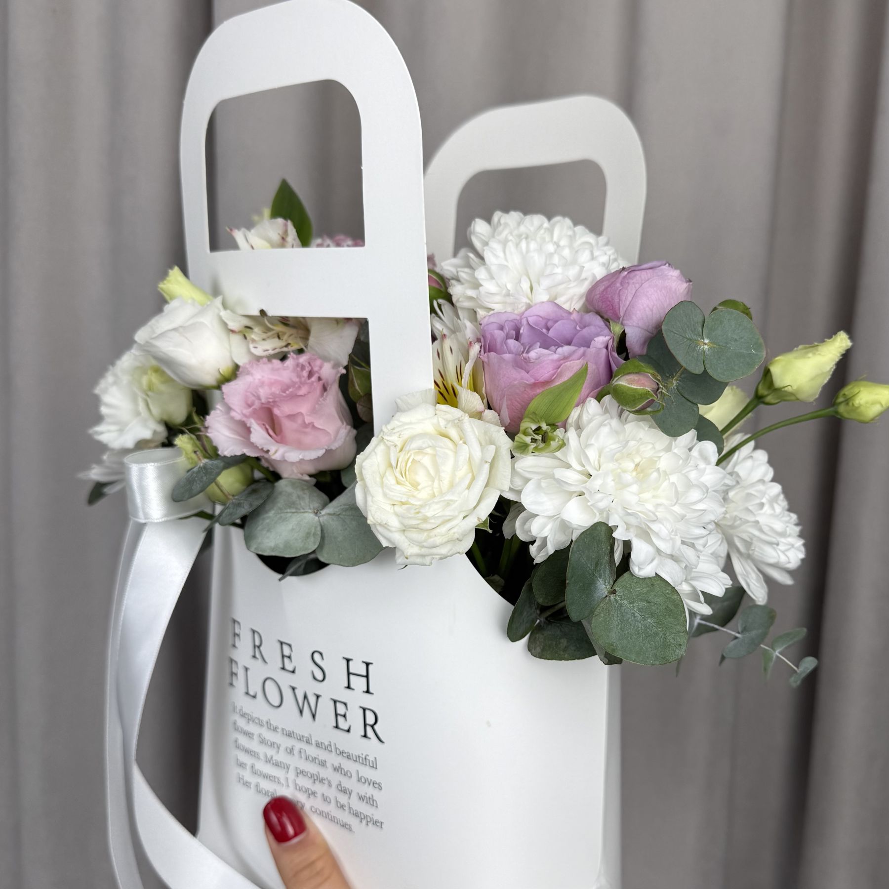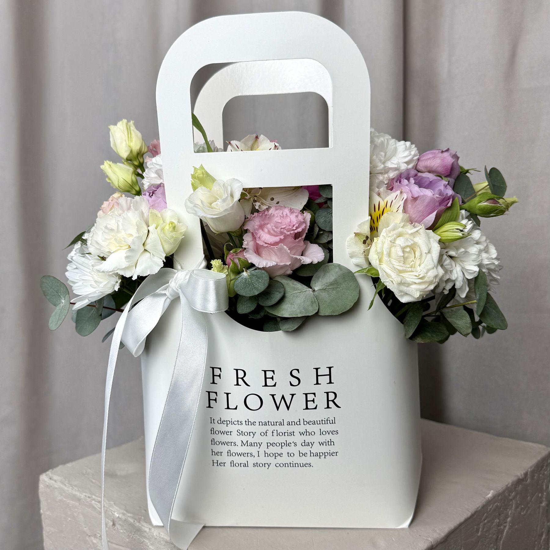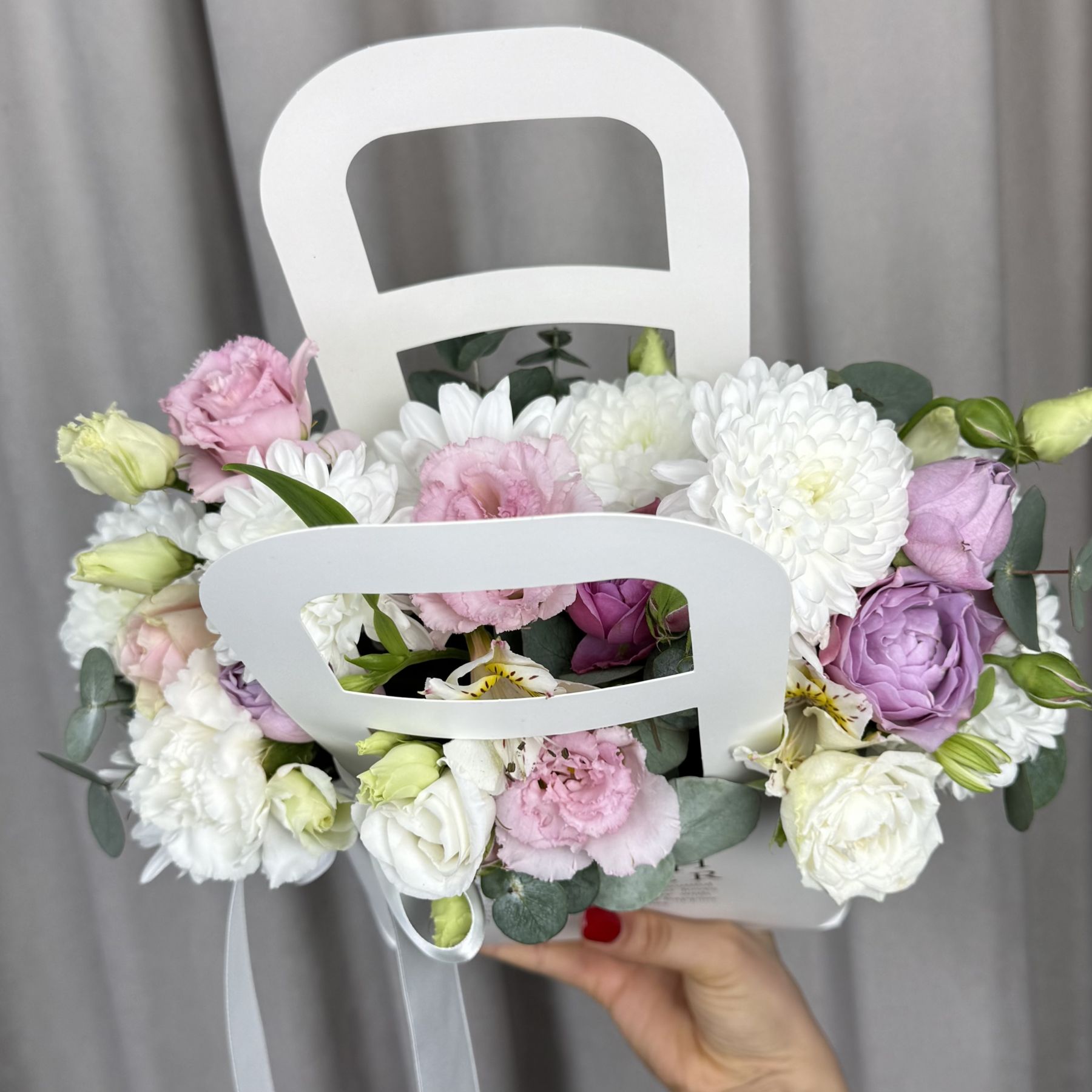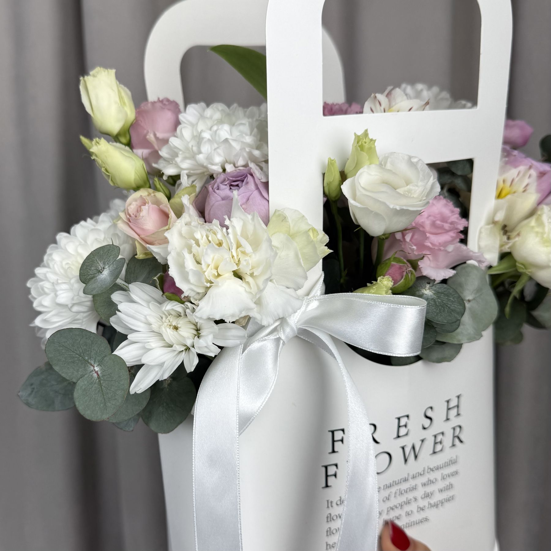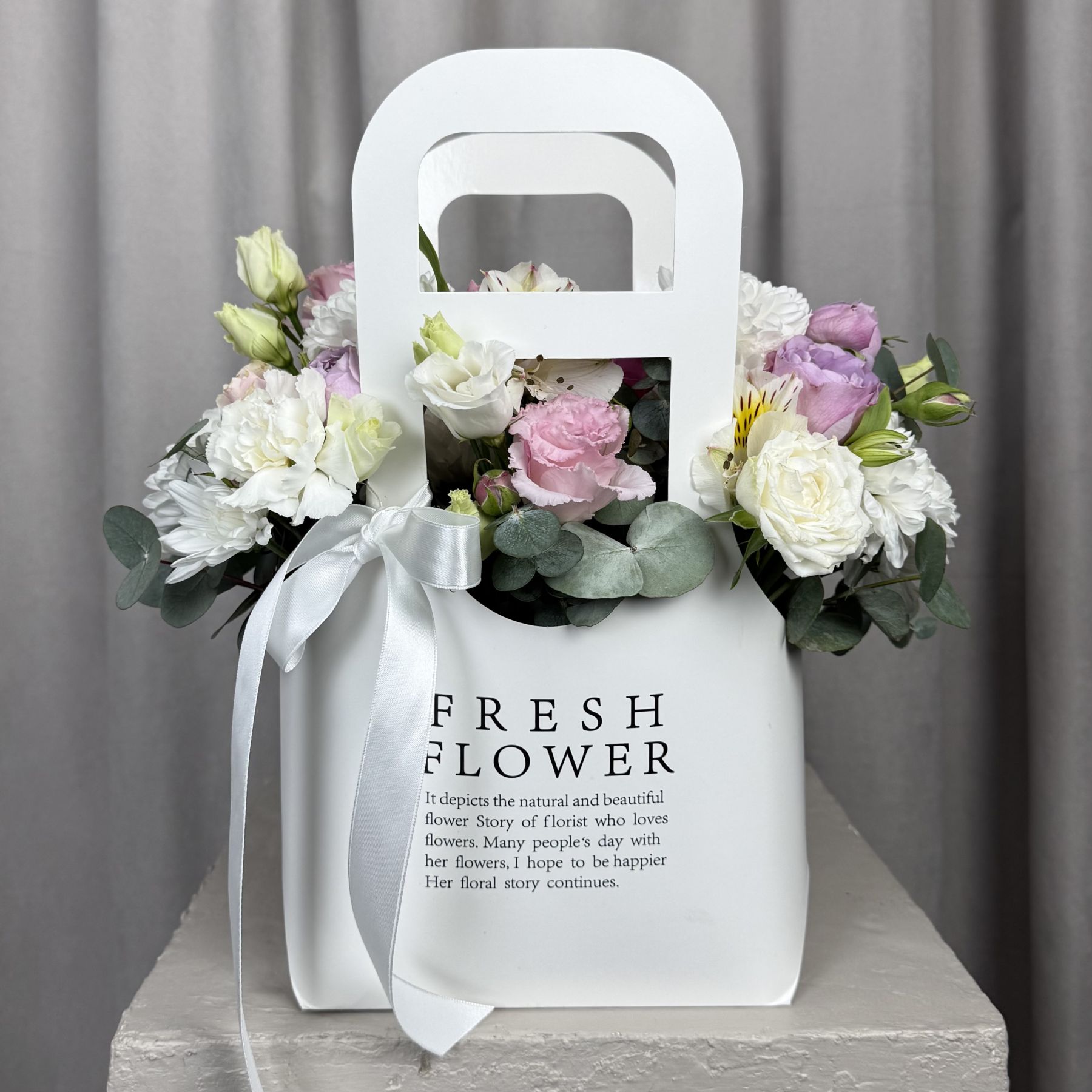 Сборная нежно-розовая сумочка с хризантемой, альстромерией, диантусом, розой и эвкалиптом.
