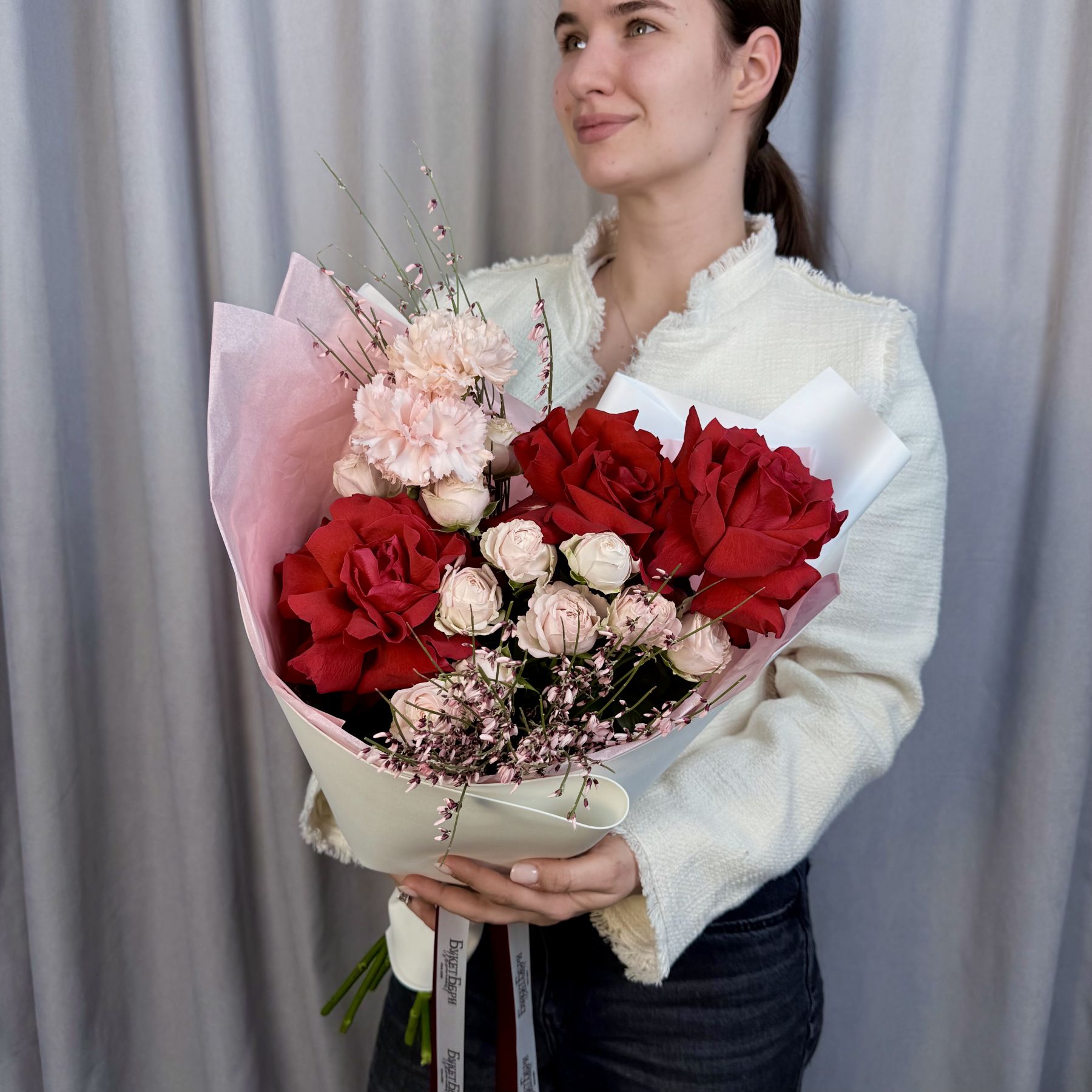 Сборный букет из французских и кустовых роз, ароматной генисты и диантуса в упаковке.