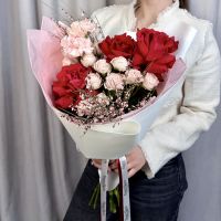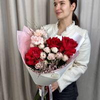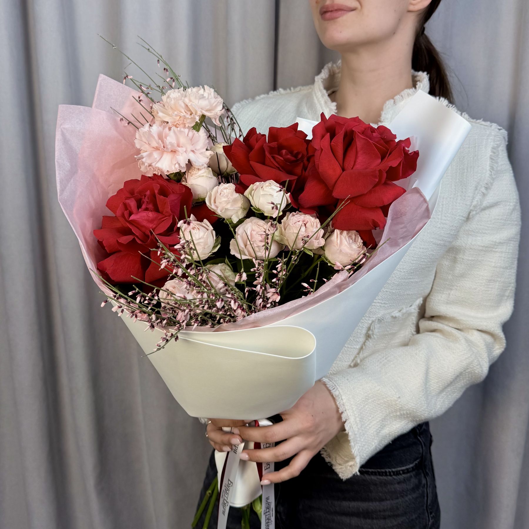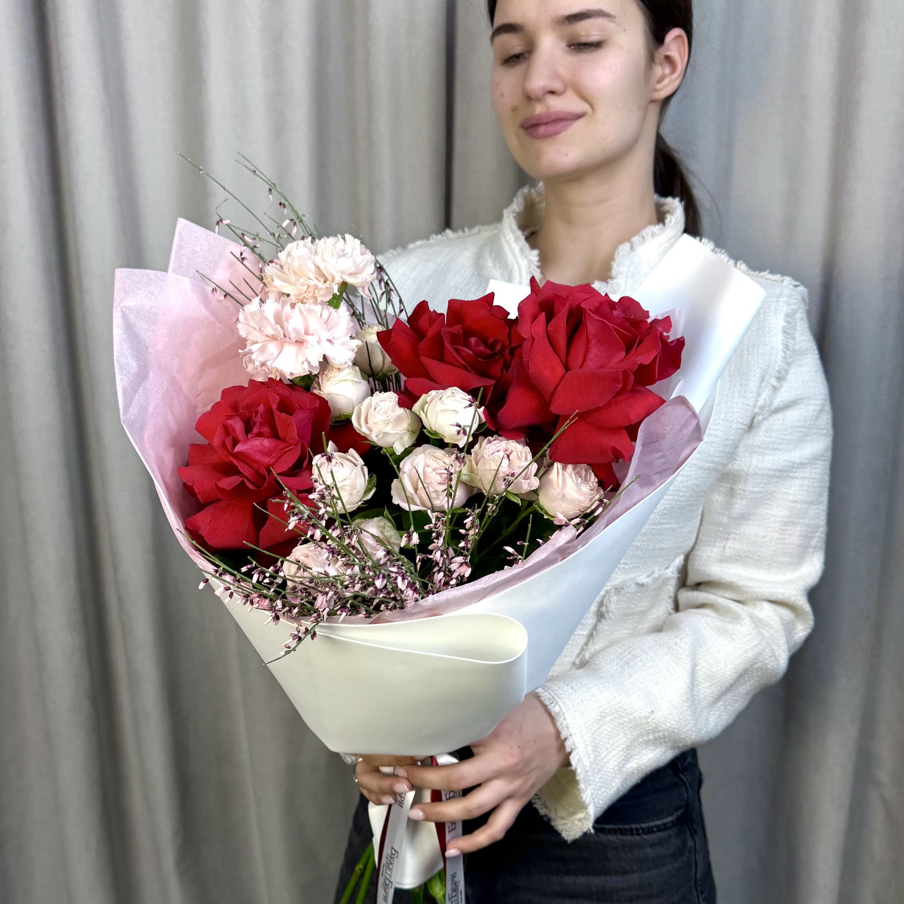 Сборный букет из французских и кустовых роз, ароматной генисты и диантуса в упаковке.