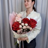 Букет будет доставлен в специальной транспортировочной коробке с подпиткой и открыткой в подарок.