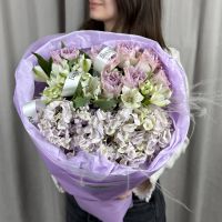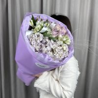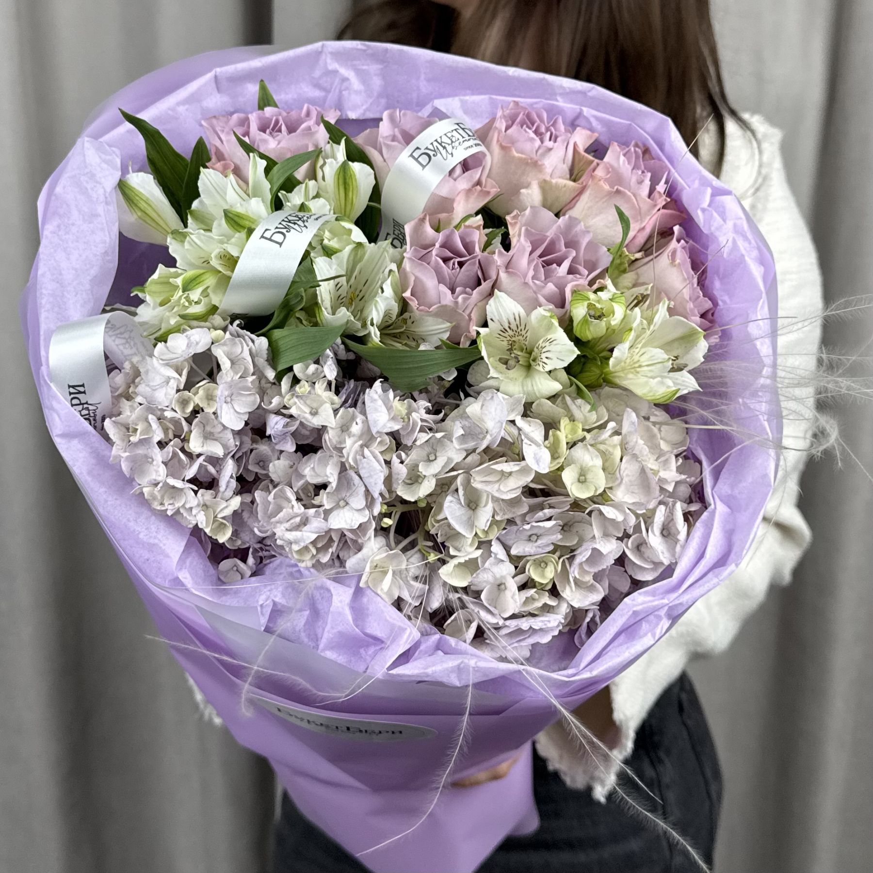 Милый сиреневый букет с 7 розочками, 2 гортензиями и 4 альстромериями в трендовой упаковке.