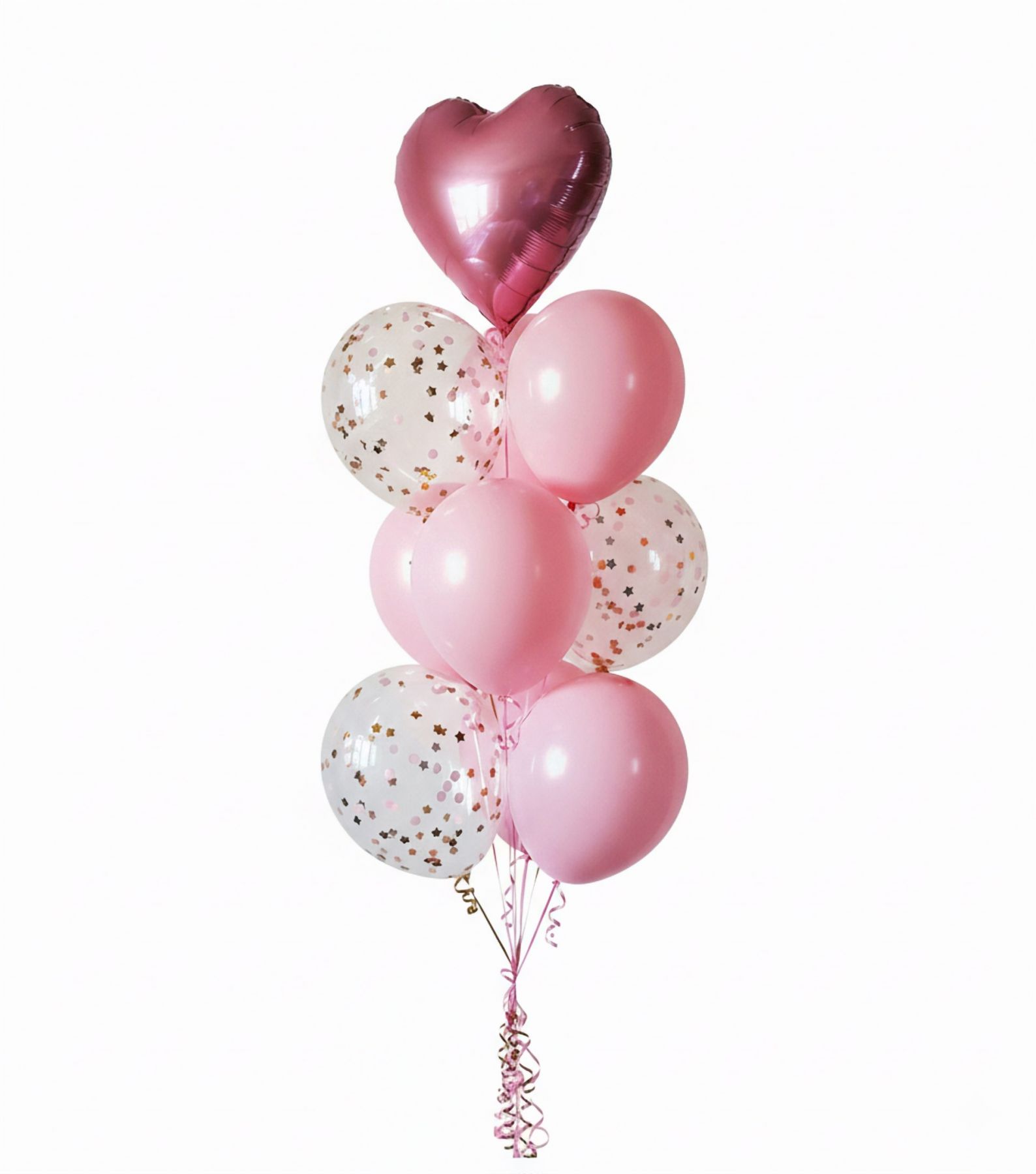В составе связки: 6 однтотонных шаров, 3 шара с конфетти и 1 фольгированное сердце