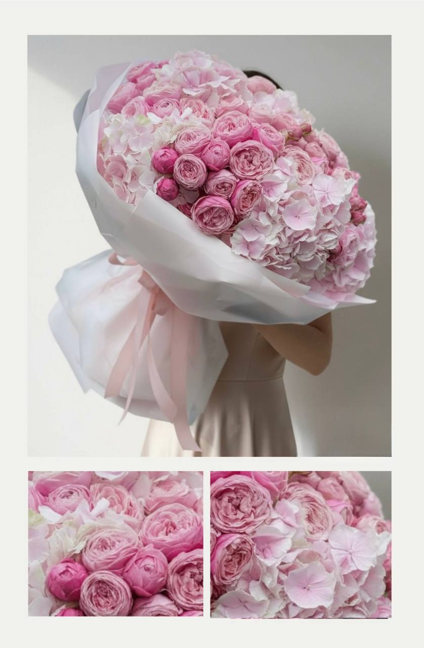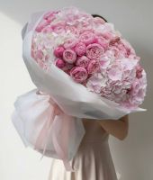 Большой букет из пионовидных кустовых роз и гортензий в красивой упаковке.