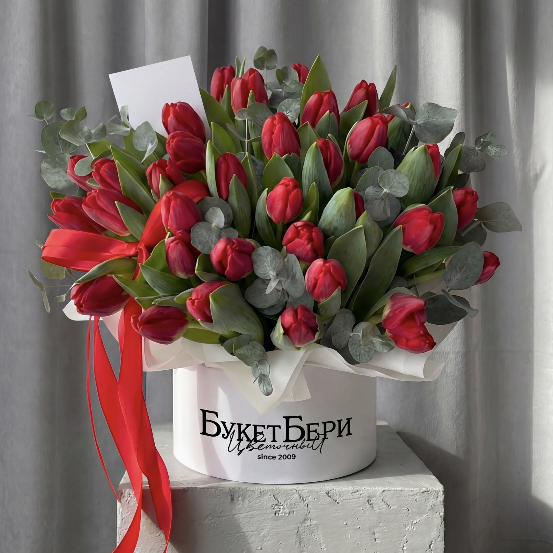Красивая композиция из красных свежих тюльпанов с ароматным эвкалиптом в шляпной коробке.