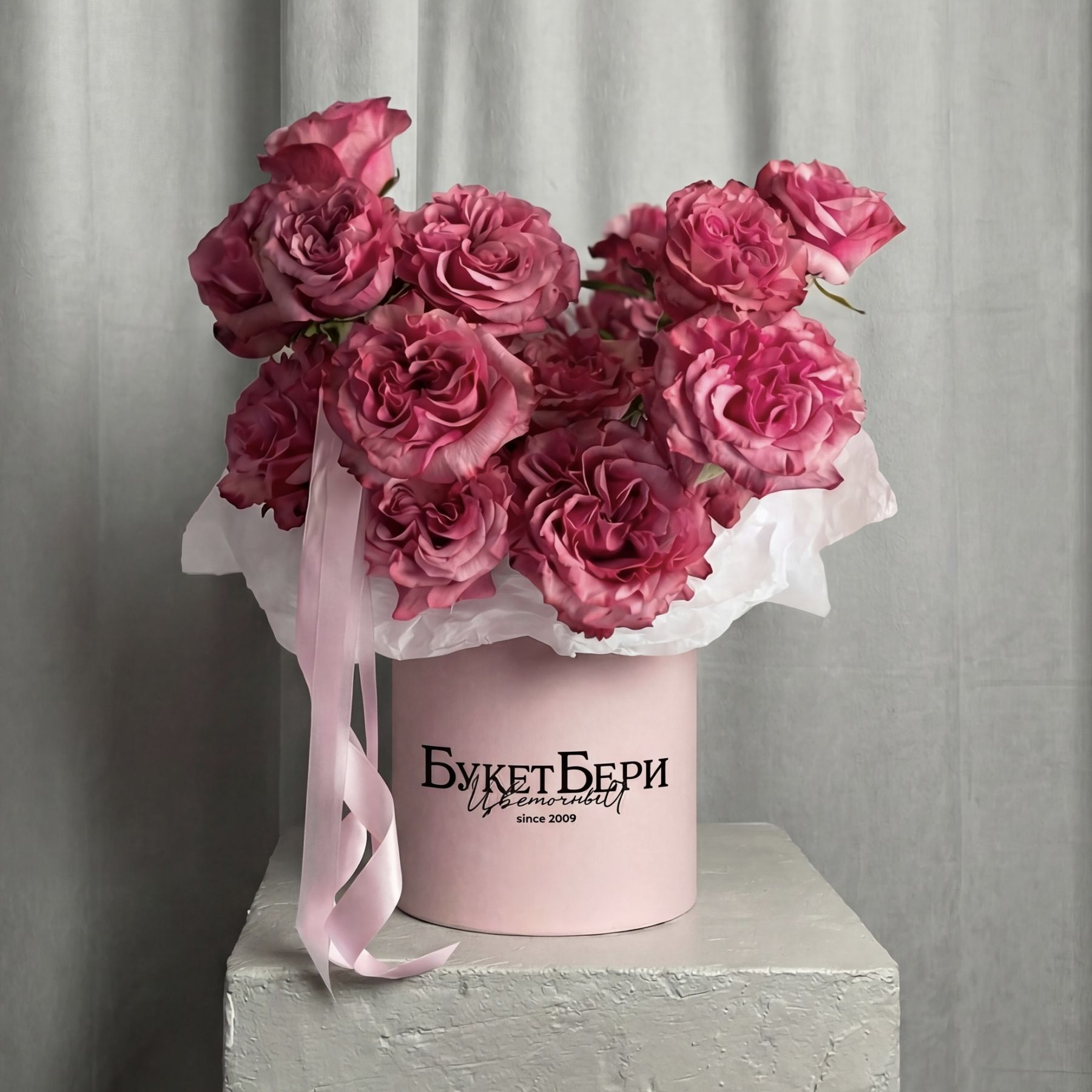 Красивая большая композиция из 17 стойких пионовидных французских розовых роз в нежной шляпной коробке в стильном исполнении.