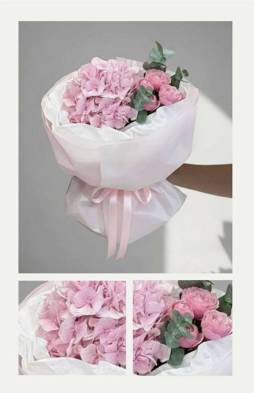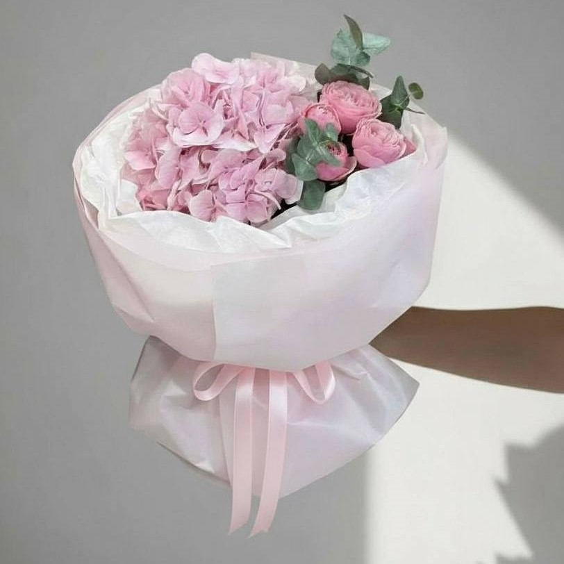 Сборный букет из гортензии и пионовидной кустовой розы в розовых тонах.