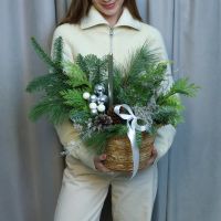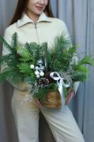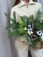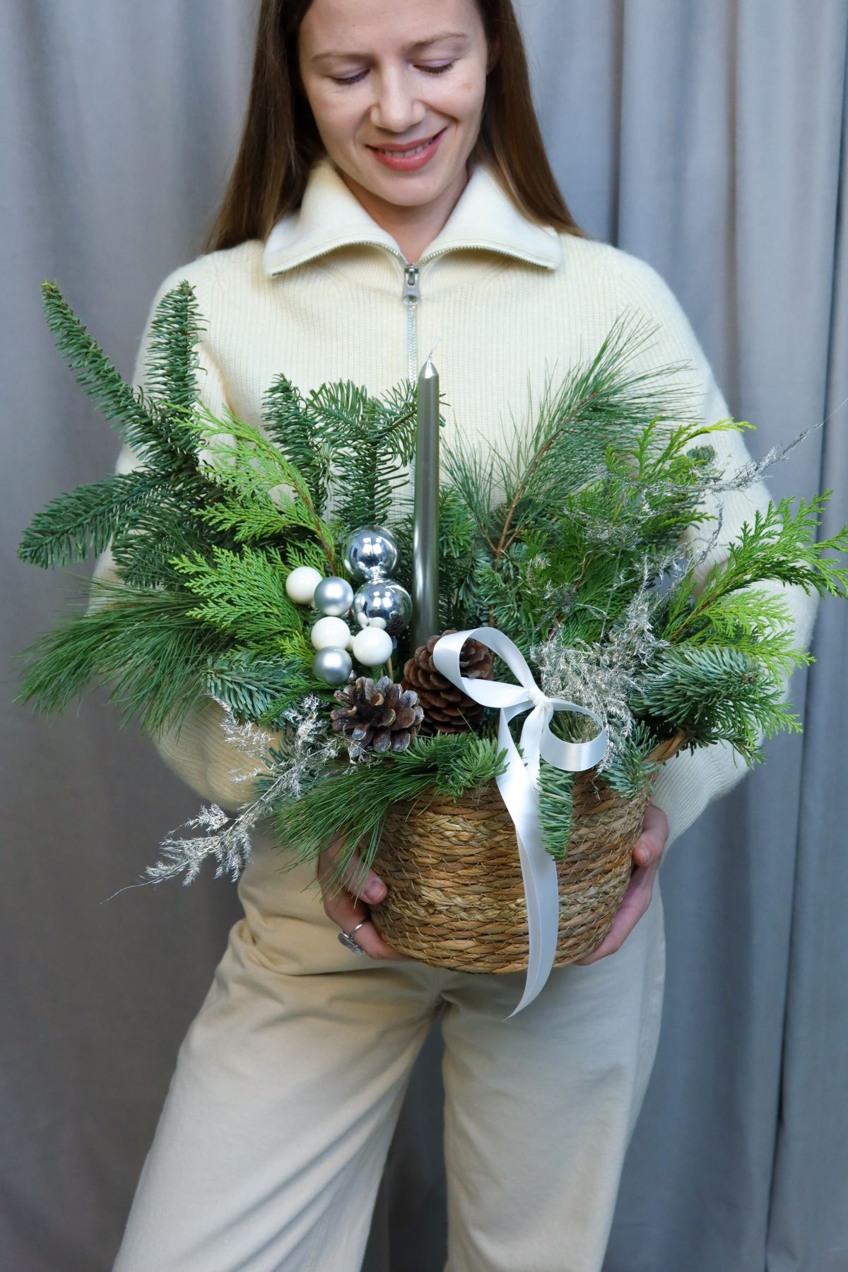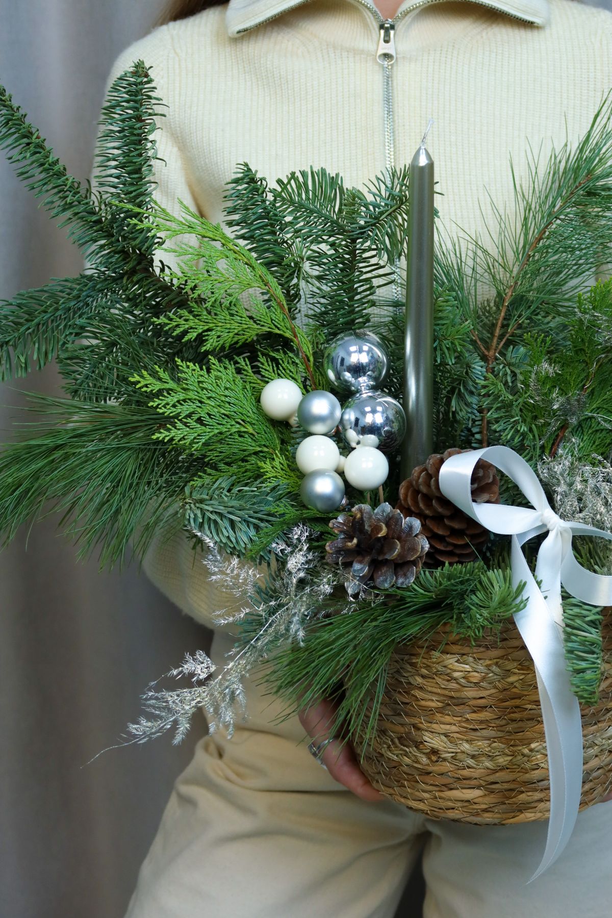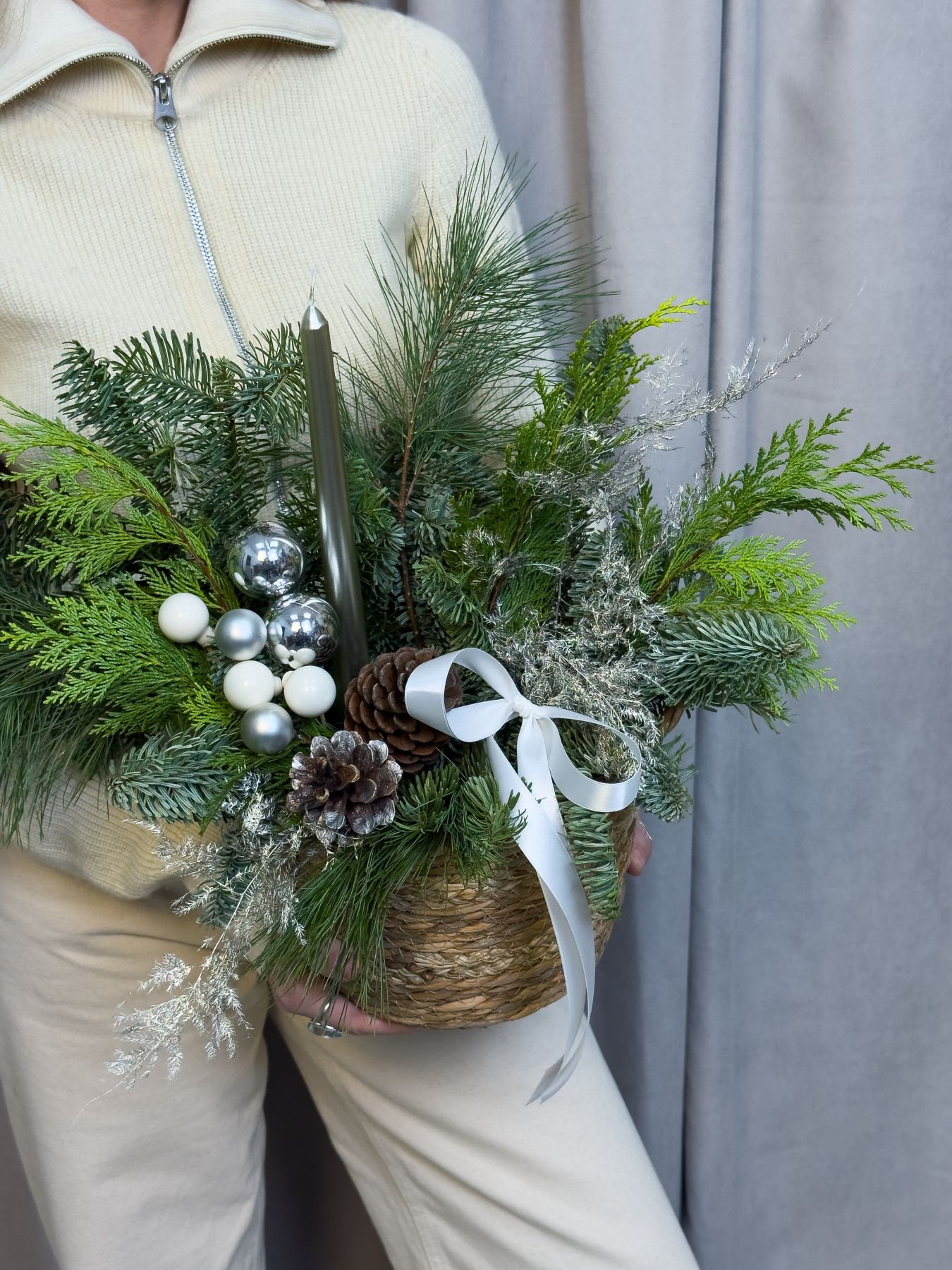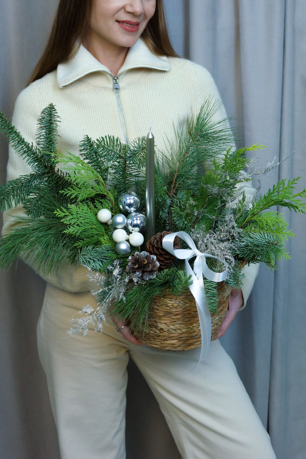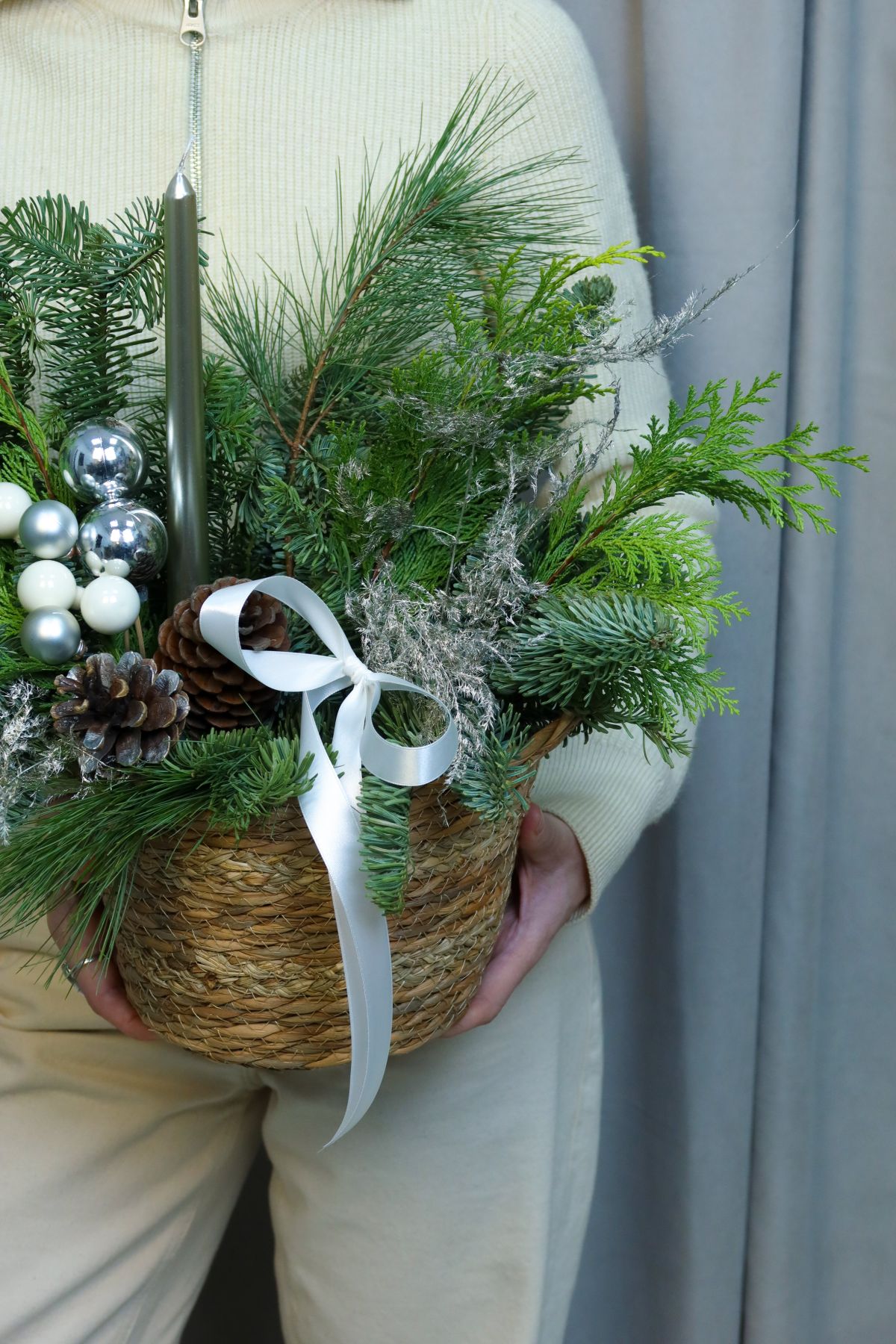 Композиция с натуральной хвойной зеленью, шишками и серебристыми шарами и аспарагусом. Стильная высокая свеча в центре и белый атласный бант делают декор идеальным для праздничного стола или в качестве подарка к Новому году.