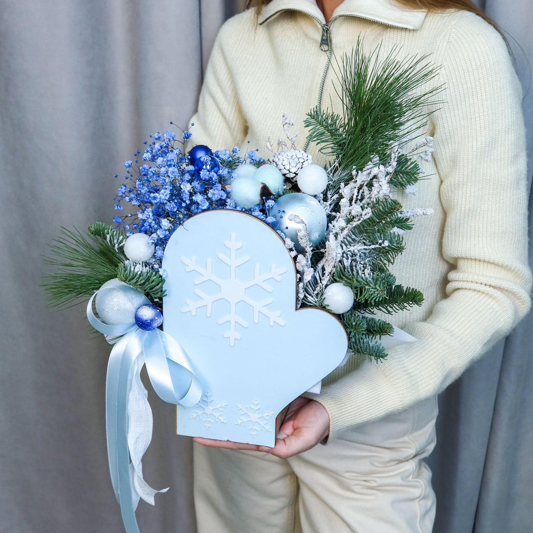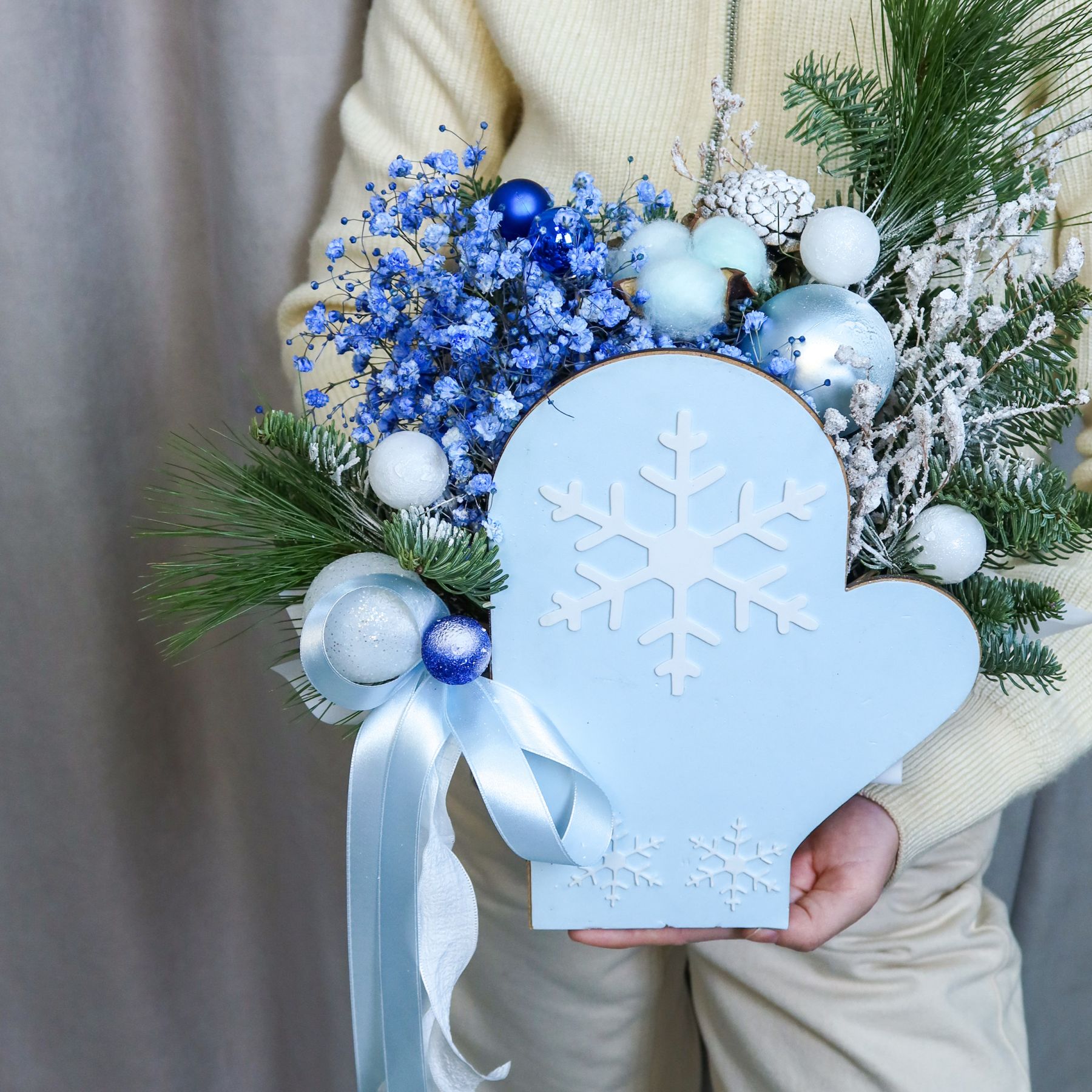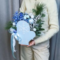 Нежная новогодняя композиция в коробке‑варежке небесно‑голубого цвета с декоративной снежинкой. Подойдёт в подарок на Новый год, Рождество или как уютный зимний декор дома.